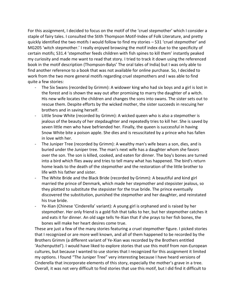 For this assignment, I decided to focus on the motif of the ‘cruel stepmother’ which I consider a staple of fairy tales. I consulted the Stith Thompson Motif-Index of Folk Literature, and pretty quickly identified the two motifs I would follow to find my stories – S31 ‘cruel stepmother’ and MG205 ‘witch stepmother.’ I really enjoyed browsing the motif index due to the specificity of certain motifs; S31.4 ‘stepmother feeds children with fish spines to kill them’ instantly peaked my curiosity and made me want to read that story. I tried to track it down using the referenced book in the motif description (Thompson-Balys’ The oral tales of India) but I was only able to find another reference to a book that was not available for online purchase. So, I decided to work from the two more general motifs regarding cruel stepmothers and I was able to find quite a few stories: - The Six Swans (recorded by Grimm): A widower king who had six boys and a girl is lost in the forest and is shown the way out after promising to marry the daughter of a witch. His new wife locates the children and changes the sons into swans. The sister sets out to rescue them. Despite efforts by the wicked mother, the sister succeeds in rescuing her brothers and in saving herself. - Little Snow White (recorded by Grimm): A wicked queen who is also a stepmother is jealous of the beauty of her stepdaughter and repeatedly tries to kill her. She is saved by seven little men who have befriended her. Finally, the queen is successful in having Snow White bite a poison apple. She dies and is resuscitated by a prince who has fallen in love with her. - The Juniper Tree (recorded by Grimm): A wealthy man's wife bears a son, dies, and is buried under the Juniper tree. The man's next wife has a daughter whom she favors over the son. The son is killed, cooked, and eaten for dinner. The boy's bones are turned into a bird which flies away and tries to tell many what has happened. The bird's return home leads to the death of the stepmother and the restoration of the little brother to life with his father and sister. - The White Bride and the Black Bride (recorded by Grimm): A beautiful and kind girl married the prince of Denmark, which made her stepmother and stepsister jealous, so they plotted to substitute the stepsister for the true bride. The prince eventually discovered the substitution, punished the stepmother and her daughter, and reinstated his true bride. - Ye-Xian (Chinese ‘Cinderella’ variant): A young girl is orphaned and is raised by her stepmother. Her only friend is a gold fish that talks to her, but her stepmother catches it and eats it for dinner. An old sage tells Ye-Xian that if she prays to her fish bones, the bones will make her heart desires come true. These are just a few of the many stories featuring a cruel stepmother figure. I picked stories that I recognized or are more well known, and all of them happened to be recorded by the Brothers Grimm (a different variant of Ye-Xian was recorded by the Brothers entitled ‘Aschenputtel’). I would have liked to explore stories that use this motif from non-European cultures, but because I wanted to use stories that I recognized for this assignment it limited my options. I found “The Juniper Tree” very interesting because I have heard versions of Cinderella that incorporate elements of this story, especially the mother’s grave in a tree. Overall, it was not very difficult to find stories that use this motif, but I did find it difficult to search and use the motif-index. I had more success with using Google to search for the motif identifiers and names. A storytelling session that featured this theme of a cruel stepmother would probably best be suited for older children, as regaling the abuse their step-children received from them back-to-back might be too much for younger children. These stories could be part of a spooky or Halloween storytelling series, or a villain archetypes exploration series for older children.