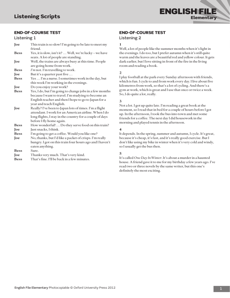 Listening Scripts ENGLISH FILE Elementary END-OF-COURSE TEST Listening 1 END-OF-COURSE TEST Listening 2 Joe 1 Well, a lot of people like the summer months when it’s light in the evenings. I do too, but I prefer autumn when it’s still quite warm and the leaves are a beautiful red and yellow colour. It gets dark earlier, but I love sitting in front of the fire in the living room and reading a book. Bess Joe Bess Joe Bess Joe Bess Joe Bess Joe Bess Joe Bess Joe Bess This train is so slow! I’m going to be late to meet my friend. Yes, it is slow, isn’t it? … Well, we’re lucky – we have seats. A lot of people are standing. Well, the trains are always busy at this time. People are going home from work. I’m not. I’m travelling to work. But it’s a quarter past five … Yes … I’m a nurse. I sometimes work in the day, but this week I’m working in the evenings. Do you enjoy your work? Yes, I do, but I’m going to change jobs in a few months because I want to travel. I’m studying to become an English teacher and then I hope to go to Japan for a year and teach English. Really? I’ve been to Japan lots of times. I’m a flight attendant. I work for an American airline. When I do long flights, I stay in the country for a couple of days before I fly home again. How wonderful! … Do they serve food on this train? Just snacks, I think. I’m going to get a coffee. Would you like one? No, thanks, but I’d like a packet of crisps. I’m really hungry. I got on this train four hours ago and I haven’t eaten anything. Sure. Thanks very much. That’s very kind. That’s fine. I’ll be back in a few minutes. English File Elementary Photocopiable © Oxford University Press 2012 2 I play football at the park every Sunday afternoon with friends, which is fun. I cycle to and from work every day. I live about five kilometres from work, so that’s a lot of cycling. And there’s a gym at work, which is great and I use that once or twice a week. So, I do quite a lot, really. 3 Not a lot. I got up quite late. I’m reading a great book at the moment, so I read that in bed for a couple of hours before I got up. In the afternoon, I took the bus into town and met some friends for a coffee. The next day I did housework in the morning and played tennis in the afternoon. 4 It depends. In the spring, summer and autumn, I cycle. It’s great, because it’s cheap, it’s fast, and it’s really good exercise. But I don’t like using my bike in winter when it’s very cold and windy, so I usually get the bus then. 5 It’s called One Day In Winter. It’s about a murder in a haunted house. A friend gave it to me for my birthday a few years ago. I’ve read two or three novels by the same writer, but this one’s definitely the most exciting. 1