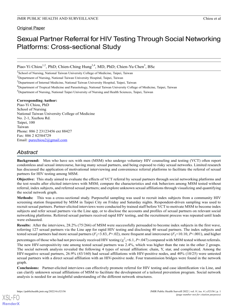 JMIR PUBLIC HEALTH AND SURVEILLANCE Chiou et al Original Paper Sexual Partner Referral for HIV Testing Through Social Networking Platforms: Cross-sectional Study Piao-Yi Chiou1,2, PhD; Chien-Ching Hung3,4, MD, PhD; Chien-Yu Chen5, BSc 1 School of Nursing, National Taiwan University College of Medicine, Taipei, Taiwan 2 Department of Nursing, National Taiwan University Hospital, Taipei, Taiwan 3 Department of Internal Medicine, National Taiwan University Hospital, Taipei, Taiwan 4 Department of Tropical Medicine and Parasitology, National Taiwan University College of Medicine, Taipei, Taiwan 5 Department of Nursing, National Taipei University of Nursing and Health Sciences, Taipei, Taiwan Corresponding Author: Piao-Yi Chiou, PhD School of Nursing National Taiwan University College of Medicine No. 2-1, Xuzhou Rd. Taipei, 100 Taiwan Phone: 886 2 23123456 ext 88427 Fax: 886 2 82584729 Email: purechiou2@gmail.com Abstract Background: Men who have sex with men (MSM) who undergo voluntary HIV counseling and testing (VCT) often report condomless anal sexual intercourse, having many sexual partners, and being exposed to risky sexual networks. Limited research has discussed the application of motivational interviewing and convenience referral platforms to facilitate the referral of sexual partners for HIV testing among MSM. Objective: This study aimed to evaluate the effects of VCT referral by sexual partners through social networking platforms and the test results after elicited interviews with MSM; compare the characteristics and risk behaviors among MSM tested without referral, index subjects, and referred sexual partners; and explore unknown sexual affiliations through visualizing and quantifying the social network graph. Methods: This was a cross-sectional study. Purposeful sampling was used to recruit index subjects from a community HIV screening station frequented by MSM in Taipei City on Friday and Saturday nights. Respondent-driven sampling was used to recruit sexual partners. Partner-elicited interviews were conducted by trained staff before VCT to motivate MSM to become index subjects and refer sexual partners via the Line app, or to disclose the accounts and profiles of sexual partners on relevant social networking platforms. Referred sexual partners received rapid HIV testing, and the recruitment process was repeated until leads were exhausted. Results: After the interviews, 28.2% (75/266) of MSM were successfully persuaded to become index subjects in the first wave, referring 127 sexual partners via the Line app for rapid HIV testing and disclosing 40 sexual partners. The index subjects and tested sexual partners had more sexual partners (F2=3.83, P=.02), more frequent anal intercourse (F2=10.10, P<.001), and higher percentages of those who had not previously received HIV testing (χ21=6.1, P=.047) compared with MSM tested without referrals. The new HIV-seropositivity rate among tested sexual partners was 2.4%, which was higher than the rate in the other 2 groups. The social network analysis revealed the following 4 types of sexual affiliation: chain, Y, star, and complicated. Among the HIV-negative sexual partners, 26.9% (43/160) had sexual affiliations with HIV-positive nodes, and 40% (10/25) were untested sexual partners with a direct sexual affiliation with an HIV-positive node. Four transmission bridges were found in the network graph. Conclusions: Partner-elicited interviews can effectively promote referral for HIV testing and case identification via Line, and can clarify unknown sexual affiliations of MSM to facilitate the development of a tailored prevention program. Social network analysis is needed for an insightful understanding of the different network structures. https://publichealth.jmir.org/2022/4/e32156 XSL• FO RenderX JMIR Public Health Surveill 2022 | vol. 8 | iss. 4 | e32156 | p. 1 (page number not for citation purposes) JMIR PUBLIC HEALTH AND SURVEILLANCE Chiou et al (JMIR Public Health Surveill 2022;8(4):e32156) doi: 10.2196/32156 KEYWORDS HIV testing; men who have sex with men; mobile health; motivational interviewing; referral and consultation; risk behavior; sexual partners; social networking Introduction Background Voluntary counseling and testing (VCT) for HIV, a process aimed at enabling an individual to make an informed choice regarding HIV testing, and condom use are key strategies for achieving the World Health Organization’s goal of 95% of all persons with HIV being aware of their status and being successfully treated by 2025, which is ultimately aimed at eliminating HIV by 2030 [1,2]. In 2019, it was estimated that 81% of people with HIV worldwide and 88% in Taiwan knew their infection status [3,4]. In addition to the current VCT model, a proactive approach should be applied to reach and test those who have not yet been diagnosed. HIV could have been primarily transmitted through condomless sex in a social network characterized by similar and related risk behaviors [5,6]. Men who have sex with men (MSM) and who undergo VCT often report condomless anal sexual intercourse and having multiple sexual partners [7,8]. They comprise the main at-risk group for HIV transmission globally [9]. The active provision of VCT to the sexual partners of MSM who have been screened for HIV could promote the identification of HIV cases and the obstruction of transmission chains [10]. The referral of sexual partners is a delicate and private matter, and is difficult to compare against social network referral relating to nonsexual relationships [11,12]. There is a need for guiding frameworks for motivational interviewing on sensitive matters, including for sexual partners [13], and limited research has been conducted in this regard. Motivational interviewing is based on the theory of helpfulness and disclosure, which emphasizes that self-disclosure and helping others could be conducive to interviewees being willing to share intimate topics like sexual relationships [14].