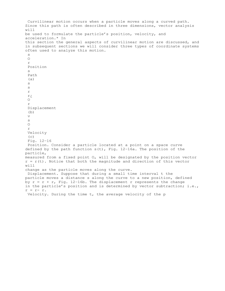 Curvilinear motion occurs when a particle moves along a curved path. Since this path is often described in three dimensions, vector analysis will be used to formulate the particle’s position, velocity, and acceleration.* In this section the general aspects of curvilinear motion are discussed, and in subsequent sections we will consider three types of coordinate systems often used to analyze this motion. s O r Position s Path (a) s s r r¿ O r Displacement (b) v s O r Velocity (c) Fig. 12–16 Position. Consider a particle located at a point on a space curve defined by the path function s(t), Fig. 12–16a. The position of the particle, measured from a fixed point O, will be designated by the position vector r = r(t). Notice that both the magnitude and direction of this vector will change as the particle moves along the curve. Displacement. Suppose that during a small time interval t the particle moves a distance s along the curve to a new position, defined by r = r + r, Fig. 12–16b. The displacement r represents the change in the particle’s position and is determined by vector subtraction; i.e., r = r- r. Velocity. During the time t, the average velocity of the p