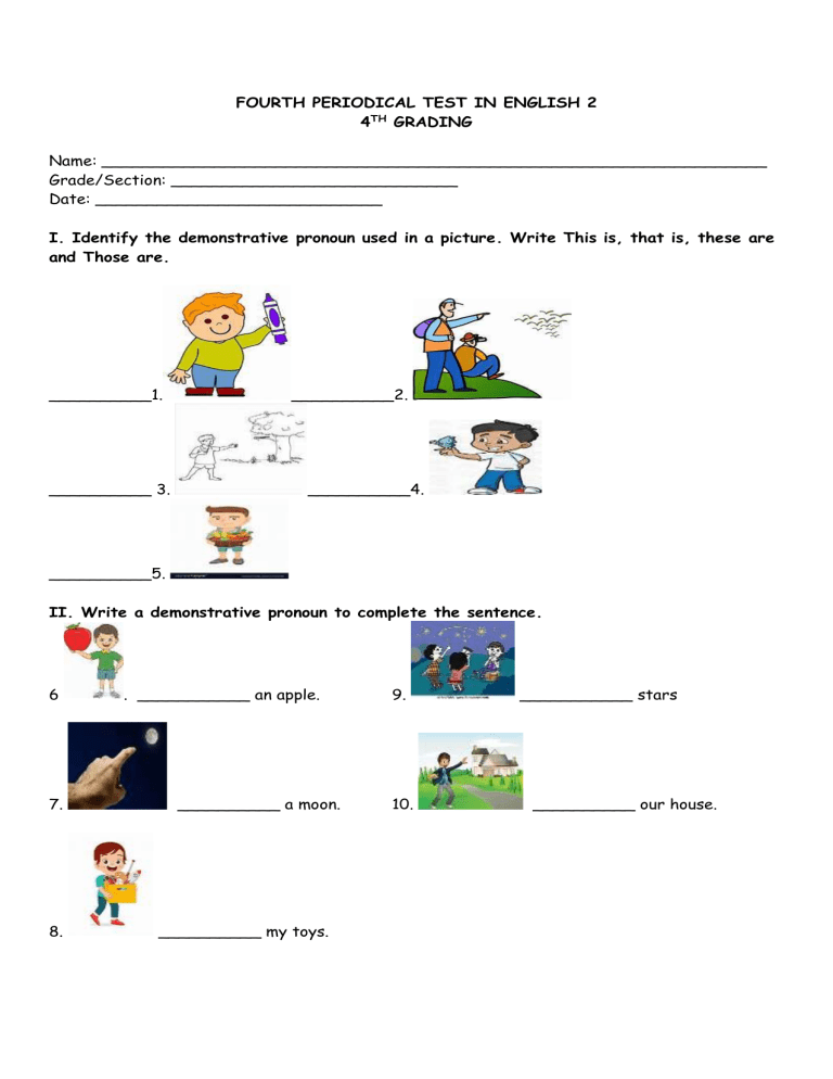 FOURTH PERIODICAL TEST IN ENGLISH 2 4TH GRADING Name: _________________________________________________________________ Grade/Section: ____________________________ Date: ____________________________ I. Identify the demonstrative pronoun used in a picture. Write This is, that is, these are and Those are. __________1. __________ 3. __________2. __________4. __________5. II. Write a demonstrative pronoun to complete the sentence. 6 7. 8. . ___________ an apple. __________ a moon. __________ my toys. 9. 10. ___________ stars __________ our house. III. Choose and underlined the correct preposition inside the parenthesis to complete the sentence. 11. The guitar is (over, behind, beside, in) the girl. 12. The flowers are (in, on, under, beside) the vase. 13. The boy is hiding (under, behind, on, beside) the curtains. 14. The rat came (in, over, out of, on) the box. 15. Yuan is (under, in front of, behind, on) the computer. IV. Write the correct preposition to complete the sentence. ( on, in under, over ) 16. Left-over foods are usually placed _________________ the refrigerator. 17. We place our food _________________ on the table. 18. The eagle flew _________________the high tree in our backyard. 19. Carlo parked his bicycle _________________the school, near his classroom. 20. Nicole hung the wet clothes _________________ the heat of the sun to get dry.