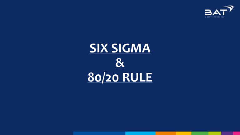 SIX SIGMA & 80/20 RULE SIX SIGMA: Six Sigma is a data-driven management methodology focused on improving process quality and efficiency by identifying and eliminating defects. The goal is to reduce variation and achieve no more than 3.4 defects per million opportunities, which corresponds to 99.99966% accuracy. 80/20 Rule: The 80/20 rule means 80% of results come from 20% of the effort or causes. It's also called the Pareto Principle. EXAMPLE: 20% of customers bring 80% of the sales. SIX SIGMA: Company • Source • Engro Corporation Improve product quality, reduce defects, and optimize manufacturing processes Engro Six Sigma Launch (LinkedIn) • Unilever Pakistan Enhance production efficiency, reduce process variation, and improve supply chain operations Unilever Six Sigma Training (ICBMS Panel) • Unilever Clients List (6sigma.us) Lucky Core Industries Eliminate waste, reduce process inefficiencies, and increase operational savings LSS Program Launch - Official PDF Pakistan Tobacco Company (PTC) Maintain high manufacturing standards, reduce defects, and ensure global quality compliance PTC Green Belt Mention (Scribd Report) Fauji Fertilizer Company (FFC) Drive operational excellence, improve process control, and train leadership in Six Sigma FFC Six Sigma Training (LinkedIn) • • Purpose of Using Six Sigma 80/20 Rule OR Pareto Principle: EXAMPLE : • In sales, companies often find that 20% of their products generate 80% of their profits. So instead of promoting every product equally, they focus on the top-selling 20% — saving time, money, and boosting growth. • In school or exams, 20% of the topics often cover 80% of the paper. So students who focus on those key topics usually perform much better with less effort — proving the power of the 80/20