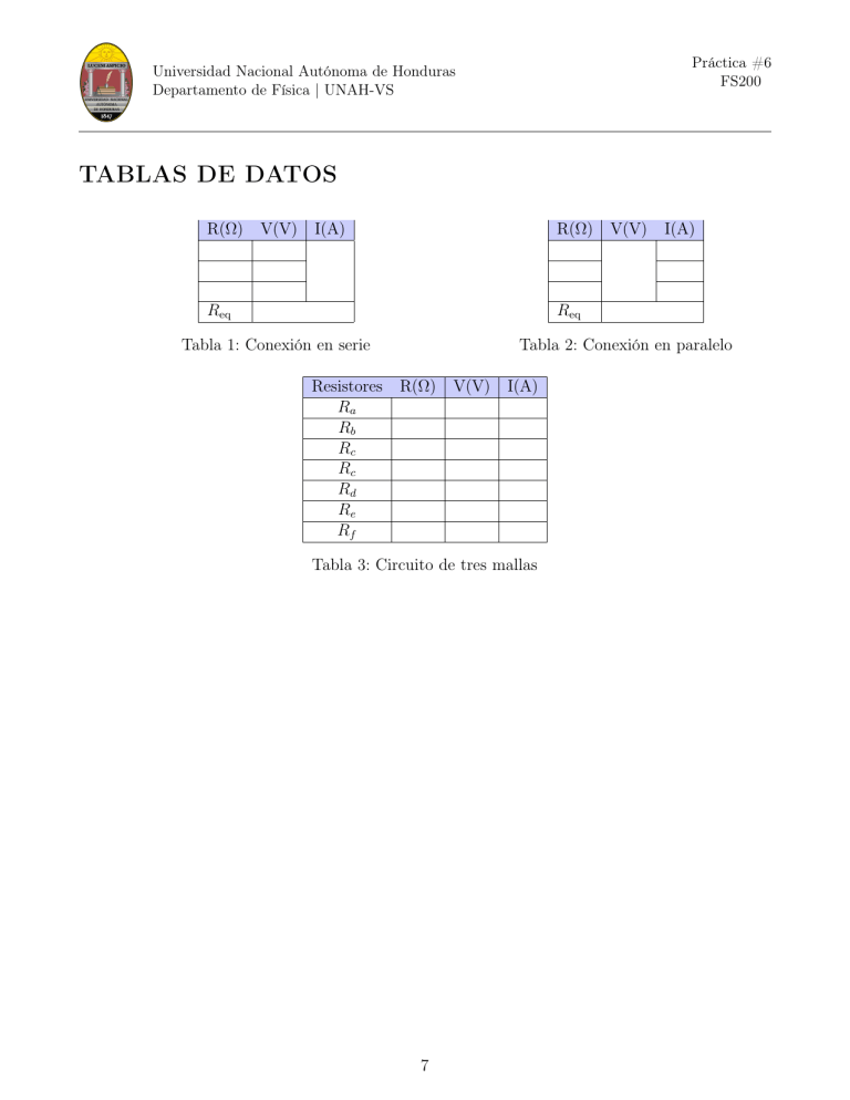 Práctica #6 FS200 Universidad Nacional Autónoma de Honduras Departamento de Física | UNAH-VS TABLAS DE DATOS R(Ω) V(V) I(A) R(Ω) Req V(V) I(A) Req Tabla 1: Conexión en serie Resistores Ra Rb Rc Rc Rd Re Rf Tabla 2: Conexión en paralelo R(Ω) V(V) I(A) Tabla 3: Circuito de tres mallas 7 Universidad Nacional Autónoma de Honduras Departamento de Física | UNAH-VS Práctica #6 FS200 CÁLCULOS Resistores en Serie 1. Calcule la resistencia equivalente de forma teórica aplicando la ecuación 1 y utilizando los valores de resistencia obtenidos por código de color, para la conexión en serie. Req = Ω 2. Calcule la corriente total en este circuito de forma teórica aplicando la Ley de Ohm. A itotal = 3. Calcule los voltajes en cada resistor. V1 = V V2 = V V3 = V 8 Universidad Nacional Autónoma de Honduras Departamento de Física | UNAH-VS Práctica #6 FS200 4. Calcule el error porcentual entre los valores experimentales y los obtenidos a partir de las ecuaciones, para Req , V1 , V2 , V3 y itotal . EReq = % Eitotal = % EV1 = % EV2 = % EV3 = % Resistores en Paralelo 5. Calcule la resistencia equivalente de forma teórica aplicando la ecuación 2 y utilizando los valores de resistencia obtenidos por código de color, para la conexión en serie. Req = Ω 6. Calcule las corrientes en cada resistor. i1 = A i2 = A i3 = A 9 Universidad Nacional Autónoma de Honduras Departamento de Física | UNAH-VS Práctica #6 FS200 7. Calcule el error porcentual entre los valores experimentales y los obtenidos a partir de las ecuaciones, para Req , i1 , i2 , i3 . EReq = % Ei1 = % Ei2 = % Ei3 = % Leyes de Kirchhoff 8. Usar los datos de voltajes de la Tabla 3 y el voltaje de la fuente para comprobar la ley de voltajes de Kirchhoff en las tres mallas del circuito. 9. Comprobar la Ley de corrientes de Kirchhoff para el nodo b haciendo uso de los datos de corrientes medidas. 10 Universidad Nacional Autónoma de Honduras Departamento de Física | UNAH-VS Práctica #6 FS200 10. Calcule las corrientes teóricas en el circuito, aplicando las Leyes de Kirchhoff en nodos y mallas y la convención de signos. Muestre todos sus procedimiento y cálculos. I1 = A I2 = A I3 = A I4 = A I5 = A 11 Universidad Nacional Autónoma de Honduras Departamento de Física | UNAH-VS Práctica #6 FS200 11. Calcular el error porcentual para las corrientes en el circuito, comparando las obtenidas de forma experimental y las calculadas de forma teórica en el inciso anterior. 12. Reduzca el circuito a un solo resistor con la fuente y calcule la corriente final. 12 Universidad Nacional Autónoma de Honduras Departamento de Física | UNAH-VS Práctica #6 FS200 ANÁLISIS DE RESULTADOS 1. ¿Se cumple la Ley de Conservación de la Carga en cada nodo? ¿En qué nodo se encuentra la mayor diferencia? ¿A qué cree que se deba? 2. ¿Qué diferencias se encontraron entre las corrientes calculadas mediante las Leyes de Kirchhoff y las medidas con el multímetro? ¿Qué factores experimentales (resistencias internas, conexiones, errores de medición) podrían explicar estas diferencias? 3. Al aumentar el valor de una de las resistencias, ¿cómo se afecta la distribución de las corrientes en el circuito? Explique con base en la Ley de Mallas y la Ley de Nodos qué sucede y por qué. 13