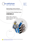 Operating instructions for responsible bodies and persons using the machine Enclosed Orbital Welding Heads ORBIWELD OW 65, OW 115, OW 170 OW 38S, OW 76S, OW 115S OW 12, OW 19 Machine no.: To work safely with this machine, please read through the operating instructions in full before initial operation. Retain the operating instructions for future reference. ORBIWELD | Operating instructions TABLE OF CONTENTS 1. 2. INFORMATION AND SAFET Y INSTRUCTIONS FOR THE RESPONSIBLE BODY .......................................................5 2.1 Requirements for the responsible body.......5 2.2 Using the machine .....................................5 2.2.1 Proper use .......................................5 2.2.2 Improper use ...................................5 2.2.3 Machine constraints.........................5 2.3 Environmental protection/disposal .............6 2.3.1 Electric tools and accessories...........6 2.4 Basic safety instructions ............................6 3. 2 | 3.5.13 Plastic case for clamping shells ......16 3.5.14 Cavity shells for moldings (2 shells) 16 3.5.15 Extension cable assembly ..............17 3.5.16 Shells for arc welding .....................17 3.5.17 Electrode adapters .........................18 ABOUT THIS INSTRUCTIONS..................................4 1.1 Warning messages .....................................4 1.2 Abbreviations ............................................4 Product design...................................................10 3.1 ORBIWELD 65 - 170 ..................................10 3.1.1 Front view ......................................10 3.1.2 Welding head view .........................10 3.2 ORBIWELD 38S, 76S .................................10 3.2.1 Front view ......................................10 3.2.2 Welding head view .........................11 3.3 ORBIWELD 115S, 170S .............................11 3.3.1 Front view ......................................11 3.3.2 Welding head view .........................11 3.4 ORBIWELD 12, 19 .....................................12 3.4.1 OW 12 - front view ..........................12 3.4.2 OW 12 - clamping cartridge ............12 3.4.3 OW 19 - front view ..........................12 3.5 Accessories .............................................12 3.5.1 Exchangeable clamping cartridges for OW 12 ...........................................13 3.5.2 Clamping shells for OW 12 (clamping cartridge, version B) .......................13 3.5.3 Clamping shell for OW 19 ...............13 3.5.4 Clamping shells for OW 38S, OW 76S, OW 115S, OW 170S ........................13 3.5.5 Special clamping shells for orbital welding heads ...............................14 3.5.6 Plastic case for clamping shells ......14 3.5.7 Cavity shell for moldings (2 shells) .14 3.5.8 Special clamping shell ...................14 3.5.9 Shells for arc welding .....................15 3.5.10 Electrode adapters .........................15 3.5.11 Clamping shells for OW 65, OW 115, OW 170..........................................16 3.5.12 Special clamping shells for orbital welding heads ...............................16 4. Features and Scope of Application ......................19 4.1 ORBIWELD 12...........................................19 4.2 ORBIWELD 19...........................................19 4.3 ORBIWELD 38S, 76S, 115S, 170S ..............19 4.4 ORBIWELD 65, 115, 170 ............................20 5. Technical Data....................................................21 5.1 Technial Data ...........................................21 5.2 Storage of the System ..............................21 5.3 Electrodes ...............................................22 5.4 Generated Noise Level..............................22 6. Operational Elements and Functions ...................23 6.1 Keys ........................................................23 6.1.1 LED-Indicator .................................23 6.1.2 <START/STOP> ................................23 6.1.3 <GAS/TEST> ....................................23 6.1.4 <END/ 0-POS> .................................23 6.1.5 <MOTOR>........................................23 6.2 Handle .....................................................23 6.3 Rotor .......................................................24 6.4 Top-Clamp-Side .......................................24 6.4.1 Adjustment of the Clamp-Latches ...24 6.5 Collets .....................................................24 6.5.1 Spring Plungers .............................24 6.6 Electrical Ground Connection ...................25 6.7 Electrodes ...............................................25 6.7.1 Electrode Set Screw .......................25 6.7.2 Electrode Length ............................25 6.7.3 Adjustment of Arc length ................25 6.7.4 Electrode Change ...........................25 7. Initial Operation and Operation Sequence...........26 7.1 Checking the parts of delivery ..................26 7.2 Included with the machine (subject to change without notice) .............................26 7.3 Preparations ............................................26 7.4 Attaching the Welding Head .....................26 Setting-Up the System for Operation ........27 7.5 7.6 Welding ...................................................27 7.7 Interrupt Welding .....................................27 7.8 Remove Welding Head ..............................27 orbitalum tools GmbH, D-78224 Singen, www.orbitalum.com, Tel. +49 (0) 77 31 792-0 (11.2011) OM_BA_ORBIWELD_821.060.202.01_EN ORBIWELD | Operating instructions 8. Service and Maintenance ...................................29 9. TroubleShooting ................................................30 10. EU Declaration of Conformity ....................31 10.1 ORBIWELD 65 | 115 | 170 | 38S | 76S | 115S | 170S | 12 | 19 ...........................................31 All rights reserved, in particular the rights of duplication and distribution as well as translation. Duplication and reproduction in any form (print, 