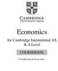 Economics for Cambridge International AS & A Level COURSEBOOK Colin Bamford & Susan Grant Contents How to use this series How to use this book Introduction Introduction to command words Getting started with Cambridge International AS & A Level Economics 1 Basic economic ideas and resource allocation (AS Level) 1 Scarcity, choice and opportunity cost 2 Economic methodology 3 Factors of production 4 Resource allocation in different economic systems 5 Production possibility curves 6 Classification of goods and services End-of-unit exam-style questions 2 The price system and the microeconomy (AS Level) 7 Demand and supply curves 8 Price elasticity, income elasticity and cross elasticity of demand 9 Price elasticity of supply 10 The interaction of demand and supply 11 Consumer and producer surplus End-of-unit exam-style questions 3 Government microeconomic intervention (AS Level) 12 Reasons for government intervention in markets 13 Methods and effects of government intervention in markets 14 Addressing income and wealth inequality End-of-unit exam-style questions 4 The macroeconomy (AS Level) 15 National income statistics 16 Introduction to the circular flow of income 17 Aggregate demand and aggregate supply analysis 18 Economic growth 19 Unemployment 20 Price stability End-of-unit exam-style questions 5 Government macroeconomic intervention (AS Level) 21 Government macroeconomic policy objectives 22 Fiscal policy 23 Monetary policy 24 Supply-side policy End-of-unit exam-style questions 6 International economic issues (AS Level) 25 The reasons for international trade 26 Protectionism 27 Current account of the balance of payments 28 Exchange rates 29 Policies to correct imbalances in the current account of the balance of payments End-of-unit exam-style questions 7 The price system and the microeconomy (A Level) 30 Utility 31 Indifference curves and budget lines 32 Efficiency and market failure 33 Private costs and benefits, externalities and social costs and benefits 34 Types of cost, revenue and profit, short-run and longrun production 35 Different market structures 36 Growth and survival of firms 37 Differing objectives and policies of firms End-of-unit exam-style questions 8 Government microeconomic intervention (A Level) 38 Government policies to achieve efficient resource allocation and correct market failure 39 Equity and redistribution of income and wealth 40 Labour market forces and government intervention End-of-unit exam-style questions 9 The macroeconomy (A Level) 41 The circular flow of income 42 Economic growth and sustainability 43 Employment and unemployment 44 Money and banking End-of-unit exam-style questions 10 Government macroeconomic intervention (A Level) 45 Government macroeconomic policy objectives 46 Links between macroeconomic problems and their interrelatedness 47 Effectiveness of policy options to meet all macroeconomic objectives End-of-unit exam-style questions 11 International economic issues (A Level) 48 Policies to correct disequilibrium in the balance of payments 49 Exchange rates 50 Economic development 51 Characteristics of countries at different levels of development 52 Relationship between countries at different levels of development 53 Globalisation End-of-unit exam-style questions 54 Preparing for assessment Appendix: Key formulae Acknowledgements Copyright How to use this series How to use this book Throughout this coursebook, you will notice recurring features that are designed to help your learning. Here is a brief overview of what you will find. LEARNING INTENTIONS Learning intentions open each chapter. They help with navigation through the coursebook and indicate the important concepts in each topic. ECONOMICS IN CONTEXT Economics in context introduces you to the content in a chapter. These place some of the key ideas contained in the chapter into a real-world economics context. They raise important issues for discussion, with questions that allow you to look in more detail at the topic. KEY TERMS Key vocabulary and formulae are highlighted in the text when they are first introduced. An accompanying definition explains the meanings of these words and phrases. You will also find definitions of these words in the glossary at the back of this book. There is also a separate appendix for all key formulae. TIPS Tips are provided throughout this coursebook to help with your learning. The tips might cover how to avoid common errors or misconceptions, advice on essay-writing, evaluation and analysis, or guidance on how answers are arrived at. KEY CONCEPT LINKS These links explain how the coursebook’s topics are integrated with the key concepts in the Cambridge International AS & A Level Economics syllabus. ACTIVITY There are various activities throughout this coursebook. These include short case studies with evaluative or analytic questions, as well as opportunities to produce your own work either individually, in pairs or in groups. REFLECTION Reflection questions direct you to look back on an activity and encourage you to think about your learning. You will reflect on and assess the process that you used to arrive at your answers. THINK LIKE AN ECONOMIST Think like an economist provides you with an opportunity to apply economic principles to current events in various international settings. You will look at your life through an economics lens, and also apply your analysis skills and use evidence to look at the world of work. Designed to encourage group discussion, the short case studies and accompanying questions will help you to make connections between employment and studying economics. SELF-EVALUATION CHECKLIST At the end of each chapter, you will find a series of statements outlining the content that you should now understand. You might find it helpful to rate how confident you are for each of these statements when you are revising. You should revisit any topics that you rated ‘Needs more work’ or ‘Almost there’. EXAM-STYLE QUESTIONS Each chap