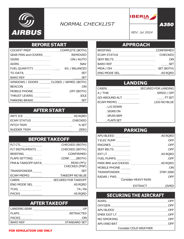 NORMAL CHECKLIST A350 REV: Jul 2024 BEFORE START COCKPIT PREP APPROACH COMPLETE (BOTH) BRIEFING CONFIRMED GEAR PINS and COVERS REMOVED ECAM STATUS SIGNS ON / AUTO SEAT BELTS ON ADIRS NAV BARO REF SET KG. / BALANCED MDA / DH SET (BOTH) FUEL QUANTITY TO DATA SET BARO REF SET WINDOWS / DOORS CHECKED ENG MODE SEL AS RQRD LANDING CLOSED / ARMED (BOTH) BEACON ON MOBILE PHONE OFF (BOTH) THRUST LEVERS IDLE PARKING BRAKE SET CABIN SECURED FOR LANDING A / THR SPEED / OFF GO-AROUND ALT FT SET ECAM MEMO LDG NO BLUE . L/G DOWN AFTER START . SIGNS ON ANTI ICE AS RQRD . SPLRS ARM ECAM STATUS CHECKED . FLAPS SET PITCH TRIM % SET RUDDER TRIM ZERO BEFORE TAKEOFF PARKING APU BLEED AS RQRD Y ELEC PUMP OFF FLT CTL CHECKED (BOTH) ENGINES OFF FLT INSTRUMENTS CHECKED (BOTH) SEAT BELTS OFF BRIEFING CONFIRMED FLAPS SETTING FMA & TAKEOFF DATA CONF READ (PF)/ CHECKED (PNF) TRANSPONDER ECAM MEMO (BOTH) SET TAKEOFF NO BLUE CABIN SECURED FOR TAKEOFF ENG MODE SEL TA / RA PACKS AS RQRD AFTER TAKEOFF UP FLAPS RETRACTED PACKS ON BARO REF FOR SIMULATION USE ONLY AS RQRD FUEL PUMPS STANDARD SET OFF PARK BRK and CHOCKS AS RQRD MOBILE PHONE ON TRANSPONDER STBY 2000 RADAR / PWS AS RQRD TCAS LANDING GEAR EXT LT Consideer HEAVY RAIN EXTRACT OFF OVRD SECURING THE AIRCRAFT ADIRS OFF OXYGEN OFF APU BLEED OFF EMER EXIT LT OFF NO SMOKING OFF APU AND BAT OFF Consider COLD WEATHER