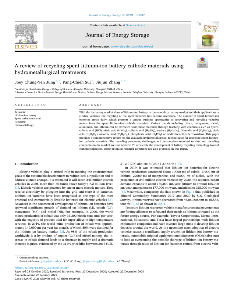Journal of Energy Storage 35 (2021) 102217 Contents lists available at ScienceDirect Journal of Energy Storage journal homepage: www.elsevier.com/locate/est A review of recycling spent lithium-ion battery cathode materials using hydrometallurgical treatments Joey Chung-Yen Jung a, *, Pang-Chieh Sui b, Jiujun Zhang a, * a b Institute for Sustainable Energy / College of Sciences, Shanghai University, Shanghai 200444, China Research Center for Electrochemical Energy Materials and Devices, Sichuan Energy Internet Research Institute, Tsinghua University, Chengdu, Sichuan 610213, China A R T I C L E I N F O A B S T R A C T Keywords: Lithium-ion battery Spent cathode material Recycling Hydrometallurgy With the increasing market share of lithium-ion battery in the secondary battery market and their applications in electric vehicles, the recycling of the spent batteries has become necessary. The number of spent lithium-ion batteries grows daily, which presents a unique business opportunity of recovering and recycling valuable metals from the spent lithium-ion cathode materials. Various metals including cobalt, manganese, nickel, aluminum, and lithium can be extracted from these materials through leaching with chemicals such as hydro­ chloric acid (HCl), nitric acid (HNO3 ), sulfuric acid (H2 SO4 ), oxalate (H2 C2 O2 ), DL-malic acid (C4 H5 O6 ), citric acid (C6 H8 O7 ), ascorbic acid (C6 H8 O6 ), phosphoric acid (H3 PO4 ) or acidithiobacillus ferrooxidans. This paper provides a comprehensive review on the available hydrometallurgical technologies for recycling spent lithiumion cathode materials. The recycling processes, challenges and perspectives reported to date and recycling companies in the market are summarized. To accelerate the development of battery recycling technology toward commercialization, some potential research directions are also proposed in this paper. 1. Introduction Electric vehicles play a critical role in meeting the environmental goals of the sustainable development to reduce local air pollution and to address climate change. It is estimated it will reach 245 million electric vehicles in 2030, more than 30 times above today’s 7.2 million level. [1]. Electric vehicles are powered by one or more electric motors. They receive electricity by plugging into the grid and store it in batteries. Lithium-ion batteries have been recognized as one type of the most practical and commercially feasible batteries for electric vehicles [2]. Advances in the commercial development of lithium-ion batteries have spawned significant growth of demand on lithium (Li), cobalt (Co), manganese (Mn), and nickel (Ni). For example, in 2000, the world mined production of cobalt was only 33,300 metric tons (mt) per year, with the majority of product used for super-alloys in high temperature services. In 2019, the world mine production of cobalt was approxi­ mately 140,000 mt per year (as metal), of which 80% were destined for the lithium-ion battery market [3]. As 98% of the cobalt production worldwide is a by-product of copper (Cu) and nickel mining, the in­ crease in cobalt demand leads to a shortage in supply and a dramatic increase in price, evidenced by the 311% price hike between 2016 (USD $ 12.01/lb) and 2018 (USD $ 37.43/lb) [4]. In 2019, it was estimated that lithium ion batteries for electric vehicle production consumed about 19000 mt of cobalt, 17000 mt of lithium, 22000 mt of manganese, and 65000 mt of nickel. With the projection of 245 million electric vehicles by 2030, the required cobalt demand expands to about 180,000 mt/year, lithium to around 185,000 mt/year, manganese to 177,000 mt/year, and nickel to 925,000 mt/year [5]. Meanwhile, comparing the data shown in Fig. 1 that published in Mineral Commodity Summaries 2017 and 2020 by U.S. Geological Survey, lithium reserves have decreased from 45,860,000 mt to 16,585, 000 mt [3, 5] as shown in Fig. 1. To secure lithium resources, vehicle manufacturers and governments are forging alliances to safeguard their needs as lithium is treated as the future energy source. For example, Toyota Corporations, Magna Inter­ national, Mitsubishi, and Tesla have forged partnerships with lithium exploration companies and have invested large sums to develop lithium deposits around the world. As the upcoming mass adoption of electric vehicles causes a significant supply crunch on lithium-ion battery ma­ terials, automobile original equipment manufacturers (OEMs) also start to look at overcoming the possible shortage of lithium-ion battery ma­ terials through reuse of lithium-ion batteries retired from electric vehi * Corresponding authors. E-mail addresses: jjung@shu.edu.cn (J.C.-Y. Jung), jiujun.zhang@i.shu.edu.cn (J. Zhang). https://doi.org/10.1016/j.est.2020.102217 Received 28 October 2020; Received in revised form 20 December 2020; Accepted 22 December 2020 Available online 27 January 2021 2352-152X/© 2021 Elsevier Ltd. All rights reserved. J.C.-Y. Jung et al. Journal of Energy Storage 35 (2021) 102217 cles for other applications such as electricity energy storage (battery second use) and through recycling lithium-ion batteries to obtain the important metals once they have finished their lifecycle. Industry ana­ lysts have predicted that by 2030, the worldwide number of spent lithium-ion batteries will hit 2 million metric tons per year [6]. Recy­ cling these spent lithium-ion batteries can provide a source of lithium-ion battery materials such as lithium, nickel, cobalt, manganese, and aluminum [7]. Spent lithium-ion batteries recycling processes usually first go through sorting the batteries by battery chemistries followed by deep discharge to avoid violent reaction from the charged electrode materials exposed to the air. During discharge, positive charged lithium ions move from anode through electrolyte and sepa­ rator to cathode, making spent cathode material enriched with lithium. The discharged batteries then go through physical dissemble,