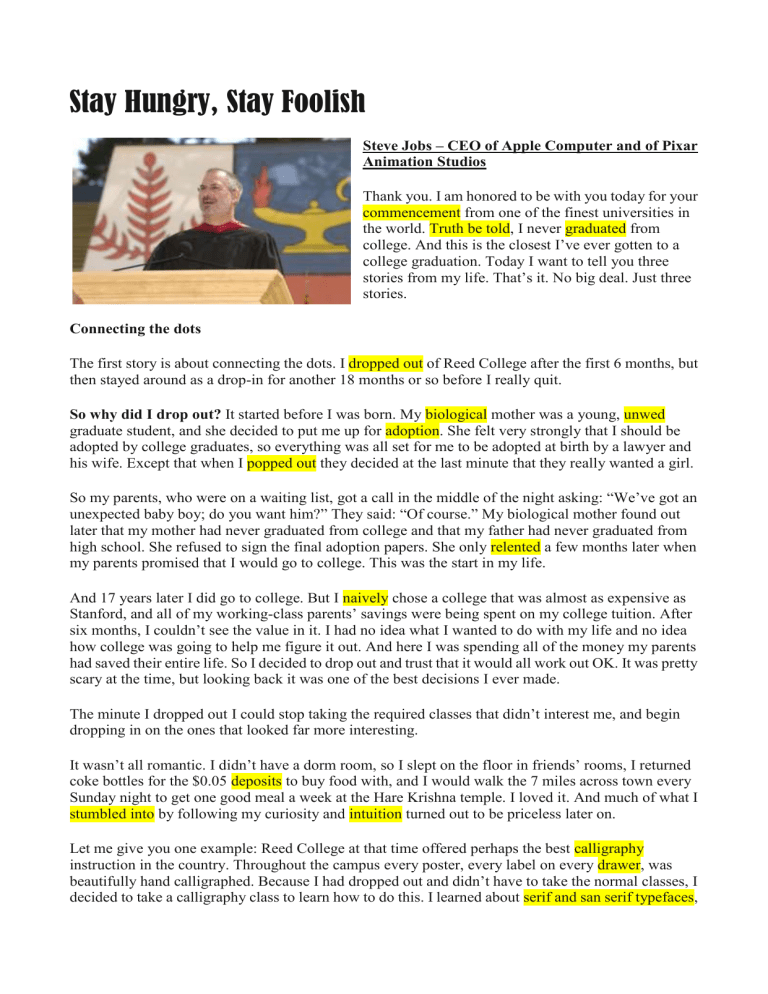 Stay Hungry, Stay Foolish Steve Jobs – CEO of Apple Computer and of Pixar Animation Studios Thank you. I am honored to be with you today for your commencement from one of the finest universities in the world. Truth be told, I never graduated from college. And this is the closest I’ve ever gotten to a college graduation. Today I want to tell you three stories from my life. That’s it. No big deal. Just three stories. Connecting the dots The first story is about connecting the dots. I dropped out of Reed College after the first 6 months, but then stayed around as a drop-in for another 18 months or so before I really quit. So why did I drop out? It started before I was born. My biological mother was a young, unwed graduate student, and she decided to put me up for adoption. She felt very strongly that I should be adopted by college graduates, so everything was all set for me to be adopted at birth by a lawyer and his wife. Except that when I popped out they decided at the last minute that they really wanted a girl. So my parents, who were on a waiting list, got a call in the middle of the night asking: “We’ve got an unexpected baby boy; do you want him?” They said: “Of course.” My biological mother found out later that my mother had never graduated from college and that my father had never graduated from high school. She refused to sign the final adoption papers. She only relented a few months later when my parents promised that I would go to college. This was the start in my life. And 17 years later I did go to college. But I naively chose a college that was almost as expensive as Stanford, and all of my working-class parents’ savings were being spent on my college tuition. After six months, I couldn’t see the value in it. I had no idea what I wanted to do with my life and no idea how college was going to help me figure it out. And here I was spending all of the money my parents had saved their entire life. So I decided to drop out and trust that it would all work out OK. It was pretty scary at the time, but looking back it was one of the best decisions I ever made. The minute I dropped out I could stop taking the required classes that didn’t interest me, and begin dropping in on the ones that looked far more interesting. It wasn’t all romantic. I didn’t have a dorm room, so I slept on the floor in friends’ rooms, I returned coke bottles for the $0.05 deposits to buy food with, and I would walk the 7 miles across town every Sunday night to get one good meal a week at the Hare Krishna temple. I loved it. And much of what I stumbled into by following my curiosity and intuition turned out to be priceless later on. Let me give you one example: Reed College at that time offered perhaps the best calligraphy instruction in the country. Throughout the campus every poster, every label on every drawer, was beautifully hand calligraphed. Because I had dropped out and didn’t have to take the normal classes, I decided to take a calligraphy class to learn how to do this. I learned about serif and san serif typefaces, about varying the amount of space between different letter combinations, about what makes great typography great. It was beautiful, historical, artistically subtle in a way that science can’t capture, and I found it fascinating. None of this had even a hope of any practical application in my life. But 10 years later, when we were designing the first Macintosh computer, it all came back to me. And we designed it all into the Mac. It was the first computer with beautiful typography. If I had never dropped in on that single course in college, the Mac would have never had multiple typefaces or proportionally spaced fonts. And since Windows just copied the Mac, it’s likely that no personal computer would have them. If I had never dropped out, I would have never dropped in on this calligraphy class, and personal computers might not have the wonderful typography that they do. Of course it was impossible to connect the dots looking forward when I was in college. But it was very, very clear looking backwards 10 years later. Again, you can’t connect the dots looking forward; you can only connect them looking backwards. So you have to trust that the dots will somehow connect in your future. You have to trust in something — your gut, destiny, life, karma, whatever. Because believing that the dots will connect down the road will give you the confidence to follow your heart even when it leads you off the well-worn path and that will make all the difference. Love and loss My second story is about love and loss. I was lucky — I found what I loved to do early in life. Woz and I started Apple in my parents’ garage when I was 20. We worked hard, and in 10 years Apple had grown from just the two of us in a garage into a $2 billion company with over 4000 employees. We had just released our finest creation — the Macintosh — a year earlier, and I had just turned 30. And then I got fired. How can you get fired from a company you started? Well, as Apple grew we hired someone who I thought was very talented to run the company with me, and for the first year or so things went well. But then our visions of the future began to diverge and eventually we had a falling out. When we did, our Board of Directors sided with him. So at 30 I was out. And very publicly out. What had been the focus of my entire adult life was gone, and it was devastating. I really didn’t know what to do for a few months. I felt that I had let the previous generation of entrepreneurs down – that I had dropped the baton as it was being passed to me. I met with David Packard and Bob Noyce and tried to apologize for screwing up so badly. I was a very public failure, and I even thought about running away from the valley. But something slowly began to dawn on me — I still loved what I did. The turn of events at Apple had not changed that one bit. I had been rejected, but I was still in love. And so I d