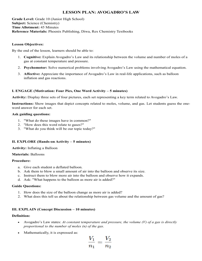 LESSON PLAN: AVOGADRO’S LAW Grade Level: Grade 10 (Junior High School) Subject: Science (Chemistry) Time Allotment: 45 Minutes Reference Materials: Phoenix Publishing, Diwa, Rex Chemistry Textbooks Lesson Objectives: By the end of the lesson, learners should be able to: 1. Cognitive: Explain Avogadro’s Law and its relationship between the volume and number of moles of a gas at constant temperature and pressure. 2. Psychomotor: Solve numerical problems involving Avogadro’s Law using the mathematical equation. 3. Affective: Appreciate the importance of Avogadro’s Law in real-life applications, such as balloon inflation and gas reactions. I. ENGAGE (Motivation: Four Pics, One Word Activity – 5 minutes) Activity: Display three sets of four pictures, each set representing a key term related to Avogadro’s Law. Instructions: Show images that depict concepts related to moles, volume, and gas. Let students guess the oneword answer for each set. Ask guiding questions: 1. "What do these images have in common?" 2. "How does this word relate to gases?" 3. "What do you think will be our topic today?" II. EXPLORE (Hands-on Activity – 5 minutes) Activity: Inflating a Balloon Materials: Balloons Procedure: a. b. c. d. Give each student a deflated balloon. Ask them to blow a small amount of air into the balloon and observe its size. Instruct them to blow more air into the balloon and observe how it expands. Ask: "What happens to the balloon as more air is added?" Guide Questions: 1. How does the size of the balloon change as more air is added? 2. What does this tell us about the relationship between gas volume and the amount of gas? III. EXPLAIN (Concept Discussion – 10 minutes) Definition: Avogadro’s Law states: At constant temperature and pressure, the volume (V) of a gas is directly proportional to the number of moles (n) of the gas. Mathematically, it is expressed as: Concept Explanation: If the number of gas molecules (moles) increases, the volume also increases, provided temperature and pressure remain constant. If the number of gas molecules decreases, the volume decreases proportionally. Real-life Applications: Inflating a balloon: The more air you blow, the larger it gets. Lungs expanding when we inhale and contracting when we exhale. Aerosol cans: More gas means more pressure inside, leading to a higher volume when released. IV. ELABORATE (Problem-Solving – 15 minutes) Example 1 (Guided Example) A gas sample has a volume of 5.0 L when containing 2.0 moles of oxygen gas. If the number of moles is increased to 6.0 moles, what will be the new volume, assuming temperature and pressure remain constant? Answer: The new volume is 15.0 L. Example 2 (Independent Practice) A gas in a balloon occupies 8.0 L when containing 4.0 moles of helium. If the number of moles is reduced to 2.0 moles, what will be the new volume? Answer: The new volume is 4.0 L. V. EVALUATE (Assessment – 5 minutes) Exit Ticket: Students will answer the following: 1. State Avogadro’s Law in your own words. 2. How does increasing the number of moles affect the volume of gas? 3. Solve the following problem: A gas with a volume of 12.0 L contains 3.0 moles of gas. If the amount of gas is increased to 6.0 moles, what is the new volume?