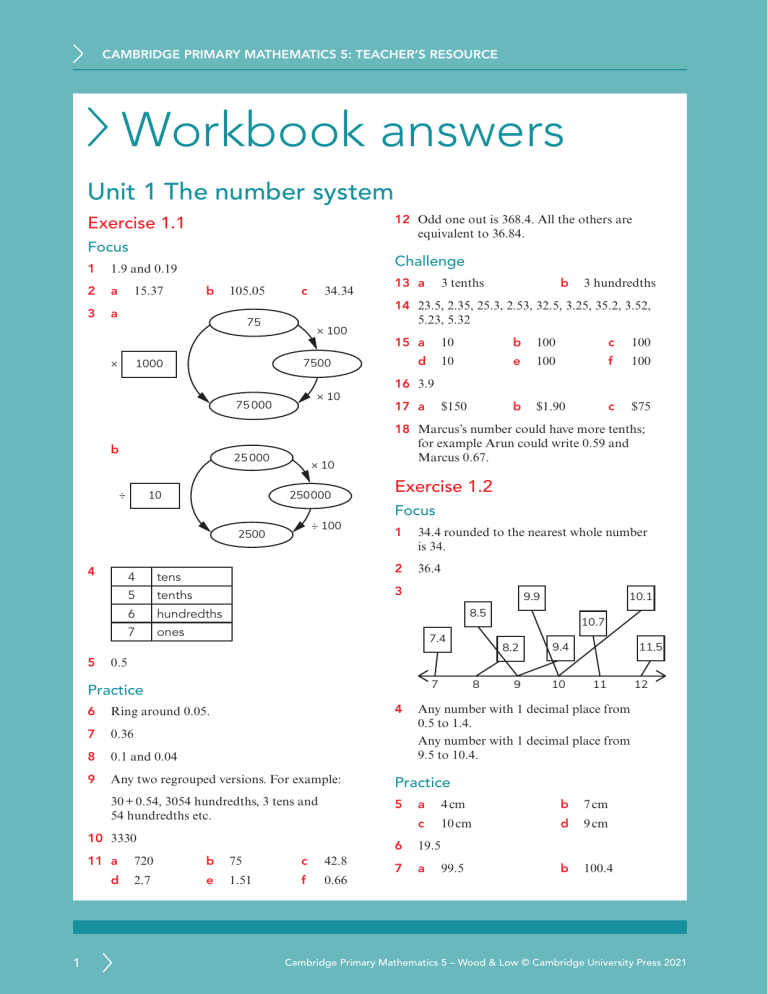 CAMBRIDGE PRIMARY MATHEMATICS 5: TEACHER’S RESOURCE Workbook answers Unit 1 The number system 12 Odd one out is 368.4. All the others are equivalent to 36.84. Exercise 1.1 Focus 1 1.9 and 0.19 2 a 3 a 15.37 Challenge b 105.05 c 75 × × 100 × 10 75 000 b 25 000 × 10 250 000 10 ÷ 100 2500 4 5 13 a 4 tens 5 tenths 6 hundredths 7 ones 3 hundredths 15 a 10 b 100 c 100 d 10 e 100 f 100 $150 b $1.90 c $75 16 3.9 17 a 18 Marcus’s number could have more tenths; for example Arun could write 0.59 and Marcus 0.67. Exercise 1.2 Focus 1 34.4 rounded to the nearest whole number is 34. 2 36.4 3 9.9 10.1 8.5 7.4 10.7 8.2 9.4 9 10 11.5 0.5 7 Practice 4 8 Ring around 0.05. 7 0.36 8 0.1 and 0.04 9 Any two regrouped versions. For example: Practice 30 + 0.54, 3054 hundredths, 3 tens and 54 hundredths etc. 5 11 a 720 b 75 c 42.8 d 2.7 e 1.51 f 0.66 11 12 Any number with 1 decimal place from 0.5 to 1.4. Any number with 1 decimal place from 9.5 to 10.4. 6 10 3330 1 b 3 tenths 14 23.5, 2.35, 25.3, 2.53, 32.5, 3.25, 35.2, 3.52, 5.23, 5.32 7500 1000 ÷ 34.34 a 4 cm b 7 cm c 10 cm d 9 cm 99.5 b 100.4 6 19.5 7 a Cambridge Primary Mathematics 5 – Wood & Low © Cambridge University Press 2021 CAMBRIDGE PRIMARY MATHEMATICS 5: TEACHER’S RESOURCE Challenge 8 BELT 9 20.3 9 10 2.4 and 4.4 11 Rounds to 3 Rounds to 4 Rounds to 5 3.3 3.5 3.9 3.7 4.4 4.5 More than one possible solution. Clues should define or describe these words: Across Down 4 tessellates 1 isosceles 6 scalene 2 angle 3 side 4.9 5 triangle Exercise 2.2 Unit 2 2D shape and pattern Focus 1 Exercise 2.1 Focus 1 Yes, two of the sides are equal length. 2 C, D and F 3 A a acute b right angle c acute B a acute b obtuse c acute C a acute b acute c acute Practice 4 Sketch of a scalene triangle. 5 a 50° angles circled. b 45° angles circled. c 55° angles circled. d 59° angles circled. 6 Equilateral circled. 3 aThe sides of an equilateral triangle are all equal in length. b The angles of an equilateral triangle are all equal. 4 Challenge 7 2 aSketch of isosceles triangle with two sides of 6 cm and a shorter side. b Sketch of isosceles triangle with two sides of 6 cm and a longer side. 8 2 Cambridge Primary Mathematics 5 – Wood & Low © Cambridge University Press 2021 CAMBRIDGE PRIMARY MATHEMATICS 5: TEACHER’S RESOURCE Practice 5 10 aMore than one possible answer, for example: a 1 line of symmetry drawn. b No lines of symmetry drawn. c No lines of symmetry drawn. d 1 line of symmetry drawn. e 3 lines of symmetry drawn. 6 b c 4 7 Unit 3 Numbers and sequences Exercise 3.1 3 Challenge Focus 8 Completed pattern should have two lines of symmetry along the diagonal lines on the diagram. 1 9 a 2 b Circle in the centre of the chessboard. c Cross anywhere on the chessboard except along the diagonals of the board. d Triangle in any position along the diagonals of the board, but not in the centre. −2 because each term is found by subtracting 2. Cambridge Primary Mathematics 5 – Wood & Low © Cambridge University Press 2021 CAMBRIDGE PRIMARY MATHEMATICS 5: TEACHER’S RESOURCE 2 3 a b 1 2 3 4 5 6 7 8 9 10 11 12 13 14 15 16 17 18 19 20 21 22 23 24 25 26 27 28 29 30 31 32 33 34 35 36 37 38 39 40 41 42 43 44 45 46 47 48 49 50 51 52 53 54 55 56 57 58 59 60 61 62 63 64 1 10 2 13 3 16 4 19 c Add 3 d 31 hexagons 105 The numbers that they both say must be multiples of both 3 and 5. The first number greater than 100 that is a multiple of both 3 and 5 is 105. The multiples form diagonal lines. 10 6, 10, 14 c No 11 4 and 9 a 7, 9, 11, 13 b 7, 9, 11, 13, 15, 17 c Add 2 Exercise 3.2 Focus 1 4 −8 5 79, 70, (61, 52,) 43 6 a b Pattern number Number of sticks 1 6 2 11 3 16 4 21 c Add 5 d 51 sticks square numbers 2 1030 Challenge 8 Number of hexagons b Practice 7 9 Pattern number a triangular numbers 3 a 36 and 49 b 15 and 21 Practice 4 a square b 10 + 15 = 25 15 + 21 = 36 4 Cambridge Primary Mathematics 5 – Wood & Low © Cambridge University Press 2021 CAMBRIDGE PRIMARY MATHEMATICS 5: TEACHER’S RESOURCE 5 64 6 6 a 9 7 a 64, 4, 100, 81, 9 Challenge b Yes. 49 is a square number so she can make a 7 by 7 square. 7 b c 4 49 Challenge 8 9 16 42 = 16 4 × 6 = 24 25 52 = 25 5 × 7 = 35 36 62 = 36 a 1 + 9 = 10 b c 4 + 36 = 40 d 25 + 25 = 50 or 1 + 49 = 50 e 16 + 64 = 80 g 36 + 64 = 100 4 + 16 = 20 Prime number 1 is 19. Prime number 2 is 13. 8 3 × 5 = 15 Factors of 15 are 1, 3, 5 and 15. A prime number has only two factors. 9 A counter example, for example: • 1 more than 24 is 25 which is a square number • 1 more than 54 is 55 which is a multiple of 5. 67, 71, 73 10 f Triangular numbers 9 + 81 = 90 1 10 55 6 3 13 17 19 2 10 Even numbers 4 12 16 20 9 8 14 18 Exercise 3.3 Focus 1 15 Prime numbers 5 7 11 P 2 Prime numbers Composite numbers 2 4 5 Exercise 4.1 6 3 Unit 4 Averages Focus 3 A number with only two factors is called a prime number. 1 a 8 2 a 109, 117, 118, 120, 121 b 118 3 a 24 b 23 4 a 11 b 12 Practice 4 2 4 6 8 13 3 23 29 71 65 1 51 45 7 5 15 92 25 1 2 31 37 16 14 11 5 c 7 3 Practice 5 6 7 5 b a 2+7 b 19 + 31 or 7 + 43 or 13 + 37 or 47 + 3 First put the numbers in order from smallest to greatest. Then find the middle number. The middle number is the median of the data. A and D ticked. Any set of numbers where the most frequent is 8 and the middle number is 9 when the numbers are put in order. Cambridge Primary Mathematics 5 – Wood & Low © Cambridge University Press 2021 CAMBRIDGE PRIMARY MATHEMATICS 5: TEACHER’S RESOURCE 8 a 1 b 2 c The median would describe the scores better because although three people gave the book a score of 1, everyone else gave the book a higher score. The median of 3 represents this better. 3 10 c 30, 33 or 29 (if learner gives another number that is not already in the set then it is a correct answer, but it will mean the data has no mode. This situation is considered fully in later stages). b 5.4 6.3 106 e Any three different numbers except 4. 10 aA set of five numbers which contain 3, 3, 4 and two other larger numbers. Two more sets of 