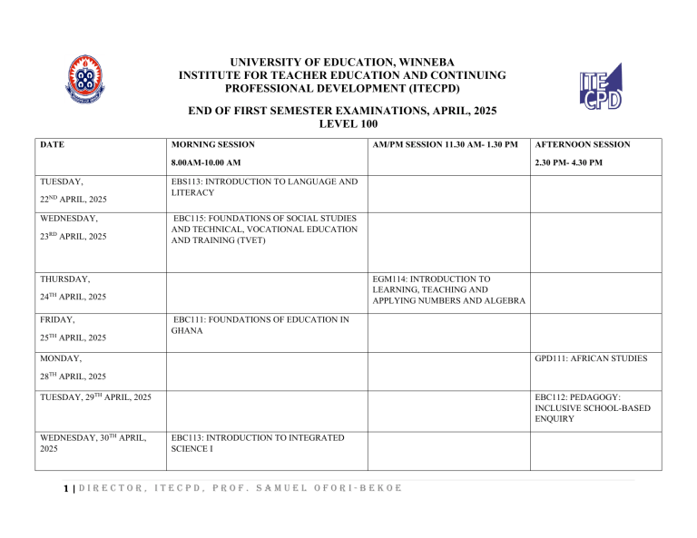 UNIVERSITY OF EDUCATION, WINNEBA INSTITUTE FOR TEACHER EDUCATION AND CONTINUING PROFESSIONAL DEVELOPMENT (ITECPD) END OF FIRST SEMESTER EXAMINATIONS, APRIL, 2025 LEVEL 100 DATE MORNING SESSION AM/PM SESSION 11.30 AM- 1.30 PM 8.00AM-10.00 AM TUESDAY, 22ND APRIL, 2025 WEDNESDAY, 23RD APRIL, 2025 EBC115: FOUNDATIONS OF SOCIAL STUDIES AND TECHNICAL, VOCATIONAL EDUCATION AND TRAINING (TVET) EGM114: INTRODUCTION TO LEARNING, TEACHING AND APPLYING NUMBERS AND ALGEBRA 24TH APRIL, 2025 25TH APRIL, 2025 2.30 PM- 4.30 PM EBS113: INTRODUCTION TO LANGUAGE AND LITERACY THURSDAY, FRIDAY, AFTERNOON SESSION EBC111: FOUNDATIONS OF EDUCATION IN GHANA MONDAY, GPD111: AFRICAN STUDIES 28TH APRIL, 2025 TUESDAY, 29TH APRIL, 2025 WEDNESDAY, 30TH APRIL, 2025 EBC112: PEDAGOGY: INCLUSIVE SCHOOL-BASED ENQUIRY EBC113: INTRODUCTION TO INTEGRATED SCIENCE I 1|DIRECTOR, ITECPD, PROF. SAMUEL OFORI-BEKOE 2|DIRECTOR, ITECPD, PROF. SAMUEL OFORI-BEKOE