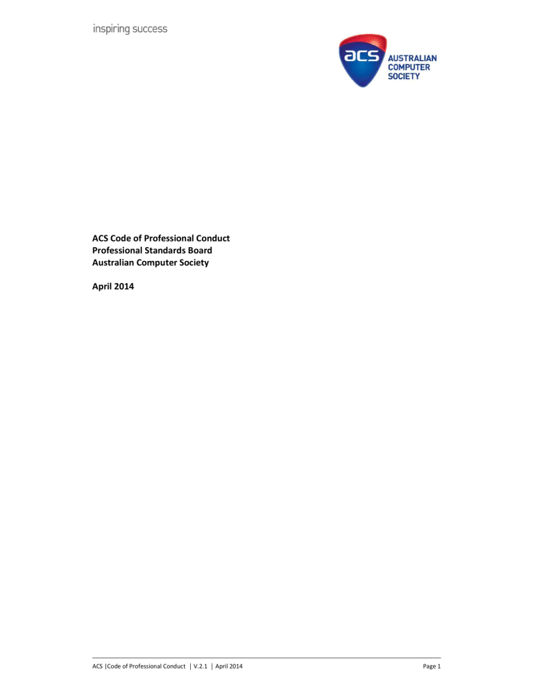 ACS Code of Professional Conduct Professional Standards Board Australian Computer Society April 2014 ACS |Code of Professional Conduct V.2.1 April 2014 Page 1 ACS Code of Professional Conduct Version History Date Document Version Revision History (reason for change) Author /Reviser 06.07.2012 V.2 Corporate Identity Changes Ruth Graham 04.04.2014 V2.1 Removed reference to Code of Professional Practice Graham Low Approvals Date approved Version Approved By Date in force Date of Next Review 2005 V.1 Professional Standards Board 2005 To be confirmed 2014 V2.1 Michael Johnson 4 April 2014 To be confirmed Custodian title & e-mail address: andrew.johnson@acs.org.au Responsible Business Group: Professional Standards Board Distribution: General (no restriction on distribution) Content Security: Unclassified ACS |Code of Professional Conduct V.2.1 April 2014 Page 2 TABLE OF CONTENTS ACS Code of Professional Conduct ......................................................................................... 1.1. PREAMBLE................................................................................................................ 4 Relevance To Law ........................................................................................................ 4 1.2. THE CODE ................................................................................................................. 5 1.2.1. The Primacy of the Public Interest .................................................................... 6 1.2.2. The Enhancement of Quality of Life .................................................................. 6 1.2.3. Honesty ............................................................................................................. 7 1.2.4. Competence ...................................................................................................... 7 1.2.5. Professional Development ................................................................................ 8 1.2.6. Professionalism ................................................................................................. 8 ACS |Code of Professional Conduct V.2.1 April 2014 Page 3 1.1. PREAMBLE An essential characteristic of a profession is the need for its members to abide by a code of ethics. For the ACS, this code is established as the Code of Professional Conduct and is part of the Society's Regulations. These Regulations apply to any ACS member who works in the field of information and communications technology (ICT). This Code of Professional Conduct (the Code) identifies six core ethical values and the associated requirements for professional conduct. The Society requires its members to abide by these values, and act with responsibility and integrity in all of their professional dealings. Relevance to Law This Code of Professional Conduct has relevance to professional standards legislation. Failure to abide by the Code could be used as grounds for a claim of professional negligence. The Code may be quoted by an expert witness giving an assessment of professional conduct. Failure to observe the Code could also lead to disciplinary action by the ACS. ACS |Code of Professional Conduct V.2.1 April 2014 Page 4 1.2. THE CODE As an ACS member you must uphold and advance the honour, dignity and effectiveness of being a professional. This entails, in addition to being a good citizen and acting within the law, your conformance to the following ACS values. 1. The Primacy of the Public Interest You will place the interests of the public above those of personal, business or sectional interests. 2. The Enhancement of Quality of Life You will strive to enhance the quality of life of those affected by your work. 3. Honesty You will be honest in your representation of skills, knowledge, services and products. 4. Competence You will work competently and diligently for your stakeholders. 5. Professional Development You will enhance your own professional development, and that of your staff. 6. Professionalism You will enhance the integrity of the ACS and the respect of its members for each other. In a situation of conflict between the values, The Primacy of the Public Interest takes precedence over the other values. This Code of Professional Conduct is aimed specifically at you as an individual practitioner, and is intended as a guideline for your acceptable professional conduct. It is applicable to all ACS members regardless of their role or specific area of expertise in the ICT industry. The following list of requirements is not exhaustive and should not be read as a complete definition of acceptable professional conduct in all practical situations. The intention of the Code is to illustrate what constitutes professional behaviour. You are expected to take into account the spirit of this Code in order to resolve ambiguous or contentious issues concerning professional conduct. The ACS can help you resolve ethical dilemmas. ACS |Code of Professional Conduct V.2.1 April 2014 Page 5 1.2.1. The Primacy of the Public Interest In the context of this Code, the public interest takes precedence over personal, private and sectional interests, and any conflicts should be resolved in favour of the public interest. In your work, you should safeguard the interests of your immediate stakeholders, provided that these interests do not conflict with the duty and loyalty you owe to the public. The public interest is taken to include matters of public health, safety and the environment. In accordance with this value you will: a) identify those potentially impacted by your work and explicitly consider their interests; b) raise with stakeholders any potential conflicts between your professional activity and legal or other accepted public requirements; c) advise your stakeholders as soon as possible of any conflicts of interest or conscientious objections that you have; d) take into consideration the fact that your profession traverses many other professions, and has implications
