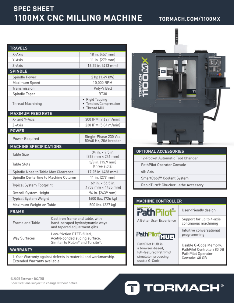 SPEC SHEET 1100MX CNC MILLING MACHINE TORMACH.COM/1100MX TRAVELS X-Axis 18 in. (457 mm) Y-Axis 11 in. (279 mm) Z-Axis 16.25 in. (413 mm) SPINDLE Spindle Power 2 hp (1.49 kW) Maximum Speed 10,000 RPM Transmission Poly-V Belt Spindle Taper BT30 • Rigid Tapping • Tension/Compression • Thread Mill Thread Machining MAXIMUM FEED RATE X- and Y-Axis 300 IPM (7.62 m/min) Z-Axis 230 IPM (5.84 m/min) POWER Single-Phase 230 Vac, 50/60 Hz, 20A breaker Power Required MACHINE SPECIFICATIONS 34 in. × 9.5 in. (863 mm × 241 mm) 5/8 in. (15.9 mm) (three slots) Table Size Table Slots OPTIONAL ACCESSORIES 12-Pocket Automatic Tool Changer PathPilot Operator Console Spindle Nose to Table Max Clearance 17.25 in. (438 mm) 4th Axis Spindle Centerline to Machine Column 11 in. (279 mm) SmartCool™ Coolant System Typical System Footprint 69 in. × 56.5 in. (1753 mm × 1435 mm) Overall System Height 96 in. (2439 mm) Typical System Weight 1600 lbs. (726 kg) Maximum Weight on Table 500 lbs. (227 kg) RapidTurn® Chucker Lathe Accessory MACHINE CONTROLLER User-friendly design FRAME Frame and Table Cast iron frame and table, with hand-scraped hydrodynamic ways and tapered adjustment gibs Way Surfaces Low-friction PTFE-filled, Acetyl-bonded sliding surface. Similar to Rulon® and Turcite®. WARRANTY 1-Year Warranty against defects in material and workmanship. Extended Warranty available. ©2025 Tormach (02/25) Specifications subject to change without notice. A Better User Experience Support for up to 4-axis continuous machining Intuitive conversational programming PathPilot HUB is a browser-based, full-featured PathPilot simulator, producing usable G-Code. Usable G-Code Memory: PathPilot Controller: 80 GB PathPilot Operator Console: 40 GB