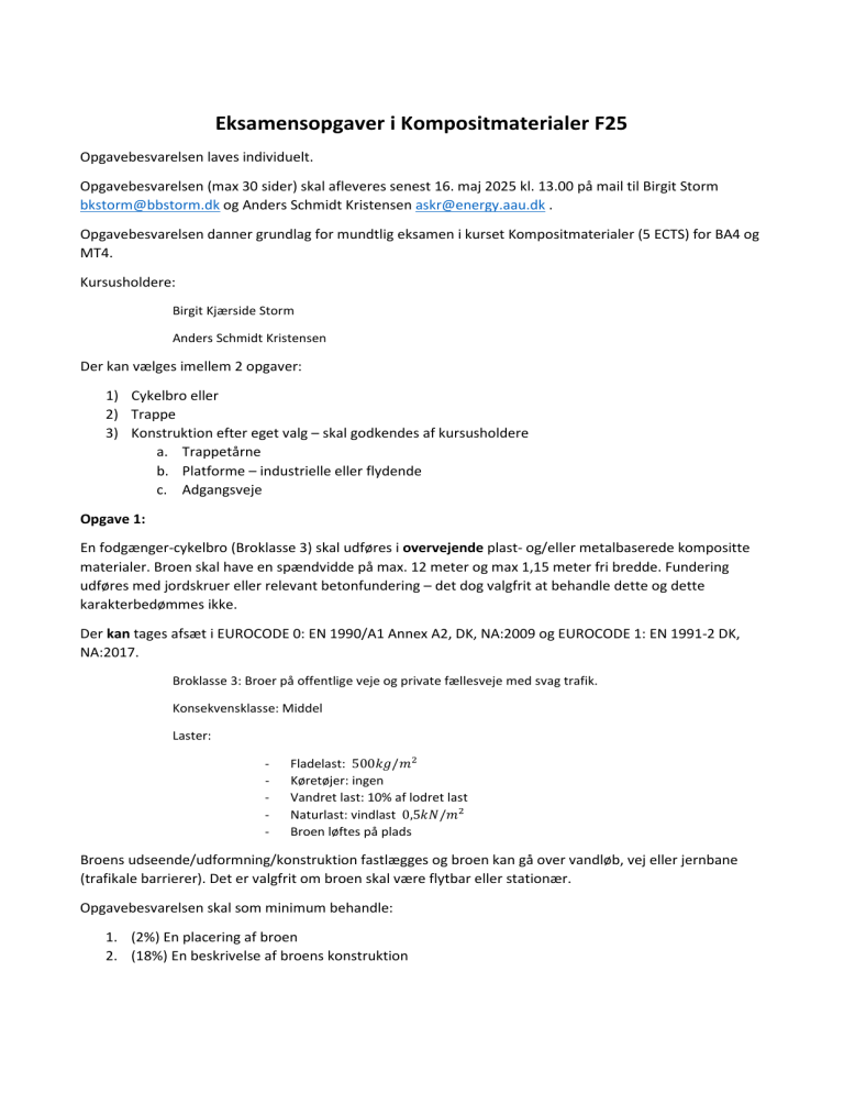 Eksamensopgaver i Kompositmaterialer F25 Opgavebesvarelsen laves individuelt. Opgavebesvarelsen (max 30 sider) skal afleveres senest 16. maj 2025 kl. 13.00 på mail til Birgit Storm bkstorm@bbstorm.dk og Anders Schmidt Kristensen askr@energy.aau.dk . Opgavebesvarelsen danner grundlag for mundtlig eksamen i kurset Kompositmaterialer (5 ECTS) for BA4 og MT4. Kursusholdere: Birgit Kjærside Storm Anders Schmidt Kristensen Der kan vælges imellem 2 opgaver: 1) Cykelbro eller 2) Trappe 3) Konstruktion efter eget valg – skal godkendes af kursusholdere a. Trappetårne b. Platforme – industrielle eller flydende c. Adgangsveje Opgave 1: En fodgænger-cykelbro (Broklasse 3) skal udføres i overvejende plast- og/eller metalbaserede kompositte materialer. Broen skal have en spændvidde på max. 12 meter og max 1,15 meter fri bredde. Fundering udføres med jordskruer eller relevant betonfundering – det dog valgfrit at behandle dette og dette karakterbedømmes ikke. Der kan tages afsæt i EUROCODE 0: EN 1990/A1 Annex A2, DK, NA:2009 og EUROCODE 1: EN 1991-2 DK, NA:2017. Broklasse 3: Broer på offentlige veje og private fællesveje med svag trafik. Konsekvensklasse: Middel Laster: - Fladelast: 500𝑘𝑘𝑘𝑘/𝑚𝑚2 Køretøjer: ingen Vandret last: 10% af lodret last Naturlast: vindlast 0,5𝑘𝑘𝑘𝑘/𝑚𝑚2 Broen løftes på plads Broens udseende/udformning/konstruktion fastlægges og broen kan gå over vandløb, vej eller jernbane (trafikale barrierer). Det er valgfrit om broen skal være flytbar eller stationær. Opgavebesvarelsen skal som minimum behandle: 1. (2%) En placering af broen 2. (18%) En beskrivelse af broens konstruktion 3. (25%) Et materialevalg til broen og konstruktionselementer efter aftale 4. (10%) Relevante beregninger på broen (analytiske og/eller FEM) 5. (25%) En redegørelse for materialevalget til broen, herunder både matricemateriale(r) og forstærkningsmateriale(r) 6. (10%) En redegørelse for samling af broens enkeltdele 7. (10%) En redegørelse for fordele og ulemper ved en bro bygget af plast/metalbaserede kompositter I de følgende figurer er der vist eksempler på broer af plastbaserede kompositter. På nettet findes flere eksempler. Bro placeret i Delft Bro placeret i Madrid Bro placeret i Kolding. Bygget 1997. Var verdens første kompositbro. Opgave 2: En udvendig trappekonstruktion (adgangs- eller evakueringstrappe) skal udføres i overvejende plastog/eller metalbaserede kompositte materialer. Trappen skal give en niveauforskel på max. 6 meter og max 1,15 meter fri bredde. Fundering udføres med jordskruer eller relevant betonfundering – det dog valgfrit at behandle dette og dette karakterbedømmes ikke. Der kan tages afsæt i EUROCODE 4 og EUROCODE 1: EN 1991-2 DK, NA:2017. Laster: - Fladelast: 500𝑘𝑘𝑘𝑘/𝑚𝑚2 Køretøjer: ingen Vandret last: 10% af lodret last Naturlast: vindlast 0,5𝑘𝑘𝑘𝑘/𝑚𝑚2 Trappen løftes på plads Trappens udseende/udformning/konstruktion fastlægges og trappen kan/skal skabe adgang mellem terrænniveauer, fortov til bygning eller grundplan til perron eller tilsvarende. Det er valgfrit om trappen skal være flytbar eller stationær. Opgavebesvarelsen skal som minimum behandle: 8. (2%) En placering af trappen 9. (18%) En beskrivelse af trappens konstruktion 10. (25%) Et materialevalg til trappen og konstruktionselementer efter aftale 11. (10%) Relevante beregninger på trappen (analytiske og/eller FEM) 12. (25%) En redegørelse for materialevalget til trappen, herunder både matricemateriale(r) og forstærkningsmateriale(r) 13. (10%) En redegørelse for samling af trappens enkeltdele 14. (10%) En redegørelse for fordele og ulemper ved en trappe bygget af plast/metalbaserede kompositter I de følgende figurer er der vist eksempler på trapper af plastbaserede kompositter. På nettet findes flere eksempler. Bowes Park i London
