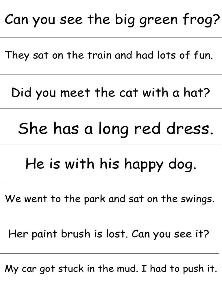 Can you see the big green frog? They sat on the train and had lots of fun. Did you meet the cat with a hat? She has a long red dress. He is with his happy dog. We went to the park and sat on the swings. Her paint brush is lost. Can you see it? My car got stuck in the mud. I had to push it.