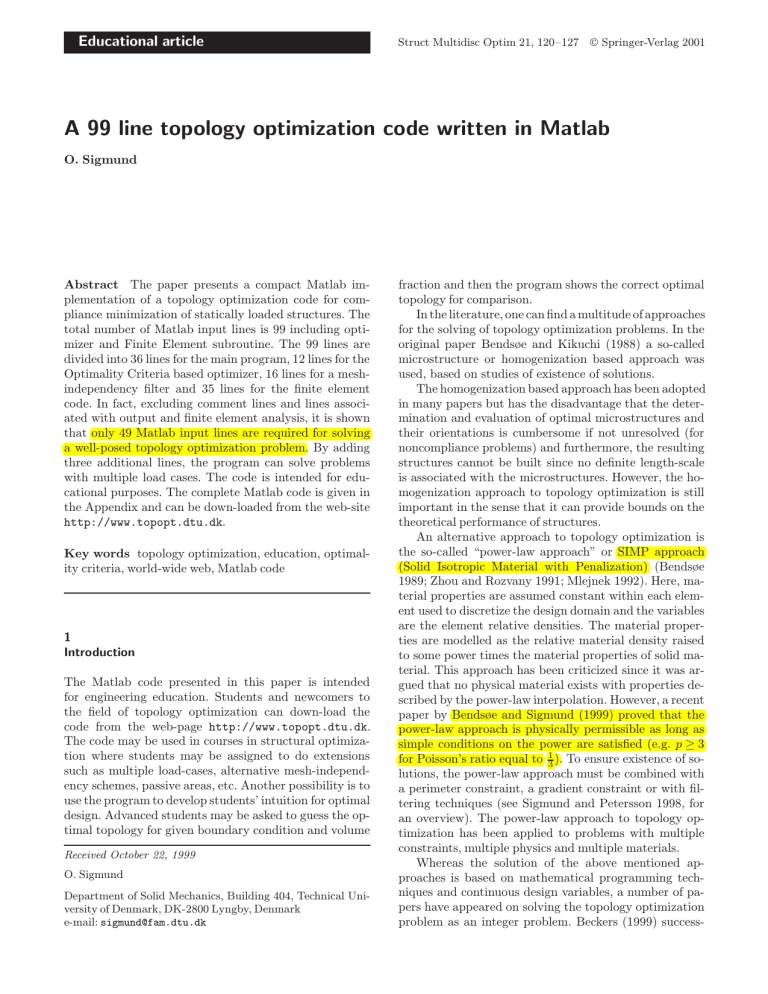 Key words topology optimization, education, optimality criteria, world-wide web, Matlab code