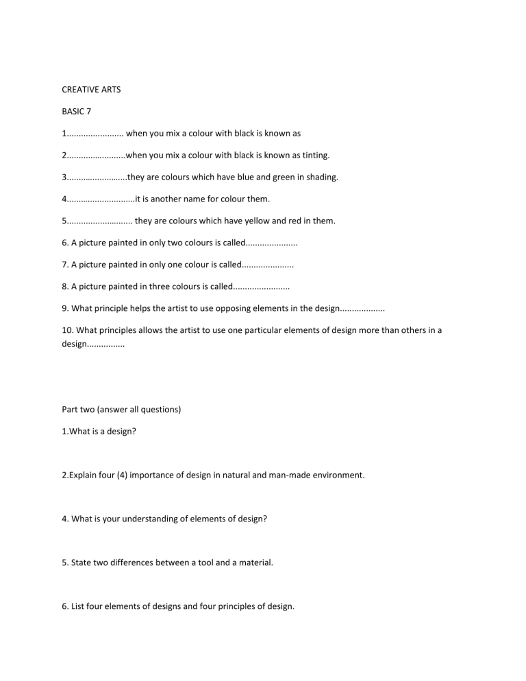 CREATIVE ARTS BASIC 7 1........................ when you mix a colour with black is known as 2............…..........when you mix a colour with black is known as tinting. 3........…........…....they are colours which have blue and green in shading. 4......…....................it is another name for colour them. 5..................…....... they are colours which have yellow and red in them. 6. A picture painted in only two colours is called...................... 7. A picture painted in only one colour is called...................... 8. A picture painted in three colours is called........................ 9. What principle helps the artist to use opposing elements in the design................... 10. What principles allows the artist to use one particular elements of design more than others in a design................ Part two (answer all questions) 1.What is a design? 2.Explain four (4) importance of design in natural and man-made environment. 4. What is your understanding of elements of design? 5. State two differences between a tool and a material. 6. List four elements of designs and four principles of design.