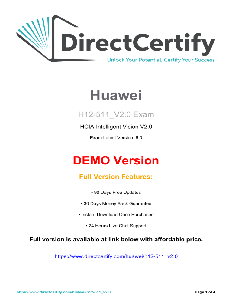 Huawei H12-511_V2.0 Exam HCIA-Intelligent Vision V2.0 Exam Latest Version: 6.0 DEMO Version Full Version Features: • 90 Days Free Updates • 30 Days Money Back Guarantee • Instant Download Once Purchased • 24 Hours Live Chat Support Full version is available at link below with affordable price. https://www.directcertify.com/huawei/h12-511_v2.0 https://www.directcertify.com/huawei/h12-511_v2.0 Page 1 of 4 Question 1. (Multi Select) Which of the following environments would require a Huawei camera with high ingress protection (IP) rating? (Choose Two) A: Indoor office spaces B: Coastal areas with high salt content in the air C: Desert areas with frequent sand storms D: Areas with stable weather conditions Correct Answer: B, C Question 2. (Single Select) For businesses, the platform’s __________ feature is vital for ensuring security in crowded environments. A: text editing B: crowd management C: file sharing D: video calling Correct Answer: B Question 3. (Single Select) In what way does 5G technology impact video security systems? https://www.directcertify.com/huawei/h12-511_v2.0 Page 2 of 4 A: It limits the distance over which video data can be transmitted. B: It allows for higher data throughput and reduced latency. C: It reduces the resolution of video feeds. D: It increases the complexity of network management. Correct Answer: B Question 4. (Multi Select) Which features should be checked during the basic operation check of a Huawei camera? (Choose Three) A: Network connectivity and speed B: Color accuracy in images C: Temperature of the camera housing D: Auto-focus functionality E: Audio reception quality Correct Answer: A, B, D Question 5. (Single Select) Huawei’s Intelligent Vision Platform utilizes __________ to improve the accuracy and speed of processing visual data. A: blockchain B: cloud computing C: artificial intelligence D: analog systems Correct Answer: C https://www.directcertify.com/huawei/h12-511_v2.0 Page 3 of 4 Full version is available at link below with affordable price. https://www.directcertify.com/huawei/h12-511_v2.0 30% Discount Coupon Code: LimitedTime2025 https://www.directcertify.com/huawei/h12-511_v2.0 Page 4 of 4