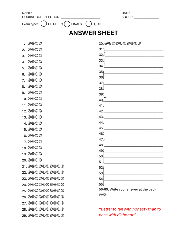 NAME: ____________________________________________ COURSE CODE/ SECTION: _________________________ Exam type: MID-TERM FINALS DATE:___________________ SCORE: ________________ QUIZ ANSWER SHEET 1. ⒶⒷⒸⒹ 30. ⒶⒷⒸⒹⒺⒻⒼⒽⒾⒿ 2. ⒶⒷⒸⒹ 31. ______________________________ 3. ⒶⒷⒸⒹ 4. ⒶⒷⒸⒹ 5. ⒶⒷⒸⒹ 6. ⒶⒷⒸⒹ 7. ⒶⒷⒸⒹ 8. ⒶⒷⒸⒹ 9. ⒶⒷⒸⒹ 10. ⒶⒷⒸⒹ 11. ⒶⒷⒸⒹ 12. ⒶⒷⒸⒹ 32. ______________________________ 33. ______________________________ 34. ______________________________ 35. ______________________________ 36. ______________________________ 37. ______________________________ 38. ______________________________ 39. ______________________________ 40. ______________________________ 41. ______________________________ 42. ______________________________ 13. ⒶⒷⒸⒹ 43. ______________________________ 14. ⒶⒷⒸⒹ 44. ______________________________ 15. ⒶⒷⒸⒹ 16. ⒶⒷⒸⒹ 17. ⒶⒷⒸⒹ 18. ⒶⒷⒸⒹ 19. ⒶⒷⒸⒹ 20. ⒶⒷⒸⒹ 21. ⒶⒷⒸⒹⒺⒻⒼⒽⒾⒿ 22. ⒶⒷⒸⒹⒺⒻⒼⒽⒾⒿ 23. ⒶⒷⒸⒹⒺⒻⒼⒽⒾⒿ 24. ⒶⒷⒸⒹⒺⒻⒼⒽⒾⒿ 25. ⒶⒷⒸⒹⒺⒻⒼⒽⒾⒿ 26. ⒶⒷⒸⒹⒺⒻⒼⒽⒾⒿ 45. ______________________________ 46. ______________________________ 47. ______________________________ 48. ______________________________ 49. ______________________________ 50. ______________________________ 51. ______________________________ 52. ______________________________ 53. ______________________________ 54. ______________________________ 55. ______________________________ 56-60. Write your answer at the back page. 27. ⒶⒷⒸⒹⒺⒻⒼⒽⒾⒿ 28. ⒶⒷⒸⒹⒺⒻⒼⒽⒾⒿ 29. ⒶⒷⒸⒹⒺⒻⒼⒽⒾⒿ “Better to fail with honesty than to pass with dishonor.”