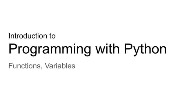 Introduction to Programming with Python Functions, Variables python hello.py functions arguments side effects bugs return values variables comments pseudocode str docs.python.org docs.python.org/3/library/functions.html docs.python.org/3/library/functions.html#print print(*objects, sep=' ', end='\n', file=sys.stdout, flush=False) parameters str docs.python.org/3/library/stdtypes.html#string-methods int + * / % interactive mode int float docs.python.org/3/library/functions.html#round round(number[, ndigits]) float + * / % def scope def return Introduction to Programming with Python Functions, Variables