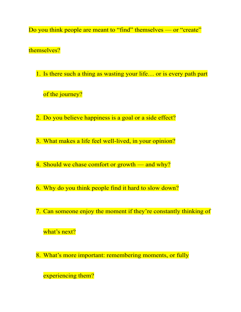 Do you think people are meant to “find” themselves — or “create” themselves? 1. Is there such a thing as wasting your life… or is every path part of the journey? 2. Do you believe happiness is a goal or a side effect? 3. What makes a life feel well-lived, in your opinion? 4. Should we chase comfort or growth — and why? 6. Why do you think people find it hard to slow down? 7. Can someone enjoy the moment if they’re constantly thinking of what’s next? 8. What’s more important: remembering moments, or fully experiencing them? 11. Why do people fear the unknown, even if it might be something good? 12. Is uncertainty a weakness… or a necessary part of life? 13. Should people plan their futures carefully, or just follow where life takes them? 14. Is it brave to change paths — or is it just human? 15. Can you ever really know what you want “next,” or do we always find out too late? 16. What do you think people fear the most but rarely admit? 17. Is fear more mental or emotional — and can it be managed? 18. Why do people fear being misunderstood? 20. Can fear sometimes be a sign that we’re doing the right thi 21. Why do people often take things personally, even if they aren’t meant that way? 22. Can you truly be confident if you care too much about others’ opinions? 23. What helps someone build emotional resilience? 25. Do you think reacting less to things means you’re stronger or colder? 28. Do you believe people truly change — or do they just reveal who they’ve always been? 26. If silence could speak, what would it say about people today? 26. What’s something people often chase… but never actually need?
