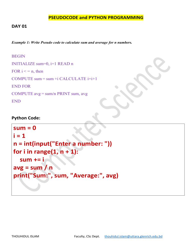 PSEUDOCODE and PYTHON PROGRAMMING DAY 01 Example 1: Write Pseudo code to calculate sum and average for n numbers. BEGIN INITIALIZE sum=0, i=1 READ n FOR i < = n, then COMPUTE sum = sum +i CALCULATE i=i+1 END FOR COMPUTE avg = sum/n PRINT sum, avg END Python Code: sum = 0 i=1 n = int(input("Enter a number: ")) for i in range(1, n + 1): sum += i avg = sum / n print("Sum:", sum, "Average:", avg) THOUHIDUL ISLAM Faculty, CSc Dept. thouhidul.islam@uttara.glenrich.edu.bd Example 2: Write Pseudo code to add two numbers. BEGIN SET C=0 READ A, B ADD C=A+B PRINT C END Python Code: C=0 A = int(input("Enter A: ")) B = int(input("Enter B: ")) C=A+B print(C) THOUHIDUL ISLAM Faculty, CSc Dept. thouhidul.islam@uttara.glenrich.edu.bd Example 3: Write Pseudo code to calculate area of circle. BEGIN READ radius r INITIALIZE pi=3.14 CALCULATE Area=pi * r *r PRINT Area END Python Code: import math r = float(input("Enter the radius: ")) pi = 3.14 Area = pi * r * r print("Area:", Area) THOUHIDUL ISLAM Faculty, CSc Dept. thouhidul.islam@uttara.glenrich.edu.bd Example 4: Write Pseudo code to read number n and print the integers counting up to n. BEGIN READ n INITIALIZE i to 1 FOR i <= n, then DISPLAY i INCREMENT i END FOR END Python Code: n = int(input("Enter a number: ")) i=1 while i <= n: print(i) i += 1 THOUHIDUL ISLAM Faculty, CSc Dept. thouhidul.islam@uttara.glenrich.edu.bd DAY 02 Example 5: Write Pseudo code to find the greatest among two numbers. BEGIN Read A, B IF A >B PRINT “A is greatest” ELSE PRINT “B is greatest” ENDIF END Python Code: A = int(input("Enter A: ")) B = int(input("Enter B: ")) if A > B: print("A is greatest") else: print("B is greatest") THOUHIDUL ISLAM Faculty, CSc Dept. thouhidul.islam@uttara.glenrich.edu.bd Example 6: Write Pseudo code to calculate the Average of Three Numbers. START INPUT num1, num2, num3 SET sum = num1 + num2 + num3 SET average = sum / 3 OUTPUT average STOP Python Code: num1 = float(input("Enter the first number: ")) num2 = float(input("Enter the second number: ")) num3 = float(input("Enter the third number: ")) average = (num1 + num2 + num3) / 3 print("The average is:", average) THOUHIDUL ISLAM Faculty, CSc Dept. thouhidul.islam@uttara.glenrich.edu.bd Example 7: Write Pseudo code to Reverse a String. START INPUT string SET reversed_string = REVERSE(string) OUTPUT reversed_string STOP Python Code: string = input("Enter a string: ") reversed_string = string[::-1] print("Reversed string:", reversed_string) THOUHIDUL ISLAM Faculty, CSc Dept. thouhidul.islam@uttara.glenrich.edu.bd Example 8: Write Pseudo code to Count Down from 10 to 1. START FOR i = 10 TO 1 STEP -1 OUTPUT i NEXT i STOP Python Code: for i in range(10, 0, -1): print(i) THOUHIDUL ISLAM Faculty, CSc Dept. thouhidul.islam@uttara.glenrich.edu.bd DAY 03 Example 9: Write Pseudo code to Convert Celsius to Fahrenheit. START INPUT celsius SET fahrenheit = (celsius * 9/5) + 32 OUTPUT fahrenheit STOP Python Code: celsius = float(input("Enter temperature in Celsius: ")) fahrenheit = (celsius * 9/5) + 32 print("Temperature in Fahrenheit is:", fahrenheit) THOUHIDUL ISLAM Faculty, CSc Dept. thouhidul.islam@uttara.glenrich.edu.bd Example 10: Write Pseudo code of Password Validation. START SET password = "glenrich" INPUT user_password IF user_password == password THEN OUTPUT "Access Granted" ELSE OUTPUT "Access Denied" STOP Python Code: password = "glenrich" user_password = input("Enter the password: ") if user_password == password: print("Access Granted") else: print("Access Denied") THOUHIDUL ISLAM Faculty, CSc Dept. thouhidul.islam@uttara.glenrich.edu.bd