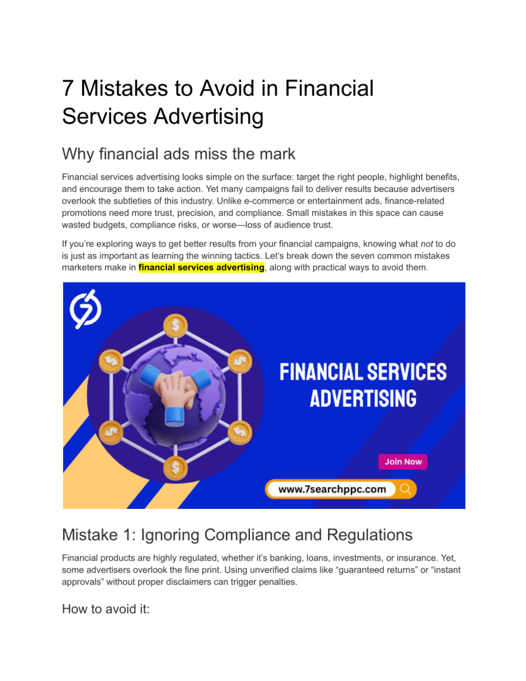 7 Mistakes to Avoid in Financial Services Advertising Why financial ads miss the mark Financial services advertising looks simple on the surface: target the right people, highlight benefits, and encourage them to take action. Yet many campaigns fail to deliver results because advertisers overlook the subtleties of this industry. Unlike e-commerce or entertainment ads, finance-related promotions need more trust, precision, and compliance. Small mistakes in this space can cause wasted budgets, compliance risks, or worse—loss of audience trust. If you’re exploring ways to get better results from your financial campaigns, knowing what not to do is just as important as learning the winning tactics. Let’s break down the seven common mistakes marketers make in financial services advertising, along with practical ways to avoid them. Mistake 1: Ignoring Compliance and Regulations Financial products are highly regulated, whether it’s banking, loans, investments, or insurance. Yet, some advertisers overlook the fine print. Using unverified claims like “guaranteed returns” or “instant approvals” without proper disclaimers can trigger penalties. How to avoid it: ● Always review local advertising standards before running a campaign. ● Add disclaimers for terms like “subject to approval” or “returns may vary.” ● Work with compliance teams if you’re in larger institutions. Not only does this safeguard your business legally, but it also reinforces trust with your audience. Mistake 2: Over-Promising and Under-Delivering In the rush to attract clicks, some campaigns exaggerate benefits. Phrases like “zero fees forever” or “quick wealth” may get attention but disappoint when users discover hidden conditions. In finance, broken trust is almost impossible to repair. How to avoid it: ● Be clear about what your service actually offers. ● Focus on long-term value instead of flashy short-term claims. ● Test your copy with actual users to see if it feels believable. Transparency doesn’t weaken your ads—it strengthens your credibility. Mistake 3: Poor Audience Targeting A retirement investment product shown to college students or payday loan ads displayed to high-net-worth investors wastes both money and effort. Financial services advertising demands precise audience segmentation. How to avoid it: ● Use behavioral data, not just demographics. ● Separate prospects by life stage, income level, or financial goals. ● Test smaller, segmented campaigns before scaling. Smarter targeting ensures your ad spend reaches people who are ready and able to act. Mistake 4: Neglecting Mobile-First Experiences Most financial research today starts on mobile devices. Yet many ads still send users to clunky, desktop-first landing pages. A poorly optimized mobile experience increases bounce rates and makes campaigns look unprofessional. How to avoid it: ● Ensure fast-loading landing pages. ● Simplify forms—ask for only essential details. ● Test your ads across multiple devices before launching. When your audience finds it easy to engage on the go, conversions rise naturally. Mistake 5: Lack of Clear Value Proposition Financial ads often focus on features—“low-interest rates” or “instant approval”—without showing why it matters to the customer. People want to know how your service improves their financial lives, not just what it technically offers. How to avoid it: ● Translate features into benefits. ● Highlight security, convenience, or peace of mind. ● Share relatable examples—like saving for a child’s education or securing a first home. Strong value propositions make ads relatable instead of forgettable. Mistake 6: Weak Creative and Messaging Strategy Because finance feels “serious,” many ads stick to plain, uninspired messaging. The result? Campaigns that blend into the background. On the other hand, going too casual or gimmicky can damage credibility. How to avoid it: ● Strike a balance between approachable and professional. ● Use visuals that spark trust—like real people, not just stock photos. ● Refresh creatives regularly to avoid ad fatigue. This is where learning from industry insights, such as Financial Services Advertising PPC Ideas, Trends and Examples , can give direction to your next ad campaign. Mistake 7: Not Testing and Optimizing Enough Too many financial advertisers set a campaign live and wait for results without ongoing optimization. Digital ads are dynamic; what worked last quarter may fail today. How to avoid it: ● A/B test headlines, images, and CTAs. ● Monitor metrics beyond clicks—like cost per lead, quality score, and conversion rates. ● Keep iterating until you identify patterns that consistently work. Testing isn’t optional—it’s the foundation of sustainable success in online financial marketing. Bringing It Together: Smarter Paths Ahead When you look at these mistakes closely, they all connect to a central truth: financial services advertising works best when it’s built on trust, clarity, and precision. It’s not about spending the most money but about avoiding the common traps that drain budgets and credibility. Digital finance advertising is evolving, with more customers demanding transparency and mobile-first experiences. If you focus on compliance, honesty, targeting, and optimization, your campaigns are more likely to succeed in the long run. And if you’re ready to take the next step, you can create a free account with a platform built for smarter campaign testing—an easy way to experiment without heavy risks. Final Thoughts Mistakes in financial ads are not just about wasted spend—they can affect brand reputation and consumer trust for years. By learning from these seven common pitfalls, you’ll build campaigns that not only attract clicks but also convert them into loyal customers. The finance industry may have its challenges, but with careful planning, the right creative tone, an