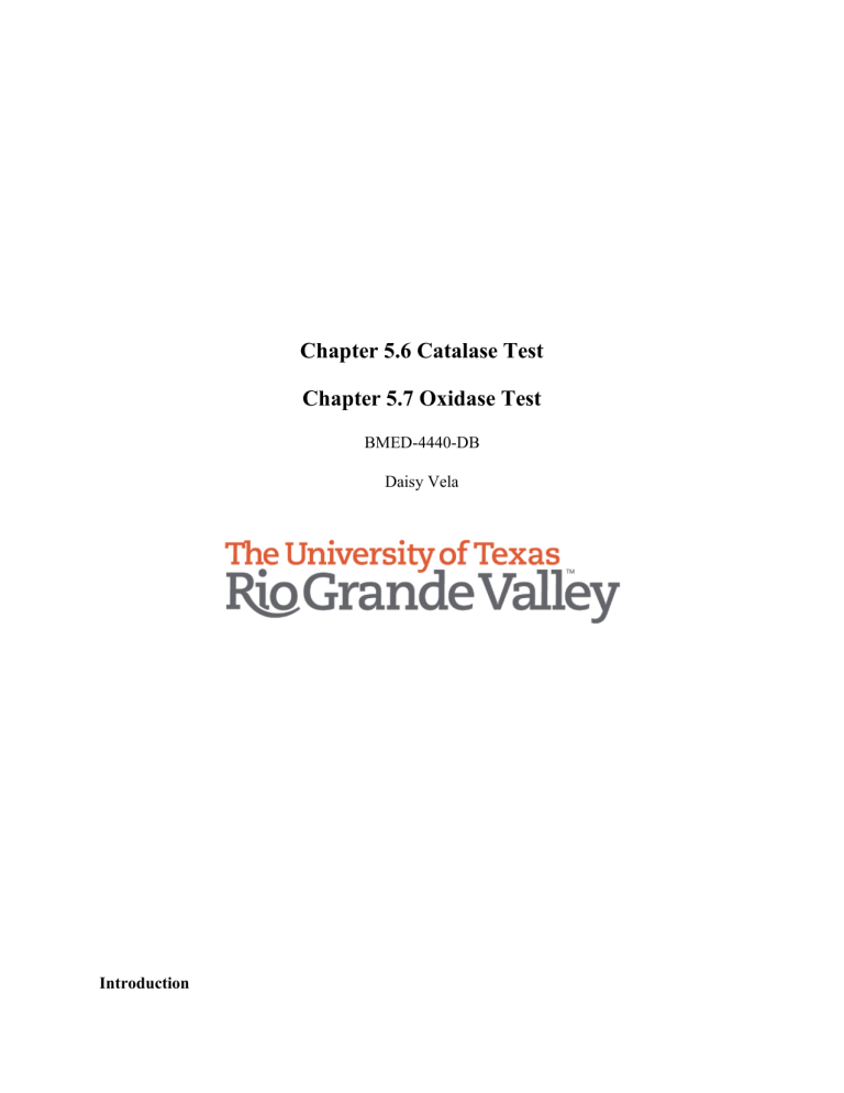 Chapter 5.6 Catalase Test Chapter 5.7 Oxidase Test BMED-4440-DB Daisy Vela Introduction We tested a variety of bacteria in this lab using the Oxidase and Catalase tests. (Leboffe and Pierce 2015), the catalase test is used to determine whether the bacteria have the enzyme that "converts hydrogen peroxide into water and gaseous oxygen." In the electron transport chain, oxygen is the last electron acceptor used by most facultatively anaerobic and aerobic microorganisms. Hydrogen peroxide is produced when the ETC molecule flavoprotein transports electrons to oxygen directly, avoiding the subsequent electron carrier. Since hydrogen peroxide is harmful to cells, catalase must transform it into gaseous oxygen and water. (Leboffe and Pierce 2015), the oxidase test is now "designed to identify the presence of cytochrome c oxidase." Glucose is oxidized by an electron transport chain found in the majority of aerobes and some anaerobes. Numerous co-enzymes are decreased when glucose is oxidized. If the bacterium possesses a mitochondrial ETC that is similar to that of eukaryotes, cytochrome c oxidase will oxidize these coenzymes to return them to their oxidized forms. Although cytochrome c oxidase can be oxidized by the oxidase test, tetramethyl-p-phenylenediamine can also lower it. Objectives • • • • Determine whether a bacterium has catalase. Determine whether a bacterium has cytochrome C oxidase. Perform the catalase test. Perform the oxidase test. Data Sheet Post Lab Questions 5-6 1. Think about the advice given in the procedure to test a known catalase positive organisms along with an unknown. a. Is this a positive or negative control? Positive b. What information is provided by the results? This demonstrates what a true positive indicates when a bacterial sample has catalase. The unknown should behave similarly to the known catalase-positive creature if it possesses catalase. 2. Consider the step in the tube test where hydrogen peroxide is added to the uninoculated tube. a. Is this a positive or a negative control? negative control b. What information is provided by the results? This demonstrates the expected appearance of a negative reaction with hydrogen peroxide. This will show that catalase is not present. This further demonstrates that our reagent will only bubble in the presence of catalase in the sample. 3. When flavoprotein transfers electrons directly to oxygen, hydrogen peroxide is produced. What other consequences might result from electron carriers in the ETC being bypassed? Because the electrons won't reach the last electron acceptor, oxygen, which is the step before ATP creation, there may be a decrease in ATP production. The proton gradient may be upset as a result, which may interfere with the synthesis of ATP. Hydrogen peroxide can also interfere with normal cell activity because it is harmful to cells. 4. Would a false positive from the reaction between the inoculating loop and hydrogen peroxide be caused by poor specificity or poor sensitivity? Explain. The low specificity would be the cause. The loop produces identical results as the catalase enzyme. Post Lab Question 5-7 1. Think about the advice given in the procedure to test a known oxidase positive organism along with an unknown. a. Is this a positive or negative control? Positive b. What information is provided by the results? This demonstrates what a true positive indicates when a bacterial sample has cytochrome c oxidase. The unknown should behave similarly to known oxidase-positive creatures if it possesses cytochrome c oxidase. 2. Think about the 20-second time limit on the oxidase test. a. What happens to the oxidase reagent after 20 seconds? The bacterial enzyme cytochrome oxidase oxidizes tetramethyl-p-phenylenediamine (TMPD), which is present in the oxidase reagent used in the test. This reaction causes the reagent to turn purple, indicating the presence of the enzyme. Although the reaction is time-sensitive, the reagent begins to lose its color after 20 seconds as a result of exposure to light and air. Because of this, the test has a 20-second validity period; results obtained beyond this time may not be trustworthy. It is essential to follow the test instructions and review the results within the allocated time in order to ensure accurate interpretation. b. Does this only happen after 20 seconds? If not, why is a 20-second time limit set? No, the reaction occurs before 20 seconds. The 20-second time limit is in place to ensure that the test is given correctly and suitably. If the reaction is allowed to run for more than 20 seconds, it may produce false positives or non-specific reactions. The exam is more exact and precise because the reaction time is limited to 20 seconds. Furthermore, the sample or the reagent may deteriorate if the reaction is let to go on for an extended period of time, leading to unreliable results. 3. Provide a possible explanation as to why this test identifies the presence of cytochrome c oxidase and not other oxidases (such as those of E. coli shown in Fig. 5.24) This oxidase test uses a reducing substance that is unique to cytochrome c oxidase. ETC in certain bacterial species and eukaryotes contains cytochrome c oxidase. Because they have either cytochrome o oxidase or cytochrome d oxidase, E. coli will not produce a positive response in this oxidase test. Conclusion To sum up, we completed the catalase and oxidase test satisfactorily. According to the results, the existence of bubbles when hydrogen peroxide is introduced indicates a positive catalase test. Although both SE and EC are catalase positive, the EC sample appeared to convert hydrogen peroxide to water and gaseous oxygen more quickly. This is because bubbles formed in the EC sample much more quickly than in the SE sample. We examined the presence of cytochrome c oxidase in SE and NS using the oxidase test. The reducing plate instantly became light purple when a sample of NS was introduced. NS has cytochrome c ox