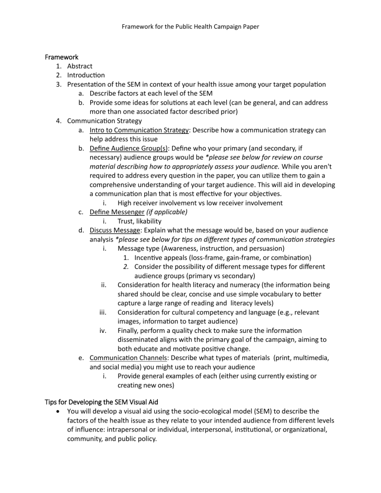 Framework for the Public Health Campaign Paper Framework 1. Abstract 2. Introduction 3. Presentation of the SEM in context of your health issue among your target population a. Describe factors at each level of the SEM b. Provide some ideas for solutions at each level (can be general, and can address more than one associated factor described prior) 4. Communication Strategy a. Intro to Communication Strategy: Describe how a communication strategy can help address this issue b. Define Audience Group(s): Define who your primary (and secondary, if necessary) audience groups would be *please see below for review on course material describing how to appropriately assess your audience. While you aren't required to address every question in the paper, you can utilize them to gain a comprehensive understanding of your target audience. This will aid in developing a communication plan that is most effective for your objectives. i. High receiver involvement vs low receiver involvement c. Define Messenger (if applicable) i. Trust, likability d. Discuss Message: Explain what the message would be, based on your audience analysis *please see below for tips on different types of communication strategies i. Message type (Awareness, instruction, and persuasion) 1. Incentive appeals (loss-frame, gain-frame, or combination) 2. Consider the possibility of different message types for different audience groups (primary vs secondary) ii. Consideration for health literacy and numeracy (the information being shared should be clear, concise and use simple vocabulary to better capture a large range of reading and literacy levels) iii. Consideration for cultural competency and language (e.g., relevant images, information to target audience) iv. Finally, perform a quality check to make sure the information disseminated aligns with the primary goal of the campaign, aiming to both educate and motivate positive change. e. Communication Channels: Describe what types of materials (print, multimedia, and social media) you might use to reach your audience i. Provide general examples of each (either using currently existing or creating new ones) Tips for Developing the SEM Visual Aid You will develop a visual aid using the socio-ecological model (SEM) to describe the factors of the health issue as they relate to your intended audience from different levels of influence: intrapersonal or individual, interpersonal, institutional, or organizational, community, and public policy. Framework for the Public Health Campaign Paper You will also propose solutions to address the issue at each level of the SEM. This SEM will be the basis for the communication strategy, which you will use to share information about the issue and potential strategies with your identified audiences. The visual aid can be placed within the paper (under the presentation of the SEM) or at the end of the paper within the Appendix. Tips for Assessing the Audience What does the intended audience already know about the topic? Do intended audience members have any misconceptions? What are the intended audience members’ relevant attitudes, beliefs, and perceptions of barriers to change? How “ready” is the intended audience to change? What benefit do intended audience members already associate with making the behavior change? What social, cultural, and economic factors will affect program development and delivery? When and where (times, places, states of mind) can the intended audience best be reached? What communication channels (e.g., mass media, organization meetings, internet sites) reach this intended audience? Which do its members prefer and find credible? certain individuals (or gatekeepers) have particular influence with this intended audience or control access to it? What is their degree of influence? And who are these individuals (elders, religious leaders, etc.)? What are the intended audience’s preferences in terms of learning styles, appeals, language, and tone? Tips for Successfully Developing the Message I would suggest to begin with a (very) brief discussion of the message type you think is best to use (between awareness, instruction, and persuasion): Taken from the text titled ‘Developing effective media campaigns for health promotion’, awareness messages inform people about what to do, specify who should do it, and provide cues about when and where it should be done, instruction messages present “how to do it” information, and persuasive messages feature convincing reasons why the audience should adopt the advocated action or avoid the proscribed behavior. Furthermore, there are a few strategies for persuasive message types that you could touch upon in your paper (if you plan to use a persuasive message strategy and deem it appropriate). They include incentive appeals: negative appeals (loss-framed messages which are designed to motivate behavior change by threatening the audience with harmful outcomes from initiating or continuing an unhealthy practice), positive appeals (gain framed messages that can promise positive outcomes for performing the healthy alternative), or a combination of both. Framework for the Public Health Campaign Paper Lastly, consider how the evidence is presented (are you focusing more on experiences and qualitative information or statistics) and is relevant to the situation experienced by the target audience.