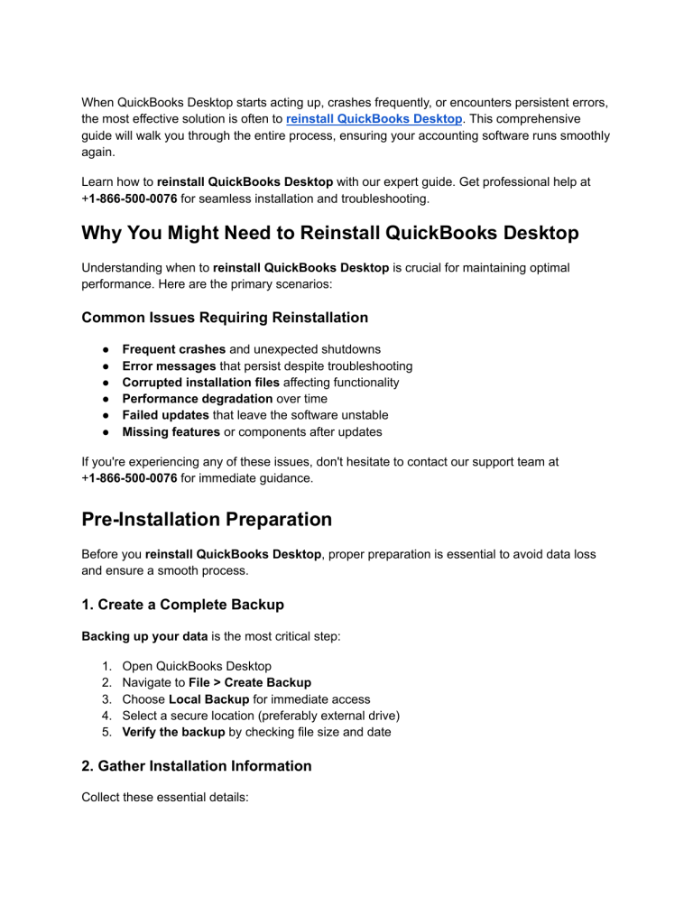 When QuickBooks Desktop starts acting up, crashes frequently, or encounters persistent errors, the most effective solution is often to reinstall QuickBooks Desktop. This comprehensive guide will walk you through the entire process, ensuring your accounting software runs smoothly again. Learn how to reinstall QuickBooks Desktop with our expert guide. Get professional help at +1-866-500-0076 for seamless installation and troubleshooting. Why You Might Need to Reinstall QuickBooks Desktop Understanding when to reinstall QuickBooks Desktop is crucial for maintaining optimal performance. Here are the primary scenarios: Common Issues Requiring Reinstallation ● ● ● ● ● ● Frequent crashes and unexpected shutdowns Error messages that persist despite troubleshooting Corrupted installation files affecting functionality Performance degradation over time Failed updates that leave the software unstable Missing features or components after updates If you're experiencing any of these issues, don't hesitate to contact our support team at +1-866-500-0076 for immediate guidance. Pre-Installation Preparation Before you reinstall QuickBooks Desktop, proper preparation is essential to avoid data loss and ensure a smooth process. 1. Create a Complete Backup Backing up your data is the most critical step: 1. Open QuickBooks Desktop 2. Navigate to File > Create Backup 3. Choose Local Backup for immediate access 4. Select a secure location (preferably external drive) 5. Verify the backup by checking file size and date 2. Gather Installation Information Collect these essential details: ● ● ● ● ● QuickBooks version and year License number and product key User credentials and passwords Payroll subscription information Third-party integrations list For assistance with backup procedures, call +1-866-500-0076. How to Uninstall QuickBooks Desktop Properly To reinstall QuickBooks Desktop successfully, you must first remove the existing installation completely. Method 1: Using Windows Control Panel 1. Press Windows + R to open Run dialog 2. Type "appwiz.cpl" and press Enter 3. Locate QuickBooks in the programs list 4. Right-click and select "Uninstall" 5. Follow the prompts to complete removal 6. Restart your computer when prompted Method 2: Using QuickBooks Clean Uninstall Tool For stubborn installations, use the QuickBooks Clean Uninstall Tool: 1. Download the tool from Intuit's official website 2. Run as administrator for full permissions 3. Select your QuickBooks version 4. Wait for complete removal (may take 15-30 minutes) 5. Restart your system Step-by-Step Guide to Reinstall QuickBooks Desktop Now that you've properly removed the old installation, follow these steps to reinstall QuickBooks Desktop: Phase 1: Download and Preparation 1. Visit the official Intuit website 2. Navigate to QuickBooks Desktop downloads 3. Select your specific version (Pro, Premier, Enterprise) 4. Download the installer to your desktop 5. Temporarily disable antivirus to prevent conflicts Phase 2: Installation Process 1. Right-click the installer and select "Run as administrator" 2. Accept the license agreement after reading 3. Choose installation location (default recommended) 4. Select installation type: ○ Express: Quick setup with default settings ○ Custom: Advanced options for experienced users 5. Enter your license information when prompted 6. Wait for installation completion (typically 10-20 minutes) Phase 3: Post-Installation Setup 1. Launch QuickBooks Desktop 2. Register your software with license key 3. Update to latest version through Help menu 4. Configure user preferences 5. Test basic functionality Need help during installation? Call +1-866-500-0076 for real-time support. Restoring Your Data After Reinstalling Once you've successfully reinstalled QuickBooks Desktop, restoring your data is the next crucial step: Data Restoration Process 1. Open QuickBooks Desktop 2. Go to File > Open or Restore Company 3. Select "Restore a backup copy" 4. Navigate to your backup location 5. Choose the most recent backup file 6. Follow restoration prompts 7. Verify data integrity by checking key reports Post-Restoration Verification After restoration, verify these elements: ● Customer and vendor lists ● Chart of accounts accuracy ● Recent transactions ● Payroll data (if applicable) ● Custom settings and preferences Troubleshooting Common Reinstallation Issues Even with careful preparation, you might encounter challenges when you reinstall QuickBooks Desktop: Installation Errors and Solutions Error 1935: Assembly component failure ● Solution: Run Windows Update and restart ● Alternative: Contact +1-866-500-0076 for advanced troubleshooting Error 1603: Fatal error during installation ● Solution: Clear temporary files and retry ● Prevention: Ensure sufficient disk space Error 1904: Module failed to register ● Solution: Re-register Windows modules ● Expert help: Available at +1-866-500-0076 Performance Issues After Reinstallation If QuickBooks runs slowly after reinstallation: 1. Optimize company file using built-in utilities 2. Update graphics drivers 3. Increase available RAM 4. Check for conflicting software Conclusion Successfully reinstalling QuickBooks Desktop requires careful planning, proper execution, and thorough testing. By following this comprehensive guide, you can restore your accounting software to optimal performance. Remember, professional support is always available at +1-866-500-0076 whenever you need assistance with the reinstallation process. Don't let QuickBooks issues disrupt your business operations. Whether you're dealing with installation errors, data restoration challenges, or performance problems, our expert team is ready to help you reinstall QuickBooks Desktop efficiently and securely. Frequently Asked Questions 1. How long does it take to reinstall QuickBooks Desktop? The complete process typically takes 45-90 minutes, including uninstallation, reinstallation, and data res