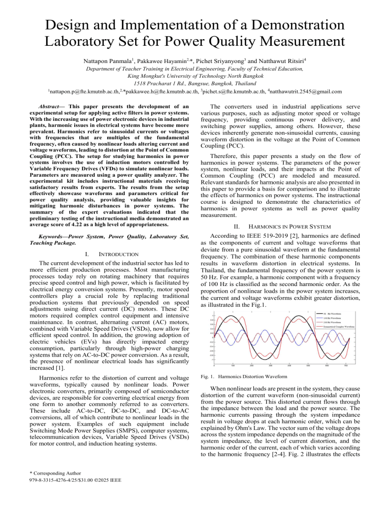 Design and Implementation of a Demonstration Laboratory Set for Power Quality Measurement Nattapon Panmala1, Pakkawee Hayamin2,*, Pichet Sriyanyong3 and Natthawut Ritsiri4 Department of Teacher Training in Electrical Engineering, Faculty of Technical Education, King Mongkut's University of Technology North Bangkok 1518 Pracharat 1 Rd., Bangsue, Bangkok, Thailand 1 nattapon.p@fte.kmutnb.ac.th,2,*pakkawee.h@fte.kmutnb.ac.th, 3pichet.s@fte.kmutnb.ac.th, 4natthawutrit.2545@gmail.com Abstract— This paper presents the development of an experimental setup for applying active filters in power systems. With the increasing use of power electronic devices in industrial plants, harmonic issues in electrical systems have become more prevalent. Harmonics refer to sinusoidal currents or voltages with frequencies that are multiples of the fundamental frequency, often caused by nonlinear loads altering current and voltage waveforms, leading to distortion at the Point of Common Coupling (PCC). The setup for studying harmonics in power systems involves the use of induction motors controlled by Variable Frequency Drives (VFDs) to simulate nonlinear loads. Parameters are measured using a power quality analyzer. The experimental kit includes instructional materials receiving satisfactory results from experts. The results from the setup effectively showcase waveforms and parameters critical for power quality analysis, providing valuable insights for mitigating harmonic disturbances in power systems. The summary of the expert evaluations indicated that the preliminary testing of the instructional media demonstrated an average score of 4.22 as a high level of appropriateness. Keywords—Power System, Power Quality, Laboratory Set, Teaching Package. I. INTRODUCTION The current development of the industrial sector has led to more efficient production processes. Most manufacturing processes today rely on rotating machinery that requires precise speed control and high power, which is facilitated by electrical energy conversion systems. Presently, motor speed controllers play a crucial role by replacing traditional production systems that previously depended on speed adjustments using direct current (DC) motors. These DC motors required complex control equipment and intensive maintenance. In contrast, alternating current (AC) motors, combined with Variable Speed Drives (VSDs), now allow for efficient speed control. In addition, the growing adoption of electric vehicles (EVs) has directly impacted energy consumption, particularly through high-power charging systems that rely on AC-to-DC power conversion. As a result, the presence of nonlinear electrical loads has significantly increased [1]. Harmonics refer to the distortion of current and voltage waveforms, typically caused by nonlinear loads. Power electronic converters, primarily composed of semiconductor devices, are responsible for converting electrical energy from one form to another commonly referred to as converters. These include AC-to-DC, DC-to-DC, and DC-to-AC conversions, all of which contribute to nonlinear loads in the power system. Examples of such equipment include Switching Mode Power Supplies (SMPS), computer systems, telecommunication devices, Variable Speed Drives (VSDs) for motor control, and induction heating systems. * Corresponding Author 979-8-3315-4276-4/25/$31.00 2025 IEEE The converters used in industrial applications serve various purposes, such as adjusting motor speed or voltage frequency, providing continuous power delivery, and switching power supplies, among others. However, these devices inherently generate non-sinusoidal currents, causing waveform distortion in the voltage at the Point of Common Coupling (PCC). Therefore, this paper presents a study on the flow of harmonics in power systems. The parameters of the power system, nonlinear loads, and their impacts at the Point of Common Coupling (PCC) are modeled and measured. Relevant standards for harmonic analysis are also presented in this paper to provide a basis for comparison and to illustrate the effects of harmonics on power systems. The instructional course is designed to demonstrate the characteristics of harmonics in power systems as well as power quality measurement. II. HARMONICS IN POWER SYSTEM According to IEEE 519-2019 [2], harmonics are defined as the components of current and voltage waveforms that deviate from a pure sinusoidal waveform at the fundamental frequency. The combination of these harmonic components results in waveform distortion in electrical systems. In Thailand, the fundamental frequency of the power system is 50 Hz. For example, a harmonic component with a frequency of 100 Hz is classified as the second harmonic order. As the proportion of nonlinear loads in the power system increases, the current and voltage waveforms exhibit greater distortion, as illustrated in the Fig.1. Fig. 1. Harmonics Distortion Waveform When nonlinear loads are present in the system, they cause distortion of the current waveform (non-sinusoidal current) from the power source. This distorted current flows through the impedance between the load and the power source. The harmonic currents passing through the system impedance result in voltage drops at each harmonic order, which can be explained by Ohm's Law. The vector sum of the voltage drops across the system impedance depends on the magnitude of the system impedance, the level of current distortion, and the harmonic order of the current, each of which varies according to the harmonic frequency [2-4]. Fig. 2 illustrates the effects of harmonic currents on the system impedance and the resulting voltage drops at various points [5]. It can be observed that the total harmonic distortion of voltage (%THDv) calculated as the vector sum of each harmonic order decreases at the power source. This behavior is primarily due to the impedance that exists between the nonlinear load and the source. standards for efficient and safe operatio