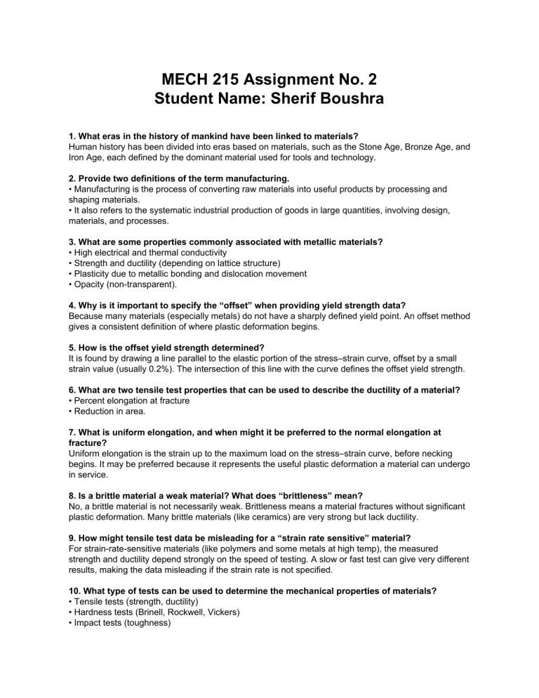 MECH 215 Assignment No. 2 Student Name: Sherif Boushra 1. What eras in the history of mankind have been linked to materials? Human history has been divided into eras based on materials, such as the Stone Age, Bronze Age, and Iron Age, each defined by the dominant material used for tools and technology. 2. Provide two definitions of the term manufacturing. • Manufacturing is the process of converting raw materials into useful products by processing and shaping materials. • It also refers to the systematic industrial production of goods in large quantities, involving design, materials, and processes. 3. What are some properties commonly associated with metallic materials? • High electrical and thermal conductivity • Strength and ductility (depending on lattice structure) • Plasticity due to metallic bonding and dislocation movement • Opacity (non-transparent). 4. Why is it important to specify the “offset” when providing yield strength data? Because many materials (especially metals) do not have a sharply defined yield point. An offset method gives a consistent definition of where plastic deformation begins. 5. How is the offset yield strength determined? It is found by drawing a line parallel to the elastic portion of the stress–strain curve, offset by a small strain value (usually 0.2%). The intersection of this line with the curve defines the offset yield strength. 6. What are two tensile test properties that can be used to describe the ductility of a material? • Percent elongation at fracture • Reduction in area. 7. What is uniform elongation, and when might it be preferred to the normal elongation at fracture? Uniform elongation is the strain up to the maximum load on the stress–strain curve, before necking begins. It may be preferred because it represents the useful plastic deformation a material can undergo in service. 8. Is a brittle material a weak material? What does “brittleness” mean? No, a brittle material is not necessarily weak. Brittleness means a material fractures without significant plastic deformation. Many brittle materials (like ceramics) are very strong but lack ductility. 9. How might tensile test data be misleading for a “strain rate sensitive” material? For strain-rate-sensitive materials (like polymers and some metals at high temp), the measured strength and ductility depend strongly on the speed of testing. A slow or fast test can give very different results, making the data misleading if the strain rate is not specified. 10. What type of tests can be used to determine the mechanical properties of materials? • Tensile tests (strength, ductility) • Hardness tests (Brinell, Rockwell, Vickers) • Impact tests (toughness) • Creep and fatigue tests (time-dependent behavior). 11. What are the similarities and differences between the Brinell and Rockwell hardness tests? Similarities: Both measure resistance to indentation and are widely used hardness tests. Differences: • Brinell uses a large ball indenter and measures indentation diameter. • Rockwell uses different indenters (balls or cones) and directly gives a hardness number based on indentation depth. • Rockwell is generally faster and easier, while Brinell is better for coarse structures. 12. What are the attractive features of the Vickers hardness test? • Uses a diamond-shaped indenter (good for very small areas). • Can be applied to all types of materials (soft to very hard). • Produces results that are independent of indenter size. • Suitable for microhardness testing, thin films, and small parts.