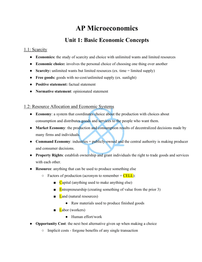 AP Microeconomics Unit 1: Basic Economic Concepts 1.1: Scarcity ● Economics: the study of scarcity and choice with unlimited wants and limited resources ● Economic choice: involves the personal choice of choosing one thing over another ● Scarcity: unlimited wants but limited resources (ex. time = limited supply) ● Free goods: goods with no-cost/unlimited supply (ex. sunlight) ● Positive statement: factual statement ● Normative statement: opinionated statement 1.2: Resource Allocation and Economic Systems ● Economy: a system that coordinates choice about the production with choices about consumption and distributes goods and services to the people who want them. ● Market Economy: the production and consumption results of decentralized decisions made by many firms and individuals. ● Command Economy: industries = publicly-owned and the central authority is making producer and consumer decisions. ● Property Rights: establish ownership and grant individuals the right to trade goods and services with each other. ● Resource: anything that can be used to produce something else ○ Factors of production (acronym to remember = CELL): ■ Capital (anything used to make anything else) ■ Entrepreneurship (creating something of value from the prior 3) ■ Land (natural resources) ● Raw materials used to produce finished goods ■ Labor (workers) ● Human effort/work ● Opportunity Cost: the next best alternative given up when making a choice ○ Implicit costs - forgone benefits of any single transaction ■ ex. time and effort an owner puts into maintaining a company, rather than expanding it ○ Explicit costs - expenses that are paid with cash or equivalent ■ ex. wages to workers, electricity bill ★ Microeconomics: individuals/firms making decisions and how these interact ○ ex. college vs job, car industry, etc ★ Macroeconomics: overall ups and downs of the economy (aggregates) ○ ex. employment, inflation, etc 1.3: Production Possibilities Curve (PPC) ● Trade-off: giving up something for something else ● PPC: illustrates trade-offs an economy that compares only two goods faces ○ Show the opportunity cost of producing more of one good ○ Illustrate economic growth or contraction Increasing oppt. Cost PPC Constant oppt. Cost PPC ○ ● Efficiency: The point at which there are no missed opportunities; cannot make someone better off without making someone else worse off ● Productive efficiency: lowest cost possible on PPC ● Allocative efficiency: The economy allocates resources so that consumers are as well off as possible/producing what is demanded. ● Increasing Opportunity Costs: concave PPC ● Economic Growth: allows sustained rise in aggregate output/expansion of PPC outwards ○ Causes: ■ Increase/Development of technology ■ Increase in resources 1.4: Comparative Advantage and Trade ● Trade: people divide work and each provides goods in return for other goods ● Comparative Advantage: a situation in which an individual, business, or country can produce a good or service at a lower opportunity cost than another producer ○ Can’t have a comparative advantage in both goods ● Absolute Advantage: a situation in which an individual, business, or country can produce more of a good or service than any other producer with the same quantity of resources. 1.5: Cost-Benefit Analysis ● Terms of Trade: the rate at which goods can be exchanged ○ Mutually beneficial between opportunity costs of the 2 individuals ○ Capital goods: goods that make consumer goods ■ more capital goods = more growth in future ○ Consumer goods: goods that are consumed (final goods) 1.6: Marginal Analysis and Consumer Choice ● Marginal decisions: trade-off of doing a little more or a little less ○ Marginal benefit: benefit of producing one more unit ○ Marginal cost: cost of producing one more unit ○ Marginal analysis: the study of the additional benefits vs the additional cost of an activity