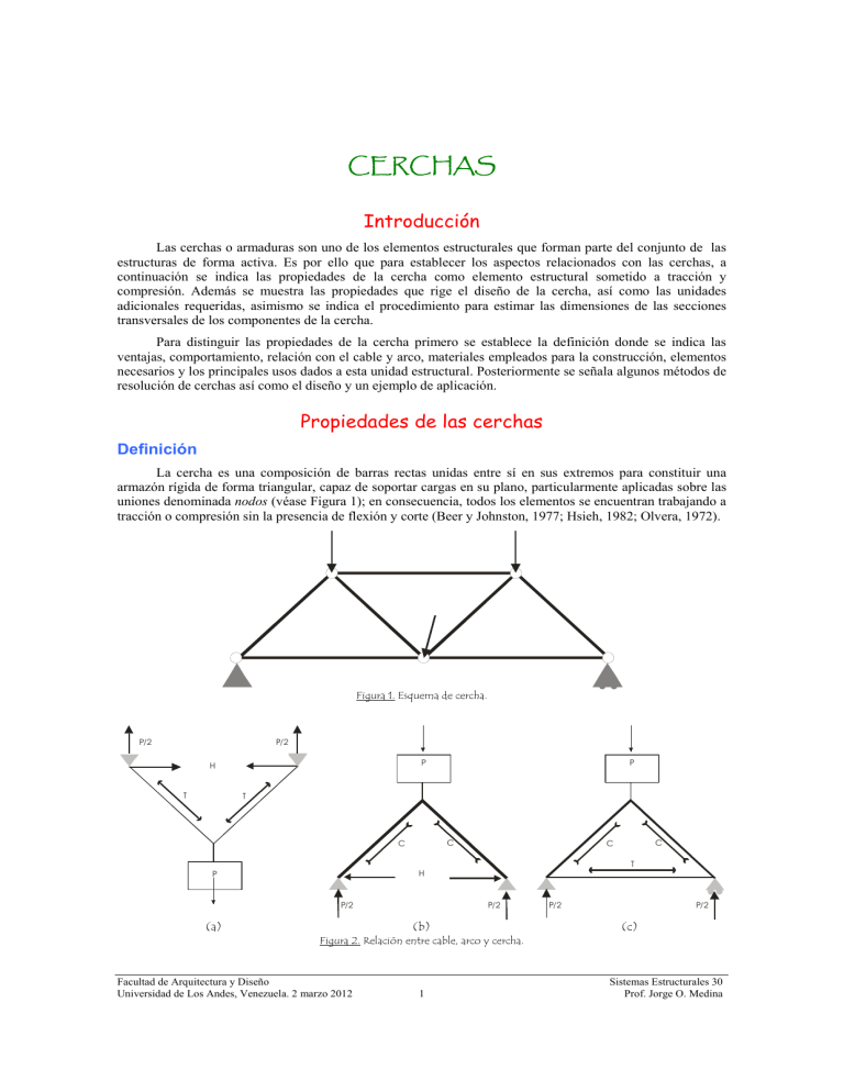 CERCHAS Introducción Las cerchas o armaduras son uno de los elementos estructurales que forman parte del conjunto de las estructuras de forma activa. Es por ello que para establecer los aspectos relacionados con las cerchas, a continuación se indica las propiedades de la cercha como elemento estructural sometido a tracción y compresión. Además se muestra las propiedades que rige el diseño de la cercha, así como las unidades adicionales requeridas, asimismo se indica el procedimiento para estimar las dimensiones de las secciones transversales de los componentes de la cercha. Para distinguir las propiedades de la cercha primero se establece la definición donde se indica las ventajas, comportamiento, relación con el cable y arco, materiales empleados para la construcción, elementos necesarios y los principales usos dados a esta unidad estructural. Posteriormente se señala algunos métodos de resolución de cerchas así como el diseño y un ejemplo de aplicación. Propiedades de las cerchas Definición La cercha es una composición de barras rectas unidas entre sí en sus extremos para constituir una armazón rígida de forma triangular, capaz de soportar cargas en su plano, particularmente aplicadas sobre las uniones denominada nodos (véase Figura 1); en consecuencia, todos los elementos se encuentran trabajando a tracción o compresión sin la presencia de flexión y corte (Beer y Johnston, 1977; Hsieh, 1982; Olvera, 1972). Figura 1. Esquema de cercha. P/2 P/2 P H T P T C C C C T H P P/2 (a) P/2 (b) P/2 P/2 (c) Figura 2. Relación entre cable, arco y cercha. Facultad de Arquitectura y Diseño Universidad de Los Andes, Venezuela. 2 marzo 2012 1 Sistemas Estructurales 30 Prof. Jorge O. Medina Com mportamie ento El triángulo en la forma básica b de la ceercha, esta es uun forma estaable aún con uuniones articulladas (caso contraario del rectánngulo que conn uniones artiiculadas es innestable). La forma establee del triangulo o se puede imagiinar si se partee del análisis de un cable soometido a unaa carga puntuaal (véase Figuura 2a), el cab ble para ser establle requiere de anclajes que soporten el coorte que generra la tensión del d cable en ell apoyo. Si se invierte la formaa del cable see obtiene un arco a que está sometido a ccompresión por ser funicullar de la form ma anterior (véasee Figura 2b), se puede obseervar que las dimensiones d ddel arco son mayores m a las del cable por tratarse de un disseño a compreesión en contrraste al cable que es de traacción. El arcoo requiere tenner los apoyoss fijos para resistiir el empuje hhacia afuera, si se sustituye el apoyo fijo por un tipo dee apoyo que ggarantice la esstabilidad e isostaaticidad (un appoyo fijo y ottro con rodam miento), se neecesita colocarr una barra quue resista el empuje e del arco para p obtener aasí la configuraación básica de d la cercha (vvéase Figura 2c). 2 Las cerchas se dividen seegún su formaa (véase Figurra 3), aunque es casi infiniito el número de formas posiblles que puede tomar. Adem más se dividenn según la aplicación de las condiciones eestáticas de eq quilibrio en isostááticas e hipereestáticas, las primeras p el núúmero total dde barras es b= =2n-3 donde n en el númeero total de nodoss; mientras quue en las seggundas b>2n--3. Otra califiicación es seggún la formaación, la cual puede ser simple, compuestaa y compleja,, la cercha simple se obbtiene de adiicionar barrass a la armad dura básica trianggular, la cerchaa complejas se obtiene de unir u dos o máss cerchas simpples, mientrass que la cerchaa compleja es la que q no se connsidera como ninguna n de laas anteriores (B Beer y Johnstton, 1977; Hsiieh, 1982; Mo oore, 2000; Olverra, 1972; Salvaadori y Hellerr, 1998). Figuraa 3. Algunos tipo os de cercha. No ota. De Comprensión de las Estruccturas en Arquittectura (p. 39), por Moore, F. (20 000). México D.F., México: McG Graw-Hill Interam mericana Editoress, S.A. de C.V. Venttajas La cercha es uno de los principales p tippos de estructturas empleaddos en ingenieería, ya que prroporciona una soolución práctiica y económ mica debido a la ligereza deel peso y grann resistencia ((Beer y Johnsston, 1977; Das, Kassimali K y Sami, 1999). Mate eriales Las cerchas se pueden connstruir en maddera y acero. Elem mentos Una cercha está formada por p los siguientes elementoos: 1. 2. 3. 4. Los mieembros de arriiba cordón supperior. Los mieembros de abaajo cordón infferior. Diagonaales. Verticalles montantes o pendoloness dependiendoo del tipo de fuuerza. Además, enn la cercha ess muy importaante el medioo de unión quue es mediantte remaches, tornillos o soldaddura a una caartela colocadaa en la interseección o nodoo (véase Figurra 4). La carteela impone un na pequeña Facultaad de Arquitecturaa y Diseño Universidad de Los Anddes, Venezuela. 2 marzo 2012 2 Sistemas Estrructurales 30 Prof. Jorg ge O. Medina restricción a la rotación por ello las barras de tracción o compresión pura en los elementos desarrollan una pequeña cantidad de flexión y corte (Beer y Johnston, 1977; Moore, 2000; Salvadori y Heller, 1963). Figura 4. Esquemas de cartela en madera y acero. Usos Las cerchas se emplean cuando se tiene luces libres grandes como puentes, sitios públicos y estadios. Las cerchas paralelas se usan en recintos amplios (véase Figura 5), de cordones superiores curvos se comportan similar a una estructura colgante o un arco y se emplean en algunos puentes (véase Figura 6), en techos y entrepiso se emplean cerchas livianas tal como se indica en la Figura 7, donde se observa un tipo de cercha empleado para techo y entrepiso que corresponde a variaciones realizadas sobre la Warren (véase Figura 3 y 7). El rango de luces de la cercha es de 15 a 30 m para cerchas de madera y 15 a 50 m para cerchas de acero (Beer y Johnston, 1977; Engel, 2001; Nieto, 2006 y Salvadori y Heller, 1998). Figura 5. Tipos de cerchas paralelos. Nota. De Sistemas de Estructuras, por Engel, H.,