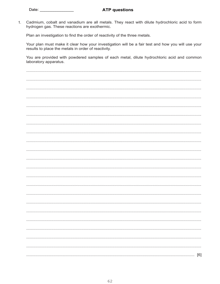 Date: _______________ 1. ATP questions Cadmium, cobalt and vanadium are all metals. They react with dilute hydrochloric acid to form hydrogen gas. These reactions are exothermic. Plan an investigation to find the order of reactivity of the three metals. Your plan must make it clear how your investigation will be a fair test and how you will use your results to place the metals in order of reactivity. ou are provided with powdered samples of each metal, dilute hydrochloric acid and common Y laboratory apparatus. ........................................................................................................................................................... ........................................................................................................................................................... ........................................................................................................................................................... ........................................................................................................................................................... ........................................................................................................................................................... ........................................................................................................................................................... ........................................................................................................................................................... ........................................................................................................................................................... ........................................................................................................................................................... ........................................................................................................................................................... ........................................................................................................................................................... ........................................................................................................................................................... ........................................................................................................................................................... ........................................................................................................................................................... ........................................................................................................................................................... ........................................................................................................................................................... ........................................................................................................................................................... ........................................................................................................................................................... ........................................................................................................................................................... ........................................................................................................................................................... ........................................................................................................................................................... ..................................................................................................................................................... [6] [Turn over 62 2 Cobalt, manganese and nickel are metals. They react with dilute hydrochloric acid to form hydrogen gas. Plan an investigation to find the order of reactivity of these three metals. You are provided with: ●● samples of each metal ●● dilute hydrochloric acid ●● common laboratory apparatus. Your plan must make it clear how your investigation will be a fair test and how you will use your results to place the metals in order of reactivity. ............................................................................................................................................................ ............................................................................................................................................................ ............................................................................................................................................................ ............................................................................................................................................................ ............................................................................................................................................................ ............................................................................................................................................................ ............................................................................................................................................................ ............................................................................................................................................................ ............................................................................................................................................................ ............................................................................................................................................................ ................