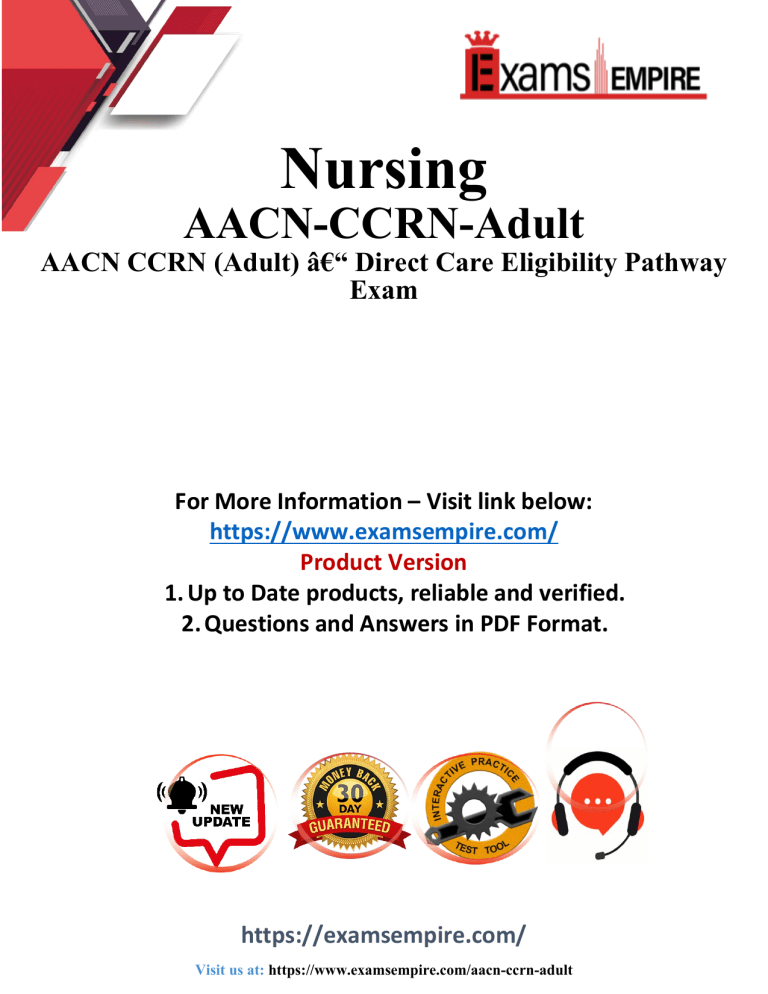 Nursing AACN-CCRN-Adult AACN CCRN (Adult) – Direct Care Eligibility Pathway Exam For More Information – Visit link below: https://www.examsempire.com/ Product Version 1. Up to Date products, reliable and verified. 2. Questions and Answers in PDF Format. https://examsempire.com/ Visit us at: https://www.examsempire.com/aacn-ccrn-adult Latest Version: 6.0 Question: 1 When diagnosing acute pancreatitis, which of the following criteria MUST be present? A. A history of chronic alcohol use and/or gallstones B. Abdominal or epigastric pain that may radiate to the back C. BUN greater than 25 mg/dL D. Serum amylase or lipase values 1 to 3 times above the normal range Answer: B Explanation: Acute pancreatitis is inflammation of the pancreas resulting from premature activation of pancreatic exocrine enzymes. The disease ranges in severity from a mild acute self-limiting form to severe and lifethreatening. The diagnosis of acute pancreatitis is based on at least two of the three following criteria: • characteristic abdominal pain or epigastric pain that may radiate to the back • serum amylase or lipase values 2 to 4 times above the normal range (only useful as a diagnostic tool, and not a measure of severity or disease progression) • characteristic findings on imaging, most often ultrasound imaging A BUN that exceeds 25 mg/dL is a variable in various scoring systems, which can help assess disease severity within the first 24 hours; however, this is not a diagnostic criterion. The leading causes of acute pancreatitis are chronic alcohol use and gallstones, but these are causes, not diagnostic criteria. Question: 2 Which of the follow would BEST describe a secondary brain tumor? A. A tumor arising from the meninges B. A tumor arising from the liver C. A tumor arising from glioblasts D. A tumor arising from neuroblasts Answer: B Explanation: Secondary brain tumors are tumors that develop within the brain but develop from a site outside the brain. Liver cancer that metastasizes to the brain would create a secondary brain tumor. Tumors arising from the meninges, glioblast, or neuroblasts would all be examples of primary brain tumors. Question: 3 Visit us at: https://www.examsempire.com/aacn-ccrn-adult INITIAL management of the patient with upper Gastrointestinal (GI) bleeding would include: A. volume resuscitation B. initiation of treatment to control bleeding within 24 hours of admit C. transfusion D. identification of the site of bleeding Answer: A Explanation: The primary goal for initial management of the patient in this scenario is volume resuscitation. However, hemodynamic stabilization, identification of the bleeding site, and control of bleeding are all key points for managing the patient with upper GI bleeding. Assessment of vital signs is the most reliable reflection of blood loss. If the patient is hemodynamically stable, resuscitation begins with the initiation of 2–3 L of crystalloid. Blood products are considered if the response to fluid resuscitation is poor. Question: 4 The nurse is caring for a patient who has had a significant transfusion reaction. Which of the following would be the MOST immediate priority for the nurse? A. Calling for a STAT X-ray B. Stopping the transfusion C. Administering diphenhydramine D. Slowing the transfusion rate Answer: B Explanation: The correct response when a transfusion reaction is suspected is to stop the transfusion to prevent the introduction of any further potentially harmful blood products. Diphenhydraminemight be used to treat allergic symptoms, but it's not the first action. A STAT X-ray is not immediately necessary in a transfusion reaction. Continuing the transfusion, even at a slower rate, could exacerbate the reaction. Question: 5 Which of the following BEST defines a patients' family? A. Any loving, supportive person regardless of legal or social boundaries B. Anyone to whom the patient is biologically related to and their spouse if they are married C. Anyone identified as family in the patient's advanced directives D. Anyone who is a part of the patient's nuclear family Answer: A Visit us at: https://www.examsempire.com/aacn-ccrn-adult Explanation: The technical definition of a patient's family according the AACN is any loving, supportive person regardless of legal or social boundaries. Family is not limited to a patient's nuclear family or to those who are biologically related to the patient or related through marriage. While the patient should ideally identify those they view as family, the patient's advanced directives are not the tool through which they will do this. Question: 6 The nurse reads a journal article outlining research on a new technique for inserting IVs. The research is rigorous and the new technique has been shown to improve patient outcomes while not increasing the risks to the patient. Which of the following responses by the nurse is BEST? A. Wait until they see at least two other sources that replicate these findings B. Begin implementing the new technique into their own practice C. Wait to implement the technique in their own practice until it becomes more mainstream D. Avoid implementing the new technique until there is stronger evidence that it is beneficial to patients Answer: B Explanation: If a new technique has been shown to improve patient outcomes while not increasing the risks to the patient through rigorous research, then the nurse can consider implementing the new technique into their own practice. It is not necessary to wait to implement the technique in their own practice until it becomes more mainstream or until it becomes more common in the literature. Question: 7 Which of the following statements made by a student nurse indicates that they understand the pathology of cardiac tamponade? A. Cardiac tamponade may cause severe distress, but rarely causes death. B. A cardiac tamponade can occur when the heart is compressed by fluid building up anywhere in the thoracic cavity. C. Chest x-ray is th