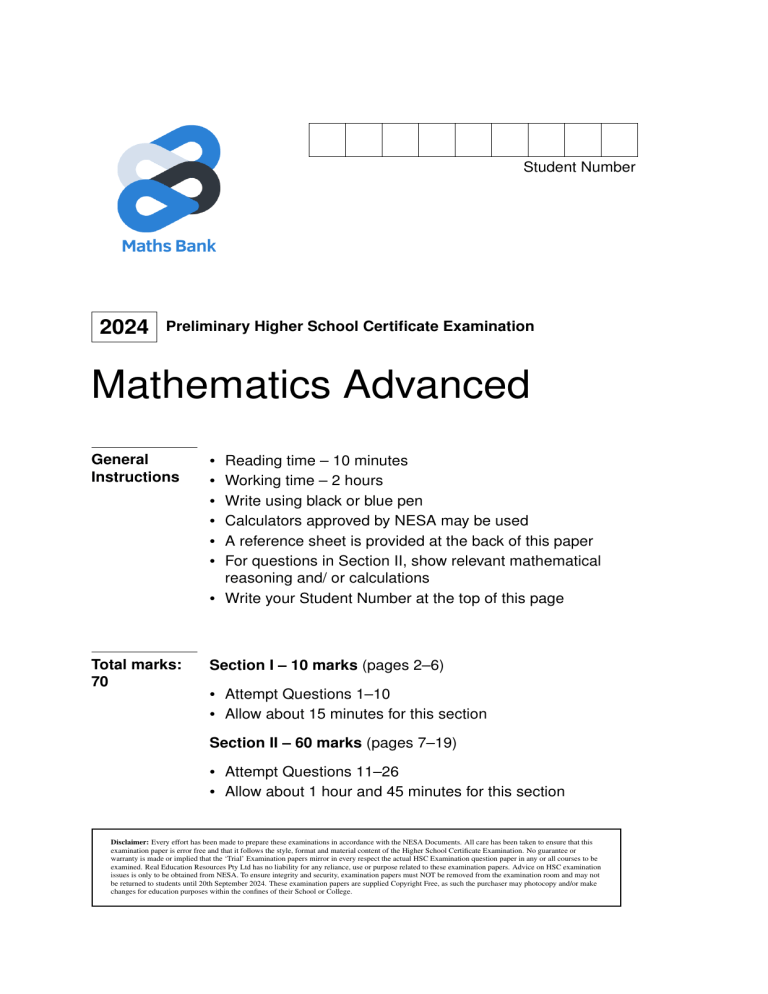 Student Number 2024 Preliminary Higher School Certificate Examination Mathematics Advanced General Instructions • Reading time – 10 minutes • Working time – 2 hours • Write using black or blue pen • Calculators approved by NESA may be used • A reference sheet is provided at the back of this paper • For questions in Section II, show relevant mathematical reasoning and/ or calculations • Write your Student Number at the top of this page Total marks: 70 Section I – 10 marks (pages 2–6) • Attempt Questions 1–10 • Allow about 15 minutes for this section Section II – 60 marks (pages 7–19) • Attempt Questions 11–26 • Allow about 1 hour and 45 minutes for this section Disclaimer: Every effort has been made to prepare these examinations in accordance with the NESA Documents. All care has been taken to ensure that this examination paper is error free and that it follows the style, format and material content of the Higher School Certificate Examination. No guarantee or warranty is made or implied that the ‘Trial’ Examination papers mirror in every respect the actual HSC Examination question paper in any or all courses to be examined. Real Education Resources Pty Ltd has no liability for any reliance, use or purpose related to these examination papers. Advice on HSC examination issues is only to be obtained from NESA. To ensure integrity and security, examination papers must NOT be removed from the examination room and may not be returned to students until 20th September 2024. These examination papers are supplied Copyright Free, as such the purchaser may photocopy and/or make changes for education purposes within the confines of their School or College. Section I 10 marks Attempt Questions 1–10 Allow about 15 minutes for this section Use the multiple-choice answer sheet for Questions 1–10. Question 1 Maths Bank ? Consider the functions f pxq “ ´x2 and g pxq “ x. Which of the following represents the graph of y “ f pg pxqq? B.Maths Bank A.Maths Bank y y x O O x D.Maths Bank C.Maths Bank y y O x O –2– x Question 2 Maths Bank $ 2 ’ &x ´ 1 Consider the function f pxq “ 3 ´ 5x ’ % 2 xď0 0ăxď3 xą3 What is the solution to the equation f pxq “ ´3? A. x “ ´2 1 B. x “ 5 6 C. x “ 5 D. x “ 2 Question 3 Maths Bank Consider the curve shown below: y ´1 1 O 4 ´8 Which of the following best represents the equation of the curve? A. y “ 2x3 ´ 8x ´ 2x ` 8 B. y “ ´2x3 ` 8x2 ` 2x ´ 8 C. y “ ´2x3 ´ 8x2 ` 2x ` 8 D. y “ 2x3 ` 8x2 ´ 2x ´ 8 Question 4 Maths Bank 1 ´ 3x The angle between the line y “ and the positive x-axis is θ . 2 What is the value of θ , correct to the nearest degree? A. 34˝ B. 56˝ C. 124˝ D. 146˝ –3– x Question 5 Maths Bank The diagram below shows the circle x2 ` py ´ 2q2 “ 1 and the parabola y “ ax2 , where a is a positive constant. The circle and the parabola intersect at two points A and B. y A 2 B O x How many solutions exist to the equation y ` py ´ 2q2 “ 1? a A. 1 B. 2 C. 3 D. 4 Question 6 Maths Bank π 2 It is known that cos θ “ , where 0 ă θ ă . 3 2 ˆ ˙ 3π What is the exact value of sin ´θ ? 2 2 A. ´ ? 5 2 B. ´ 3 2 C. 3 2 D. ? 5 –4– Question 7 Maths Bank The sector of radius 13 cm shown below has an arc length of 18 cm. 18 cm 13 cm What is the area of the sector? A. 84.5 cm2 B. 117 cm2 C. 162 cm2 D. 234 cm2 Question 8 Maths Bank The graph of the function y “ e2x is shown. y A 2 O Which of the following is true at the point A? A. f pxq ă f 1 pxq ă 0 B. f 1 pxq ă f pxq ă 0 C. 0 ă f pxq ă f 1 pxq D. 0 ă f 1 pxq ă f pxq –5– x Question 9 Maths Bank Consider the statements: I. If two events, A and B, are independent, then P pA X Bq “ P pAq ˆ P pBq. II. If two events, A and B, are mutually exclusive, then P pA Y Bq “ 1. Which of the following is correct? A. Neither statement I nor statement II are always true. B. Only statement I is always true. C. Only statement II is always true. D. Both statements I and II are always true. Question 10 Maths Bank A fair four-sided die is rolled. Let X be the discrete random variable representing the number that appears face down on the die after it is rolled. The probability distribution of the discrete random variable X is shown. x 1 2 3 4 P pX “ xq 0.25 0.25 0.25 0.25 What is the value of Var pXq? A. 1.25 B. 2.5 C. 5 D. 7.5 –6– Section II 60 marks Attempt Questions 11–26 Allow about 1 hour and 45 minutes for this section Answer each question in the space provided. Extra writing booklets are available. For questions in Section II, your responses should include relevant mathematical reasoning and/or calculations. Question 11 (2 marks) ? ? ? 6 ` 3 10 ? Find the value of a such that “ 3 2 ` a. 2 2 .............................................................................. .............................................................................. .............................................................................. .............................................................................. .............................................................................. .............................................................................. Question 12 (2 marks) Maths Bank Solve |2x ´ 7| “ 3. 2 .............................................................................. .............................................................................. .............................................................................. .............................................................................. .............................................................................. .............................................................................. –7– Question 13 (4 marks) Maths Bank Lines ℓ1 and ℓ2 have the equations 3x ´ y ` 7 “ 0 and x ` 3y ´ 11 “ 0, respectively. The lines intersect at point P. (a) 2 Find the coordinates of P. ..........................