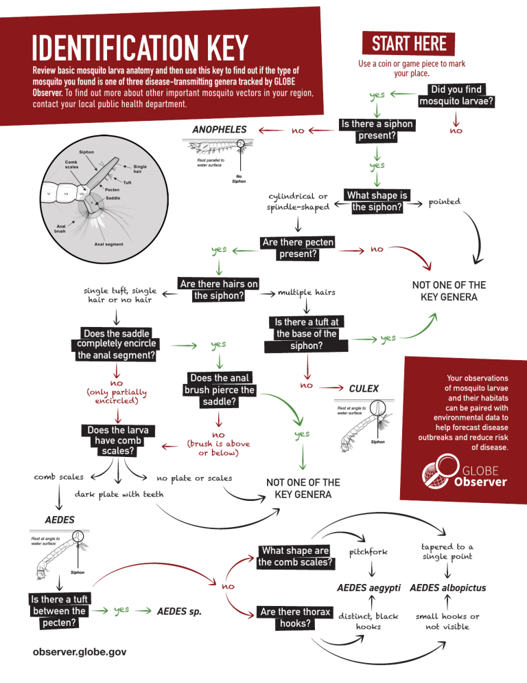 IDENTIFICATION KEY START HERE Use a coin or game piece to mark your place. Review basic mosquito larva anatomy and then use this key to find out if the type of mosquito you found is one of three disease-transmitting genera tracked by GLOBE Observer. To find out more about other important mosquito vectors in your region, contact your local public health department. ANOPHELES no yes Did you find mosquito larvae? Is there a siphon present? no yes spindle-shaped What shape is the siphon? Are there pecten present? no cylindrical or yes single tuft, single hair or no hair Are there hairs on the siphon? multiple hairs yes Is there a tuft at the base of the siphon? Does the saddle completely encircle the anal segment? no (only partially encircled) Does the larva have comb scales? comb scales Does the anal brush pierce the saddle? no no yes (brush is above or below) no plate or scales dark plate with teeth pointed NOT ONE OF THE KEY GENERA yes CULEX Your observations of mosquito larvae and their habitats can be paired with environmental data to help forecast disease outbreaks and reduce risk of disease. NOT ONE OF THE KEY GENERA AEDES What shape are the comb scales? Is there a tuft between the pecten? no yes observer.globe.gov AEDES sp. pitchfork tapered to a single point AEDES aegypti AEDES albopictus Are there thorax hooks? distinct, black hooks small hooks or not visible