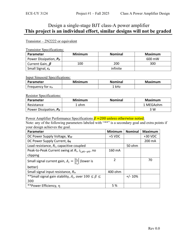 ECE-UY 3124 Project #1 – Fall 2025 Class A Power Amplifier Design Design a single-stage BJT class-A power amplifier This project is an individual effort, similar designs will not be graded Transistor – 2N2222 or equivalent Transistor Specifications: Parameter Power Dissipation, PD Current Gain, Small Signal, ro Minimum Nominal 100 200 infinite Input Sinusoid Specifications: Parameter Minimum Frequency for vin Resistor Specifications: Parameter Resistance Power Dissipation, PD Minimum 1 ohm Maximum 600 mW 300 Nominal 1 kHz Maximum Nominal Maximum 1 MEGAohm 3W Power Amplifier Performance Specifications 𝛽 200 unless otherwise noted: Note: any of the following parameters labeled with “**” is a secondary goal and extra points if your design achieves the goal. Parameter Minimum Nominal Maximum DC Power Supply Voltage, VCC +5 VDC +30 VDC DC Power Supply Current, IPS 200 mA Load resistance, RL, capacitive coupled 50 ohm Peak-to-Peak Current swing at RL, 𝑖 , , no 160 mA clipping 2 70 Small signal current gain, 𝐴 (lower is better) Small signal input resistance, Rin **Small signal gain stability, 𝐴 , over 100 300 **Power Efficiency, 400 ohm 𝛽 +/- 10% 5% Rev 0.0 ECE-UY 3124 Project #1 – Fall 2025 Class A Power Amplifier Design Design Notes: To change the value in CircuitLab, select 2N2222 and change “B_F” to the value required. Resistors can have any value at this point in the design. You don’t need to adhere to industry standard values unless you want to (could be helpful later). If you calculate a resistor of 2 ohms or less, then you probably don’t need this one. When calculating the DC operation of your circuit, it could be helpful to use VBEQ = 0.8V. At the higher ICQ values, the B-E voltage increases beyond 0.7V. There will be differences between your hand calculations and the PSpice results. Enter you hand-calculated design into PSpice and slightly adjust the resistor(s) until you achieve the required specifications in PSpice. When performing a transient analysis, it is best to set “maximum step size” to 0.01msec and simulate over a range of 3 msec. PART 1: HAND CALCULATIONS A. Submit all hand calculations for your design. It is important to show how you decided on your resistor values and operating conditions. If you are looking for extra points on a stable DC and/or AC design, you need to show the equations that support your assumption for stability. B. What is your calculated power conversion efficiency, ? Show all the steps for this calculation. C. Draw (by hand) your complete schematic with the final resistor values. D. Draw a plot of the AC and DC load lines on the same iC versus vCE graph. Clearly show the x- and y-intercepts, with values, for each. Clearly label the Q point. Load line calculations can assume that = infinite ( = 1). E. In a table, list your DC bias parameters; VCC, ICQ, VCEQ, PD, transistor? F. In a table, and for a value of = 200, list your calculated small signal current gain, Ai, Input Resistance, Rin, and Output Resistance, Rout. Show complete schematic used for calculating Rout.. G. What is your maximum peak-to-peak current at the load? Show the calculation. Rev 0.0 ECE-UY 3124 Project #1 – Fall 2025 Class A Power Amplifier Design H. In a table, list the resistor values and associated power dissipation for all resistors in your design. PART 2: PSPICE SIMULATIONS: A. SCHEMATIC: Submit your PSpice schematic clearly showing all values for DC voltage, DC current and DC Power for each element. All resistor values must clearly be shown on the schematic. B. SIMULATED DC BIAS: What are the simulated DC bias parameters, ICQ, VCEQ, VBEQ and transistor Power Dissipation, PD, transistor? Submit a table comparing your handcalculated values to the simulated values for ICQ, VCEQ, VBEQ, and PD, transistor. C. SIMULATED POWER SUPPLY BIAS: What is the total current delivered from the supply, IPS? Did you achieve the specification for maximum current? D. SIMULATED CURRENT SWING: Simulate your design in PSpice using a 1kHz sinusoidal input, use a voltage source with a 1 kohm source resistor as shown above. Place a current probe on the wire leading into your circuit (on the left side of the capacitor). What is the largest peak-to-peak swing in the output current, iL, through the 50 ohm load resistance? To find the maximum swing, you should slowly increase the source amplitude until the output current waveform begins to clip at the top or the bottom. Unless you have a design optimized for maximum symmetrical swing, it’s most likely that the clipping will not be symmetrical. In other words, the point of clipping in the positive peak current will be different from the negative peak current. Submit a plot showing iL with clipping using a = 200. When clipping occurs, chose the smaller of the two values and double this value, this is the peak-to-peak swing in the output current, iL. Clearly report this peak-to-peak swing in the output current, iL. Did your design achieve the 180mA peak-to-peak swing? E. SIMULATED EFFICIENCY: Using the peak swing in load current, iL (just below clipping), and load resistance, 50 ohms, calculate the simulated power conversion efficiency, ? You will need the total power supply current, IPS, from your simulation. Show all your calculations using data recorded from your simulated plots. Compare the hand-calculated value to the simulated value. F. SIMULATED SMALL SIGNAL OPERATION: Using PSpice, reduce the input source amplitude so that it is should be small enough to operate your transistor in the small signal region. Verify that the peak AC voltage across the Base-Emitter (B-E) junction, vbe, is less than 2.6mV peak (<<26mV). Take the difference between two voltage probes placed at the base and the emitter. You may need to subtract off any DC offset so you only see the sinusoidal portion of the vBE waveform. If vbe is greater than 2.6mV, decrease the source amplitude until the B-E voltage is in the small signal range. Reco