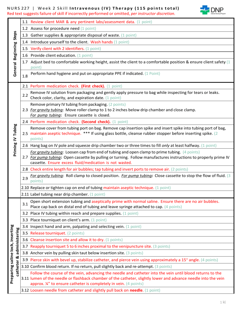 N U R S 227 | W e e k 2 S k i l l I n t r a v e n o u s ( I V ) T h e r a p y ( 1 1 5 p o i n t s t o t a l ) Red text suggests failure of skill if incorrectly performed or omitted, per instructor discretion. General Beginning Steps 1.1 Review client MAR & any pertinent labs/assessment data. (1 point) 1.2 Assess for procedure need (1 point) 1.3 Gather supplies & appropriate disposal of waste. (1 point) 1.4 Introduce yourself to the client. Wash hands (1 point) 1.5 Verify client with 2 identifiers. (1 point) 1.6 Provide client education. (1 point) 1.7 Adjust bed to comfortable working height, assist the client to a comfortable position & ensure client safety (1 point) Perform hand hygiene and put on appropriate PPE if indicated. (1 Point) 1.8 2.1 Perform medication check. (First check). (1 point) Remove IV solution from packaging and gently apply pressure to bag while inspecting for tears or leaks. 2.2 Check color, clarity, and expiration date. (1 point) Priming IV Tubing Remove primary IV tubing from packaging. (2 points) 2.3 For gravity tubing: Move roller clamp to 1 to 2 inches below drip chamber and close clamp. For pump tubing: Ensure cassette is closed. 2.4 Perform medication check. (Second check). (1 point) Remove cover from tubing port on bag. Remove cap insertion spike and insert spike into tubing port of bag, 2.5 maintain aseptic technique. *** If using glass bottle, cleanse rubber stopper before inserting spike. (2 points) 2.6 Hang bag on IV pole and squeeze drip chamber two or three times to fill only at least halfway. (1 point) For gravity tubing: Loosen cap from end of tubing and open clamp to prime tubing. (4 points) 2.7 For pump tubing: Open cassette by pulling or turning. Follow manufactures instructions to properly prime IV cassette. Ensure excess fluid/medication is not wasted. 2.8 Check entire length for air bubbles; tap tubing and invert ports to remove air. (2 points) For gravity tubing: Roll clamp to closed position. For pump tubing: Close cassette to stop the flow of fluid. (3 2.9 points) 2.10 Replace or tighten cap on end of tubing maintain aseptic technique. (1 point) 2.11 Label tubing near drip chamber. (1 point) 3.1 Open short extension tubing and aseptically prime with normal saline. Ensure there are no air bubbles. Place cap back on distal end of tubing and leave syringe attached to cap. (4 points) 3.2 Place IV tubing within reach and prepare supplies. (1 point) Preparing saline lock, inserting catheter & administering continuous IV fluids 3.3 Place tourniquet on client’s arm. (1 point) 3.4 Inspect hand and arm, palpating and selecting vein. (1 point) 3.5 Release tourniquet. (2 points) 3.6 Cleanse insertion site and allow it to dry. (1 points) 3.7 Reapply tourniquet 5 to 6 inches proximal to the venipuncture site. (3 points) 3.8 Anchor vein by pulling skin taut below insertion site. (3 points) 3.9 Pierce skin with bevel up, stabilize catheter, and pierce vein using approximately a 15 angle. (4 points) 3.10 Confirm blood return. If no return, pull slightly back and re-attempt. (3 points) Follow the course of the vein, advancing the needle and catheter into the vein until blood returns to the 3.11 lumen of the needle or flashback chamber of the catheter, slightly lower and advance needle into the vein approx. ¼” to ensure catheter is completely in vein. (4 points) 3.12 Loosen needle from catheter and slightly pull back on needle. (1 point) 1 kl N U R S 227 | W e e k 2 S k i l l I n t r a v e n o u s ( I V ) T h e r a p y ( 1 1 5 p o i n t s t o t a l ) Red text suggests failure of skill if incorrectly performed or omitted, per instructor discretion. 3.13 Advance catheter until hub rests against venipuncture site. (1 point) 3.14 Stabilize catheter, activate safety device, and remove tourniquet. (5 points) 3.17 Stabilize catheter with non-dominant hand. Confirm patency by flushing with 3-5 mL normal saline, observing for infiltration and leaking. (1 point) Preparing saline lock, inserting catheter & administering continuous IV fluids (cont.) Stabilize catheter with non-dominant hand. Quickly remove protective cap from short extension tubing and attach it to the catheter, maintaining sterility. (1 point) Converting IV infusion to saline lock 3.16 4.1 Place supplies near bedside. (1 point) Discontinuing a peripheral IV catheter Stabilize catheter with non-dominant hand. Apply pressure above catheter tip. Disconnect catheter from insertion device and discard in sharps container. (5 points) 3.15 5.1 Move roller clamp on tubing to off position. Gather Supplies (Gauze and tape or bandage). (1 point) 3.18 Secure catheter. Apply transparent dressing over insertion site up to where hub and tubing connect. (1 point) 3.19 Loop tubing next to IV site and secure with tape. (1 point) 3.20 Label dressing as per facility policy. (1 point) 3.21 Perform medication check, set prescribed flow rate. (Third check). (2 points) Cleanse injection port and attach primed primary IV tubing to Luer-Lok port and set fluid at appropriate rate. Document according to facility policy (3 points) 3.22 Date and time IV catheter inserted Type, length, and gauge of catheter inserted Location where IV catheter was inserted Number and location of attempts to insert catheter IV solution and any additives infused Flow rate Assessment of IV site Name of person starting IV infusion 4.2 Assess IV site. (2 points) 4.3 For gravity tubing: Move roller clamp to off position. (1 point) For pump tubing: Stop pump 4.4 Disconnect primary tubing from extension tubing. (1 point) 4.5 Cleanse injection port, attach 3-mL or 10-mL syringe filled with normal saline to extension tubing maintaining aseptic technique. (3 points) 4.6 Flush extension tubing with normal saline. Assess site for pain, redness, and swelling. (3 points) 4.7 Move slide clamp on extension tubing to pinch off tubing. (3 points) 4.8 Secure tubing to patient’s arm. (1 points) 5.2 Loosen edges of dressing and tape. (1 point) 5.3 Place gauze pad ove