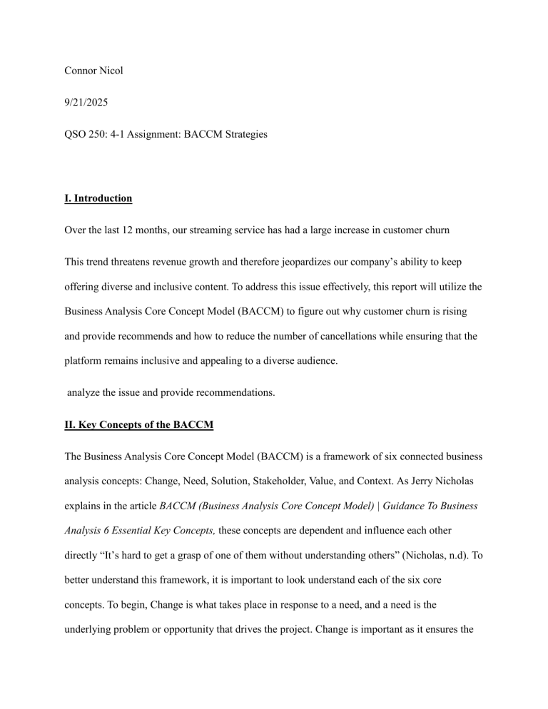 Connor Nicol 9/21/2025 QSO 250: 4-1 Assignment: BACCM Strategies I. Introduction Over the last 12 months, our streaming service has had a large increase in customer churn This trend threatens revenue growth and therefore jeopardizes our company’s ability to keep offering diverse and inclusive content. To address this issue effectively, this report will utilize the Business Analysis Core Concept Model (BACCM) to figure out why customer churn is rising and provide recommends and how to reduce the number of cancellations while ensuring that the platform remains inclusive and appealing to a diverse audience. analyze the issue and provide recommendations. II. Key Concepts of the BACCM The Business Analysis Core Concept Model (BACCM) is a framework of six connected business analysis concepts: Change, Need, Solution, Stakeholder, Value, and Context. As Jerry Nicholas explains in the article BACCM (Business Analysis Core Concept Model) | Guidance To Business Analysis 6 Essential Key Concepts, these concepts are dependent and influence each other directly “It’s hard to get a grasp of one of them without understanding others” (Nicholas, n.d). To better understand this framework, it is important to look understand each of the six core concepts. To begin, Change is what takes place in response to a need, and a need is the underlying problem or opportunity that drives the project. Change is important as it ensures the organization adapts and continues to create value and remain competitive. A need is important as by identifying the real problem, it ensures the project will succeed and lead to improvements. Next, the solution is the steps taken to effectively address the stakeholders’ needs. The solution is important as it is the means of how to resolve the issues and create real change. Stakeholders refers to the individuals or groups who influence the project, which is important as they provide critical feedback and insight to help analysts see if their solution succeeds in fulfilling the stakeholders expectations/guideline. Lastly, the value is the benefit delivered to these stakeholders through the success of the project. Value is important as is it the goal and driving factor for the project. Context regards how the environment shapes the project overall, which is important helps put how needs the are understood, how changes are managed, and how solutions must be designed in a broader perspective. III. Why the BACCM Should Be Used for This Project BACCM should be used for this project as it considers 6 concepts that serve as a structure to efficiently approach the issue and deliver effective solutions. By considering the context, change, stakeholders, value, solutions, and needs of our situation, the framework ensures the issue is identified and solutions are made that align with the goals of the company. For example, by looking at needs, the cause of churn may not simply be limited content but instead issues such as clunky navigation, unreliable streaming, cultural shifts, or maybe a declining target market. Ultimately, BACCM widens the scope and helps leadership to identify the root causes and create effective solutions for guiding leadership decisions on how to reduce churn while maintaining the platform’s commitment to inclusivity. IV. Business Analysis Strategies Needed Multiple business analysis strategies will be needed to address subscriber churn. Since stakeholders shape needs, influence solutions, and define value, one key strategy is analyzing the relationship between stakeholders and their input and influence on project’s outcomes. As Nicholas explains, “The stakeholder is an individual (or a group) that has a relationship to and wants to influence the change, the need, or the solution” (Nicholas, para. 22). This is important as it ensures the real needs of executive leadership are identified while also considering their customers. Another strategy is to clearly define and maintain a project vision. As Blash explains in Project Planning: Vision, “The project vision is an idealistic view of the desired outcome. It helps us stay on task and remain oriented to the business value that's driving the project in the first place” (Blash, 0:18-0:24 ). Applying this to the project, our vision would be to reduce churn while ensuring the platform remains inclusive and appealing to a diverse audience. All in all, this strategy ensures all stakeholders share the same understanding of the project’s purpose and goals. Lastly, communicating findings through effective data visualization is essential. As El-Wakeel, Jiles, and Lawson notes, clear visuals makes data actionable and helps to prevent overwhelming decision-makers, “Data analytics--or simply reporting information--without effective visualization can lead to a great risk of the audience getting ‘lost in the data.’” (Wakeel, Jiles, & Lawson, 2020). This is important as it allows leadership to quickly understand insights such as which subscriber groups are at highest risk of churn. To conclude, these strategies help makesure that the analysis is structured, stakeholder-driven, and clearly communicated, leading to solutions that align with the company’s goals and values. V. Applying the Strategies A. Types of analysis Descriptive analysis can summarize churn trends with averages, counts, and pivot tables. Diagnostic analysis, such as correlations or hypothesis testing, can identify patterns like whether churn is higher among users who watch less diverse content. Predictive analysis, including regression, can forecast churn likelihood based on factors like streaming reliability and navigation ease. B. Types of data C. Types of metrics Key metrics include monthly churn rate, retention rate, average watch time, Net Promoter Score (NPS), and customer satisfaction ratings. These metrics show not only the level of churn but also subscriber engagement and satisfaction. D. Tools needed to process the data Excel’s Data A