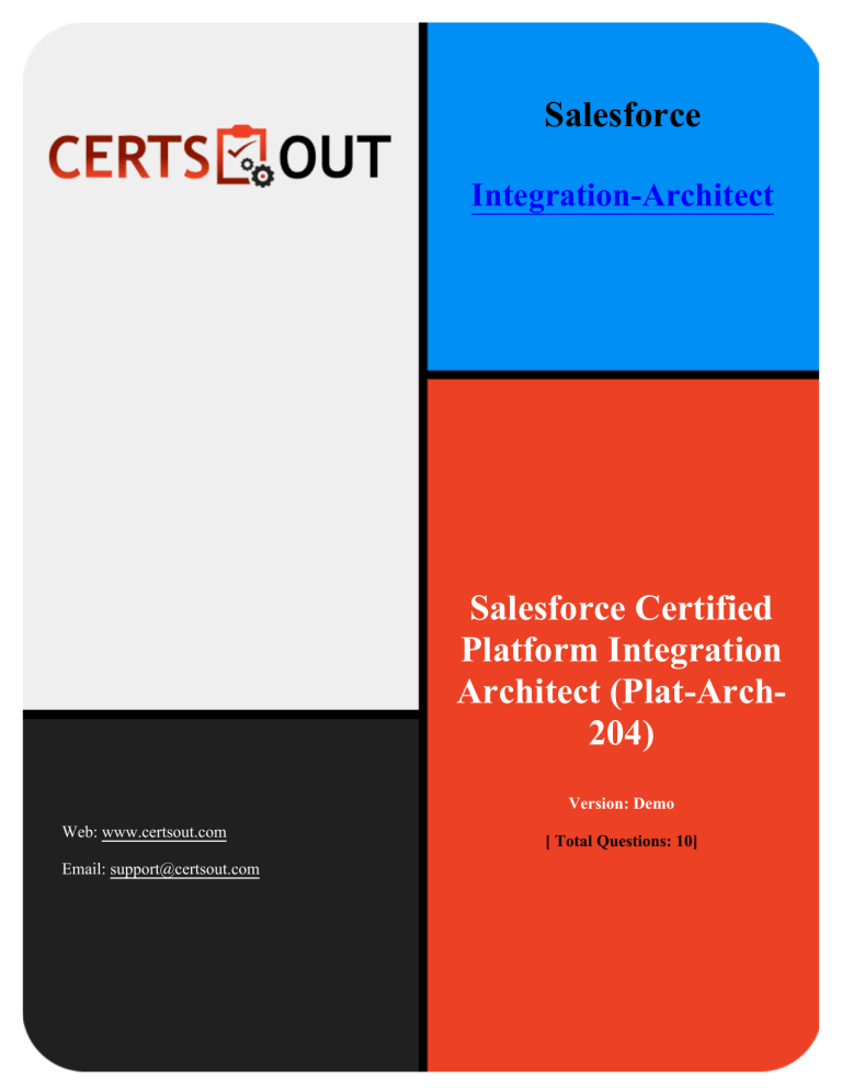 Salesforce Integration-Architect Salesforce Certified Platform Integration Architect (Plat-Arch204) Version: Demo Web: www.certsout.com Email: support@certsout.com [ Total Questions: 10] IMPORTANT NOTICE Feedback We have developed quality product and state-of-art service to ensure our customers interest. If you have any suggestions, please feel free to contact us at feedback@certsout.com Support If you have any questions about our product, please provide the following items: exam code screenshot of the question login id/email please contact us at support@certsout.com and our technical experts will provide support within 24 hours. Copyright The product of each order has its own encryption code, so you should use it independently. Any unauthorized changes will inflict legal punishment. We reserve the right of final explanation for this statement. Certs Exam Salesforce - Integration-Architect Question #:1 An Integration Architect has designed a mobile application for Salesforce users to get data while on the road using a custom UI. The application is securedwith oAuth and is currently functioning well. There is a new requirement where the mobile application needs to obtain the GPS coordinates and storeit on a custom geolocation field. The geolocation field is secured with Field Level Security, so users can view the value without changing it. What should be done to meet the requirement? A. The mobile device makes a SOAP API inbound call.The mobile device receives a REST Apex callout call. B. The mobile device makes a REST API inbound call. C. The mobile devicemakes a REST Apex inbound call. Answer: C Explanation The mobile device should make a REST Apex inbound call to meet the requirement. A REST Apex inbound call allows the mobile device to invoke custom Apex logic on Salesforce using a RESTful interface. The Apex logiccan then access the geolocation field using the user’s OAuth token and update it with the GPS coordinates from the mobile device. The geolocation field is secured with Field Level Security, so the user can view the value without changing it. A SOAP API inbound call or a REST API inbound call would not be able to access the custom geolocation field, as they are not supported by the standard Salesforce objects and fields. Reference: Salesforce Integration Architecture Designer Resource Guide, page 20 Question #:2 A customer is evaluating the Platform Events solution and would like help in comparing/contrasting it with Outbound Messaging for real-time/near real-time needs. They expect 3,000 customers to view messages in Salesforce. What should be evaluated and highlighted when deciding between the solutions? A. In both Platform Events and Outbound Messaging, the event messages are retried by and delivered in sequence, and only once. Salesforce ensures there is no duplicate message delivery. B. Both Platform Events and Outbound Messaging are highly scalable. However, unlike Outbound Messaging, only Platform Events have Event Delivery and Event Publishing limits to be considered. C. Message sequence is possible in Outbound Messaging, but not guaranteed with Platform Events. Both offer very high reliability. Fault handling and recovery are fully handled by Salesforce. Answer: B Pass with Valid Exam Questions Pool 1 of 7 Certs Exam Salesforce - Integration-Architect Question #:3 Acustomer is migrating from an old legacy system to Salesforce. As part of the modernization effort, they would like to integrate al existing systems that currently work with their legacy application with Salesforce. Which three constraints and pain-pointsshould an integration architect consider when choosing the integration pattern/mechanism? Choose 3 answers A. System types - APIs, File systems, Email B. Reporting and usability requirements C. Multi-language and multi-currency requirement D. Error handling mechanisms E. Data Volume and Processing volume Answer: A D E Explanation The system types, the error handling mechanisms, and the data volume and processing volume are three constraints and pain-points that an integration architect should consider when choosingthe integration pattern /mechanism. The system types determine what kind of interfaces and protocols are available or required for the integration, such as APIs, file systems, email, etc. The error handling mechanisms ensure that the integration can handleany failures or exceptions gracefully and provide appropriate logging and notification. The data volume and processing volume affect the performance and scalability of the integration, as well as the choice of synchronous or asynchronous methods. Reference: Salesforce Integration Architecture Designer Resource Guide, page 17 Question #:4 What should an integration architect recommend to ensure all integrations to the Northern Trail Outfitters' company portal use SSL mutual authentication? A. Enable My Domain and SSL/TLS B. Enforce SSL/TLS Mutual Authentication C. Generate a certification authority (CA) signed certificate Answer: B Question #:5 Pass with Valid Exam Questions Pool 2 of 7 Certs Exam Salesforce - Integration-Architect A largeB2C customer is planning to implement Salesforce CRM to become a Customer centric enterprise. Below, is their current system landscape diagram. The goals for implementing Salesforce follows: 1. Develop a360 view of customer 2. Leverage Salesforce capabilities for Marketing, Sales and Service processes 3. Reuse Enterprise capabilities built for Quoting and Order Management processes Which three systems from the current system landscape can be retired withthe implementation of Salesforce? Choose 3 answers A. Order Management System B. Case Management System C. Sales Activity System D. Email Marketing System E. Quoting System Answer: B C D Explanation The three systems from the current system landscape that can beretired with the implementation of Salesforce are Case Management System, Sales Activity System, and Email Marketing System. These systems can be replac