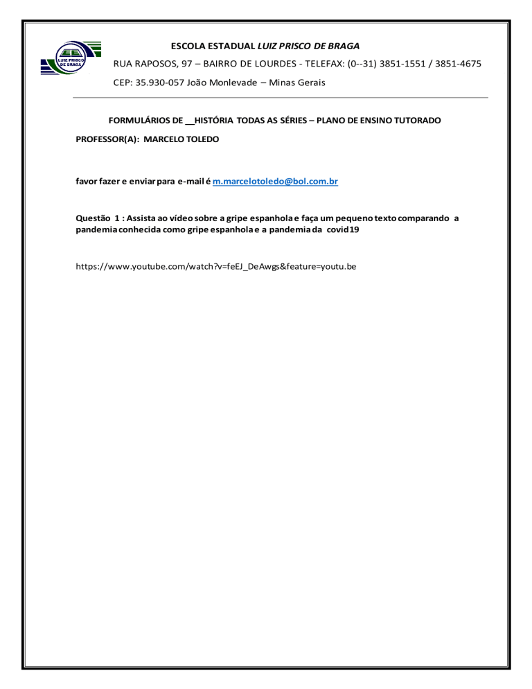 ESCOLA ESTADUAL LUIZ PRISCO DE BRAGA RUA RAPOSOS, 97 – BAIRRO DE LOURDES - TELEFAX: (0--31) 3851-1551 / 3851-4675 CEP: 35.930-057 João Monlevade – Minas Gerais FORMULÁRIOS DE __HISTÓRIA TODAS AS SÉRIES – PLANO DE ENSINO TUTORADO PROFESSOR(A): MARCELO TOLEDO favor fazer e enviar para e-mail é m.marcelotoledo@bol.com.br Questão 1 : Assista ao vídeo sobre a gripe espanhola e faça um pequeno texto comparando a pandemia conhecida como gripe espanhola e a pandemia da covid19 https://www.youtube.com/watch?v=feEJ_DeAwgs&feature=youtu.be