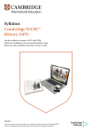 Syllabus Cambridge IGCSE™ History 0470 Use this syllabus for exams in 2027 and 2028. Exams are available in the June and November series. Exams are also available in the March series in India. Version 1 For the purposes of screen readers, any mention in this document of Cambridge IGCSE refers to Cambridge International General Certificate of Secondary Education. Why choose Cambridge? We work with schools worldwide to build an education that shapes knowledge, understanding and skills. Together, we give learners the confidence they need to thrive and make a positive impact in a changing world. As part of the University of Cambridge, we offer a globally trusted and flexible framework for education from age 3 to 19, informed by research, experience, and listening to educators. With recognised qualifications, high-quality resources, comprehensive support and valuable insights, we help schools prepare every student for the opportunities and challenges ahead. Qualifications that are recognised and valued worldwide From the world’s top-ranked universities to local higher education institutions, Cambridge qualifications open doors to a world of opportunities. Setting a global standard With over 160 years of experience in delivering fair, valid and reliable assessments to students worldwide, we offer a global, recognised performance standard for international education. Your path, your way Schools can adapt our curriculum, high-quality teaching and learning resources and flexible assessments to their local context. Our aligned offer helps Cambridge schools support every learner to reach their potential and thrive. Learning with lasting impact Cambridge learners build subject knowledge and conceptual understanding, and develop a broad range of skills, learning habits and attributes to help make them ready for the world. Improving learning outcomes through data-led insight and action Our trusted baseline and diagnostic assessments, together with our insights and evaluation service, help schools turn data into knowledge and actionable insights, to inform teaching decisions and improve learner outcomes. Bringing together a community of experts We bring together the collective knowledge of experts and our diverse community of educators worldwide, supporting them to learn from one another and share ideas and information. Tackling the climate crisis together We believe that education is key to tackling the climate crisis. Together with Cambridge schools, we can empower young people with the skills and knowledge to take action on climate change, helping them be ready for the world. School feedback: ‘We think the Cambridge curriculum is superb preparation for university.’ Feedback from: Christoph Guttentag, Dean of Undergraduate Admissions, Duke University, USA © Cambridge University Press & Assessment September 2024 Cambridge International Education is the name of our awarding body and a part of Cambridge University Press & Assessment, which is a department of the University of Cambridge. Cambridge University Press & Assessment retains the copyright on all its publications. Registered centres are permitted to copy material from this booklet for their own internal use. However, we cannot give permission to centres to photocopy any material that is acknowledged to a third party even for internal use within a centre. Contents Why choose Cambridge?................................................................................................ 2 1 Why choose this syllabus? ......................................................................................... 4 2 Syllabus overview ........................................................................................................ 7 Aims 7 Content overview 8 Assessment overview 9 Assessment objectives 10 3 Subject content ..........................................................................................................11 Core content: Option A 12 Core content: Option B 15 Depth studies 19 4 Details of the assessment......................................................................................... 29 Paper 1 – Structured Questions 29 Paper 2 – Document Questions 29 Component 3 – Coursework 30 Paper 4 – Alternative to Coursework 31 Guidance for centres on coursework 31 Command words 36 5 What else you need to know .................................................................................... 37 Before you start 37 Making entries 38 Accessibility and equality 39 After the exam 40 How students and teachers can use the grades 40 Changes to this syllabus for 2027 and 2028 41 Important: Changes to this syllabus The latest syllabus is version 1, published September 2024. There are no significant changes which affect teaching. Any textbooks endorsed to support the syllabus for examination from 2024 are still suitable for use with this syllabus. www.cambridgeinternational.org/igcse 3 Cambridge IGCSE History 0470 syllabus for 2027 and 2028. 1 Why choose this syllabus? Key benefits Cambridge IGCSE is the world’s most popular international qualification for 14 to 16 year olds, although it can be taken by students at any age. Taught by over 5000 schools in 150 countries, it is tried, tested and trusted. Students can choose from 70 subjects in any combination, including 30 languages. Our programmes promote a thorough knowledge and understanding of a subject and help to develop the skills learners need for their next steps in education or employment. Cambridge IGCSE History offers students the opportunity to study world history in the nineteenth and twentieth centuries. It encourages learners to raise questions and to develop and deploy historical skills, knowledge and understanding in order to provide historical explanations. Learners explore history from a diversity of perspectives, including social, economical, cultural and political. Our approach in Cambridge IGCSE History encourages learners to be: confident, exploring histori