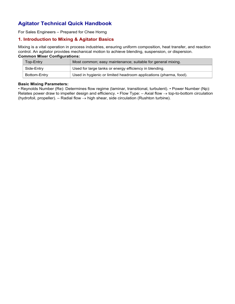 Agitator Technical Quick Handbook For Sales Engineers – Prepared for Chee Horng 1. Introduction to Mixing & Agitator Basics Mixing is a vital operation in process industries, ensuring uniform composition, heat transfer, and reaction control. An agitator provides mechanical motion to achieve blending, suspension, or dispersion. Common Mixer Configurations: Top-Entry Most common; easy maintenance; suitable for general mixing. Side-Entry Used for large tanks or energy efficiency in blending. Bottom-Entry Used in hygienic or limited headroom applications (pharma, food). Basic Mixing Parameters: • Reynolds Number (Re): Determines flow regime (laminar, transitional, turbulent). • Power Number (Np): Relates power draw to impeller design and efficiency. • Flow Type: – Axial flow → top-to-bottom circulation (hydrofoil, propeller). – Radial flow → high shear, side circulation (Rushton turbine). 2. Impeller Types & Applications Impeller Type Flow Pattern Typical Application Propeller / Hydrofoil Axial Low-viscosity liquids, blending, heat transfer Pitched Blade Turbine Mixed General-purpose, solids suspension Rushton Turbine Radial Gas dispersion, high shear Anchor Tangential High viscosity, heat transfer near walls Helical Ribbon Axial (up/down) Very high viscosity (paste, polymer) Impeller Selection Tips: • Choose axial-flow impellers for blending or heat transfer (efficient pumping). • Select radial impellers for gas dispersion or high-shear mixing. • Larger impeller diameter → better flow at lower speed. • Multi-stage impellers for tall tanks or multi-phase mixing. 3. Tank Design, Baffles & Scale-up Tank geometry and baffles directly affect mixing performance. Baffles prevent swirling and improve top-to-bottom circulation. Tank Ratio Typical Range / Guideline Tank Diameter / Impeller Diameter (D/T) 0.3 – 0.5 Liquid Height / Tank Diameter (H/T) 0.8 – 1.2 Baffle Width / Tank Diameter (B/T) 1/10 – 1/12 Impeller Clearance / Tank Diameter (C/T) 0.3 – 0.5 Scale-up Principles: • Maintain constant tip speed or power per volume for similar performance. • Watch for heat transfer and gas dispersion limitations in larger tanks. • Geometric similarity helps predict flow and suspension behavior. 4. Troubleshooting & Performance Optimization Common Mixing Issues and Solutions: Issue Possible Cause Typical Solution Poor suspension Low impeller speed or wrong type Increase speed or use pitched blade turbine Vortex formation No baffles or too high speed Add baffles / reduce speed Dead zones Improper impeller position Adjust impeller height or add second impeller High power draw Oversized impeller or viscous fluid Optimize diameter or use hydrofoil Performance Optimization Tips: • Verify mixing goal before selecting impeller. • Balance energy efficiency and process requirement. • Ensure mechanical seal, bearing, and shaft are aligned. • Monitor vibration and temperature for predictive maintenance. Key Terminologies: Re = ρND²/µ (Reynolds number) → flow regime indicator Np = P / (ρN³Dâ– ) (Power number) → efficiency index Tip Speed = πDN → mixing intensity measure Prepared for Chee Horng Generic Logo Placeholder – Mixing Technology | Generated on 2025-10-10