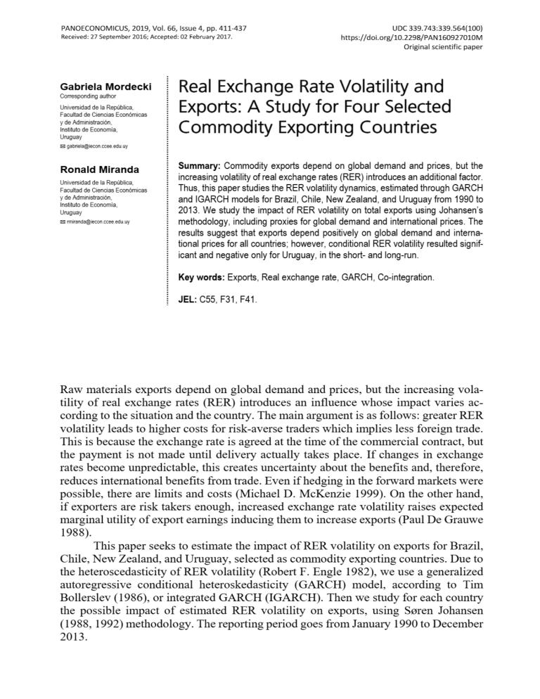 PANOECONOMICUS, 2019, Vol. 66, Issue 4, pp. 411-437 Received: 27 September 2016; Accepted: 02 February 2017. Gabriela Mordecki Corresponding author Universidad de la República, Facultad de Ciencias Económicas y de Administración, Instituto de Economía, Uruguay UDC 339.743:339.564(100) https://doi.org/10.2298/PAN160927010M Original scientific paper Real Exchange Rate Volatility and Exports: A Study for Four Selected Commodity Exporting Countries gabriela@iecon.ccee.edu.uy Ronald Miranda Universidad de la República, Facultad de Ciencias Económicas y de Administración, Instituto de Economía, Uruguay rmiranda@iecon.ccee.edu.uy Summary: Commodity exports depend on global demand and prices, but the increasing volatility of real exchange rates (RER) introduces an additional factor. Thus, this paper studies the RER volatility dynamics, estimated through GARCH and IGARCH models for Brazil, Chile, New Zealand, and Uruguay from 1990 to 2013. We study the impact of RER volatility on total exports using Johansen’s methodology, including proxies for global demand and international prices. The results suggest that exports depend positively on global demand and international prices for all countries; however, conditional RER volatility resulted significant and negative only for Uruguay, in the short- and long-run. Key words: Exports, Real exchange rate, GARCH, Co-integration. JEL: C55, F31, F41. Raw materials exports depend on global demand and prices, but the increasing volatility of real exchange rates (RER) introduces an influence whose impact varies according to the situation and the country. The main argument is as follows: greater RER volatility leads to higher costs for risk-averse traders which implies less foreign trade. This is because the exchange rate is agreed at the time of the commercial contract, but the payment is not made until delivery actually takes place. If changes in exchange rates become unpredictable, this creates uncertainty about the benefits and, therefore, reduces international benefits from trade. Even if hedging in the forward markets were possible, there are limits and costs (Michael D. McKenzie 1999). On the other hand, if exporters are risk takers enough, increased exchange rate volatility raises expected marginal utility of export earnings inducing them to increase exports (Paul De Grauwe 1988). This paper seeks to estimate the impact of RER volatility on exports for Brazil, Chile, New Zealand, and Uruguay, selected as commodity exporting countries. Due to the heteroscedasticity of RER volatility (Robert F. Engle 1982), we use a generalized autoregressive conditional heteroskedasticity (GARCH) model, according to Tim Bollerslev (1986), or integrated GARCH (IGARCH). Then we study for each country the possible impact of estimated RER volatility on exports, using Søren Johansen (1988, 1992) methodology. The reporting period goes from January 1990 to December 2013. )SVP 339.743: 339.564 (100 https://doi.org/10.2298/PAN160927010M الورقة العلمية الأصلية ، PANOECONOMICUS ، 2019المجلد ، 66العدد ، 4ص 437-411 تاريخ الاستلام 27 :سبتمبر .2016تاريخ القبول 02 :فبراير .2017 تقلب أسعار الصرف الحقيقية والصادرات :دراسة لأربعة بلدان مصدرة سلع مختارة غابرييلا مورديكي المؤلف المراسل جامعة الجمهورية ،كلية العلوم الاقتصادية والإدارة ،معهد الاقتصاد، أوروغواي gabriela@iecon.ccee.edu.uy ملخص :تعتمد صادرات السلع الأساسية على الطلب والأسعار العالميين ،لكن التقلبات المتزايدة في أسعار الصرف الحقيقية تقدم عاملا إضافيا .وبالتالي ،تدرس هذه الورقة ديناميكيات تقلب ، RERالمقدرة من خلال نماذج GARCHو IGARCH للبرازيل وتشيلي ونيوزيلندا وأوروغواي من 1990إلى .2013ندرس تأثير تقلب RER على إجمالي الصادرات باستخدام منهجية ، Johansenبما في ذلك وكلاء الطلب العالمي والأسعار الدولية .وتشير النتائج إلى أن الصادرات تعتمد بشكل إيجابي على الطلب العالمي والأسعار الدولية لجميع البلدان .غير أن التقلبات المشروطة في حالات التتبع السريع لم تسفر عن ذلك بشكل كبير وسلبي إلا بالنسبة لأوروغواي ،في الأجلين القصير والطويل. رونالد ميراندا جامعة الجمهورية ،كلية العلوم الاقتصادية والإدارة ،معهد الاقتصاد، أوروغواي rmiranda@iecon.ccee.edu.uy الكلمات المفتاحية :الصادرات ،سعر الصرف الحقيقي ،GARCH ،التكامل المشترك. علامة.C55 ، F31 ، F41 : تعتمد صادرات المواد الخام على الطلب واألسعار العالميين ،لكن التقلب المتزايد ألسعار الصرف الحقيقية ( )RERيدخل تأثيرا يختلف تأثيره وفقا للحالة والبلد .الحجة الرئيسية هي كما يلي :يؤدي التقلب األكبر في RERإلى ارتفاع التكاليف للمتداولين الذين يكرهون المخاطرة مما يعني انخفاض التجارة الخارجية .وذلك ألن سعر الصرف يتم االتفاق عليه في وقت العقد التجاري ،ولكن ال يتم الدفع حتى يتم التسليم الفعلي .إذا أصبحت التغيرات في أسعار الصرف غير متوقعة ،فإن هذا يخلق حالة من عدم اليقين بشأن الفوائد وبالتالي يقلل من الفوائد الدولية من التجارة .حتى لو كان التحوط في