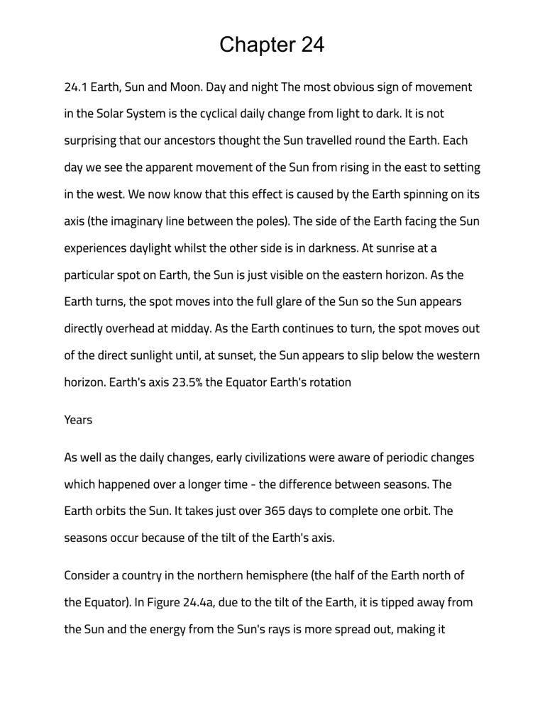 Chapter 24 24.1 Earth, Sun and Moon. Day and night The most obvious sign of movement in the Solar System is the cyclical daily change from light to dark. It is not surprising that our ancestors thought the Sun travelled round the Earth. Each day we see the apparent movement of the Sun from rising in the east to setting in the west. We now know that this effect is caused by the Earth spinning on its axis (the imaginary line between the poles). The side of the Earth facing the Sun experiences daylight whilst the other side is in darkness. At sunrise at a particular spot on Earth, the Sun is just visible on the eastern horizon. As the Earth turns, the spot moves into the full glare of the Sun so the Sun appears directly overhead at midday. As the Earth continues to turn, the spot moves out of the direct sunlight until, at sunset, the Sun appears to slip below the western horizon. Earth's axis 23.5% the Equator Earth's rotation Years As well as the daily changes, early civilizations were aware of periodic changes which happened over a longer time - the difference between seasons. The Earth orbits the Sun. It takes just over 365 days to complete one orbit. The seasons occur because of the tilt of the Earth's axis. Consider a country in the northern hemisphere (the half of the Earth north of the Equator). In Figure 24.4a, due to the tilt of the Earth, it is tipped away from the Sun and the energy from the Sun's rays is more spread out, making it Chapter 24 colder. This means that area receives fewer hours of sunlight. These countries are experiencing winter. In Figure 24.4c, the northern hemisphere is tipped towards the Sun, so it receives longer hours of more direct sunlight. These countries are experiencing summer. Countries at the Equator do not experience seasons because the Sun's rays always hit them at the same angle. The seasonal differences are more apparent the further from the Equator you are. In the far north or south, seasons are so extreme that, in winter, the Sun is hardly seen and, in summer, it can be sunny at midnight. Months The most obvious object in our sky after the Sun is the Moon. The Moon features in many folk tales. It has often been seen as a mystical object due to its fainter light and its changing shape. With the benefit of telescopes and space travel, we know the Moon is a rocky sphere which we only see when it reflects light from the Sun. The Moon orbits Earth every 27.5 days. Its position relative to Earth changes the way it appears to us as different parts of it are illuminated by the Sun. This causes the changes called the phases of the Moon. The phases of the Moon. As the Moon orbits the Earth, the half of the Moon that faces the Sun will be lit up by the Sun. As the Moon moves, the shape of the light part, which can be seen from the Earth, changes. The outer circle of Moon diagrams shows how the Moon looks to an observer on Earth. Chapter 24 The Solar System consists of the Sun which is our star, and all the objects which orbit it. It includes the following: • There are eight planets: Mercury, Venus, Earth, Mars, Jupiter, Saturn, Uranus and Neptune. • There are minor planets, such as Pluto and Eris. In 2014, the International Astronomical Union recognised five dwarf planets but it is believed there are more than 200 in all. • Moons that orbit planets and dwarf planets. • Millions of asteroids and meteoroids: these are rocky objects which are smaller than planets. Most asteroids are found in the asteroid belt between the orbits of Mars and Jupiter. • Comets, which are often described as giant snowballs, orbit the Sun in very irregular orbits. When they are furthest from the Sun, they are frozen balls of gas, rock and dust. As they get nearer to the Sun they heat up and leave a trail of dust and gases behind them. (Note: this trail of dust is not the tail of the comet; the tail always points away from the Sun, so could actually be at 90° to the motion of the comet.) The Sun's gravitational pull Chapter 24 The orbits of the planets are almost circular. To move in a circle an object needs a force pulling it towards the centre of the circle. Imagine spinning a ball on the end of a piece of string. The ball will spin in a circle as long as you hold on. Once you let go, the ball will fly outwards. The force needed to keep the planets orbiting the Sun comes from the gravitational attraction of the Sun. The formation of the planets Evidence collected by astronomers suggests that the planets were formed at the same time as the Sun. The Solar System began as a nebula, which is a huge swirling ball of dust and gas. Most of this gas was hydrogen, but there were also other elements formed by fusion in other stars, which had exploded at the end of their life cycle, sending their contents out into the clouds of interstellar gas. As gravity pulled this mass together, the centre formed a star. You will learn more detail about this in Chapter 25. The planets formed from the materials of the nebula which were not pulled into the Sun. The spinning motion of the dust and gas formed a flat, spinning ring disc known as an accretion disc. Gravity pulled dust and gas together so they joined to make rocks which then join to make larger rocks. The process of the dust and gas being pulled together by gravity is called accretion and it led to the formation of the inner, rocky planets. The intense heat forced some of the lighter materials further away and these formed the outer planets - the gas giants. The four Chapter 24 inner planets, Mercury, Venus, Earth and Mars, are small and rocky. After Mars there is the asteroid belt. This is made up of left-over pieces of rock. The outer four planets, Jupiter, Saturn, Uranus and Neptune, are huge balls of gases. These planets are much bigger than the inner planets. Distances in the Solar System are almost unimaginably big. The Earth is approximately 150 million kilometres from the Sun. This is similar to circling the Earth 4000 times.