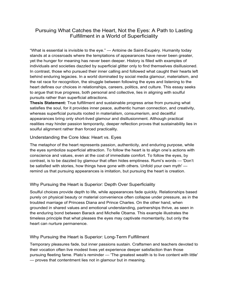 Pursuing What Catches the Heart, Not the Eyes: A Path to Lasting Fulfillment in a World of Superficiality “What is essential is invisible to the eye.” — Antoine de Saint-Exupéry. Humanity today stands at a crossroads where the temptations of appearances have never been greater, yet the hunger for meaning has never been deeper. History is filled with examples of individuals and societies dazzled by superficial glitter only to find themselves disillusioned. In contrast, those who pursued their inner calling and followed what caught their hearts left behind enduring legacies. In a world dominated by social media glamour, materialism, and the rat race for recognition, the struggle between following the eyes and listening to the heart defines our choices in relationships, careers, politics, and culture. This essay seeks to argue that true progress, both personal and collective, lies in aligning with soulful pursuits rather than superficial attractions. Thesis Statement: True fulfillment and sustainable progress arise from pursuing what satisfies the soul, for it provides inner peace, authentic human connection, and creativity, whereas superficial pursuits rooted in materialism, consumerism, and deceitful appearances bring only short-lived glamour and disillusionment. Although practical realities may hinder passion temporarily, deeper reflection proves that sustainability lies in soulful alignment rather than forced practicality. Understanding the Core Idea: Heart vs. Eyes The metaphor of the heart represents passion, authenticity, and enduring purpose, while the eyes symbolize superficial attraction. To follow the heart is to align one’s actions with conscience and values, even at the cost of immediate comfort. To follow the eyes, by contrast, is to be dazzled by glamour that often hides emptiness. Rumi’s words — 'Don’t be satisfied with stories, how things have gone with others. Unfold your own myth' — remind us that pursuing appearances is imitation, but pursuing the heart is creation. Why Pursuing the Heart is Superior: Depth Over Superficiality Soulful choices provide depth to life, while appearances fade quickly. Relationships based purely on physical beauty or material convenience often collapse under pressure, as in the troubled marriage of Princess Diana and Prince Charles. On the other hand, when grounded in shared values and emotional understanding, partnerships thrive, as seen in the enduring bond between Barack and Michelle Obama. This example illustrates the timeless principle that what pleases the eyes may captivate momentarily, but only the heart can nurture permanence. Why Pursuing the Heart is Superior: Long-Term Fulfillment Temporary pleasures fade, but inner passions sustain. Craftsmen and teachers devoted to their vocation often live modest lives yet experience deeper satisfaction than those pursuing fleeting fame. Plato’s reminder — 'The greatest wealth is to live content with little' — proves that contentment lies not in glamour but in meaning. Why Pursuing the Heart is Superior: Resistance to Manipulation The eyes are easily deceived by advertising and propaganda, while the heart resists manipulation. Populist leaders win temporary applause with glamour and spectacle, but citizens who align with justice and truth sustain democracy against tyranny. The resilience of democratic institutions in societies such as South Africa owes to people who listened to their hearts rather than appearances. Why Pursuing the Heart is Superior: Authentic Identity The heart nurtures authenticity. Individuals who embrace their true identities, whether in career or personal life, live freer than those who hide behind conformity. The global LGBTQ+ movement exemplifies this courage, as countless individuals chose authentic love and identity over deceitful appearances, thereby enriching human society with diversity and truth. Why Pursuing the Heart is Superior: Ethical Integrity Ethical integrity springs from the heart. Lawyers, activists, and social workers who dedicate their careers to justice often earn less than corporate professionals, yet they command respect and fulfill their conscience. Mark Twain once quipped that 'Clothes make the man,' but he himself embodied the opposite lesson: appearances matter only briefly, while substance endures across generations. Why Pursuing the Heart is Superior: Innovation from Passion Groundbreaking innovation is born of passion, not glamour. Elon Musk pursued space exploration and sustainable energy despite mockery, ultimately transforming global industries. Steve Jobs similarly observed: 'Innovation distinguishes between a leader and a follower.' These innovations demonstrate that appearances may create temporary hype, but passion-driven vision creates revolutions. Why Pursuing the Heart is Superior: Resilience in Adversity Heart-driven choices provide strength in hardship. Nelson Mandela endured 27 years in prison for his belief in justice, proving Nietzsche’s saying: 'He who has a why to live can bear almost any how.' By contrast, those chasing appearances lack the resilience to endure adversity, collapsing when glamour fades. Why Pursuing the Heart is Superior: Social Progress through Passion Movements rooted in heartfelt passion, like the Civil Rights Movement in the U.S., brought lasting change because people pursued justice rather than political convenience. True social progress has never been the product of superficiality; it has always been the fruit of sacrifice, passion, and heart-led vision. Why Pursuing the Heart is Superior: Preservation of Culture Consumerism erases traditions, while soulful pursuits preserve them. Indigenous communities worldwide who fight to protect their languages and rituals exemplify the heart’s resistance to materialism. In preserving identity against shallow global glamour, they secure heritage for future generations. Why Pursuing the Heart is Superior: Human Connection Over Charm True lea