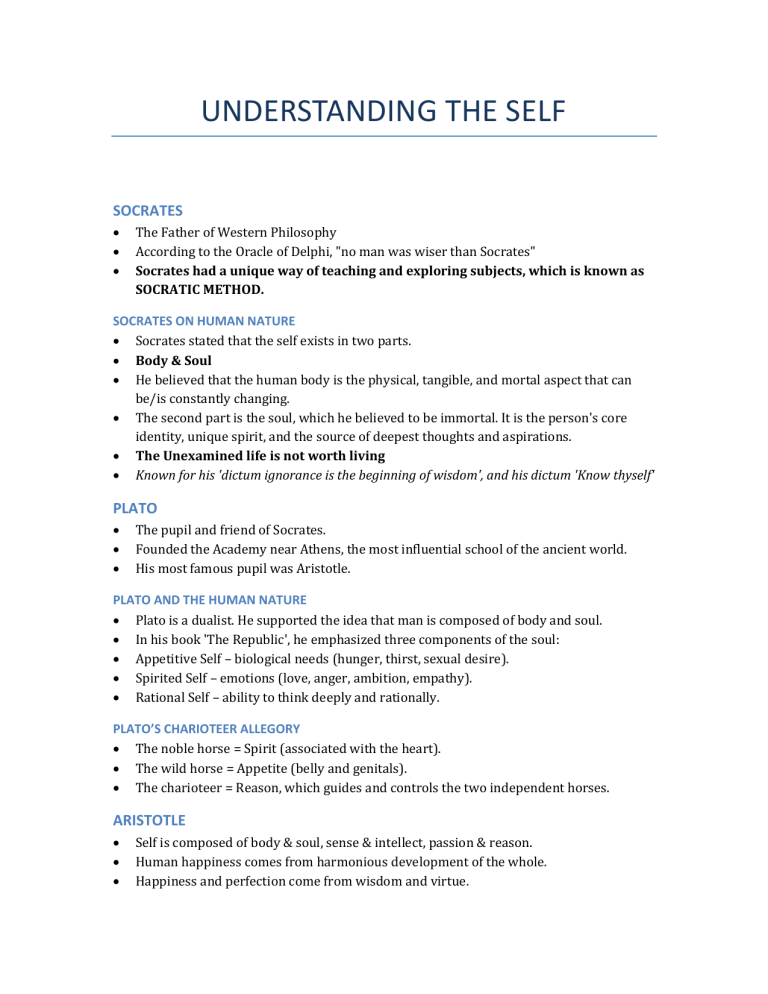 UNDERSTANDING THE SELF LESSON 1: THE WESTERN PHILOSOPHICAL PERSPECTIVES SOCRATES The Father of Western Philosophy According to the Oracle of Delphi, "no man was wiser than Socrates" Socrates had a unique way of teaching and exploring subjects, which is known as SOCRATIC METHOD. SOCRATES ON HUMAN NATURE Socrates stated that the self exists in two parts. Body & Soul He believed that the human body is the physical, tangible, and mortal aspect that can be/is constantly changing. The second part is the soul, which he believed to be immortal. It is the person's core identity, unique spirit, and the source of deepest thoughts and aspirations. The Unexamined life is not worth living Known for his 'dictum ignorance is the beginning of wisdom', and his dictum 'Know thyself' PLATO The pupil and friend of Socrates. Founded the Academy near Athens, the most influential school of the ancient world. His most famous pupil was Aristotle. PLATO AND THE HUMAN NATURE Plato is a dualist. He supported the idea that man is composed of body and soul. In his book 'The Republic', he emphasized three components of the soul: Appetitive Self – biological needs (hunger, thirst, sexual desire). Spirited Self – emotions (love, anger, ambition, empathy). Rational Self – ability to think deeply and rationally. PLATO’S CHARIOTEER ALLEGORY The noble horse = Spirit (associated with the heart). The wild horse = Appetite (belly and genitals). The charioteer = Reason, which guides and controls the two independent horses. ARISTOTLE Self is composed of body & soul, sense & intellect, passion & reason. Human happiness comes from harmonious development of the whole. Happiness and perfection come from wisdom and virtue. Taught the theory of Golden Mean (to live life in moderation). ST. AUGUSTINE OF HIPPO Unlike ancient western philosophers, he emphasized the concept of self in the context of relation to God. Happiness is the end-all and be-all of human living, found only in God. Quote: "You have made our hearts for You, O God and so they will find rest only in You". He also taught virtue, and virtue is "the order of love".