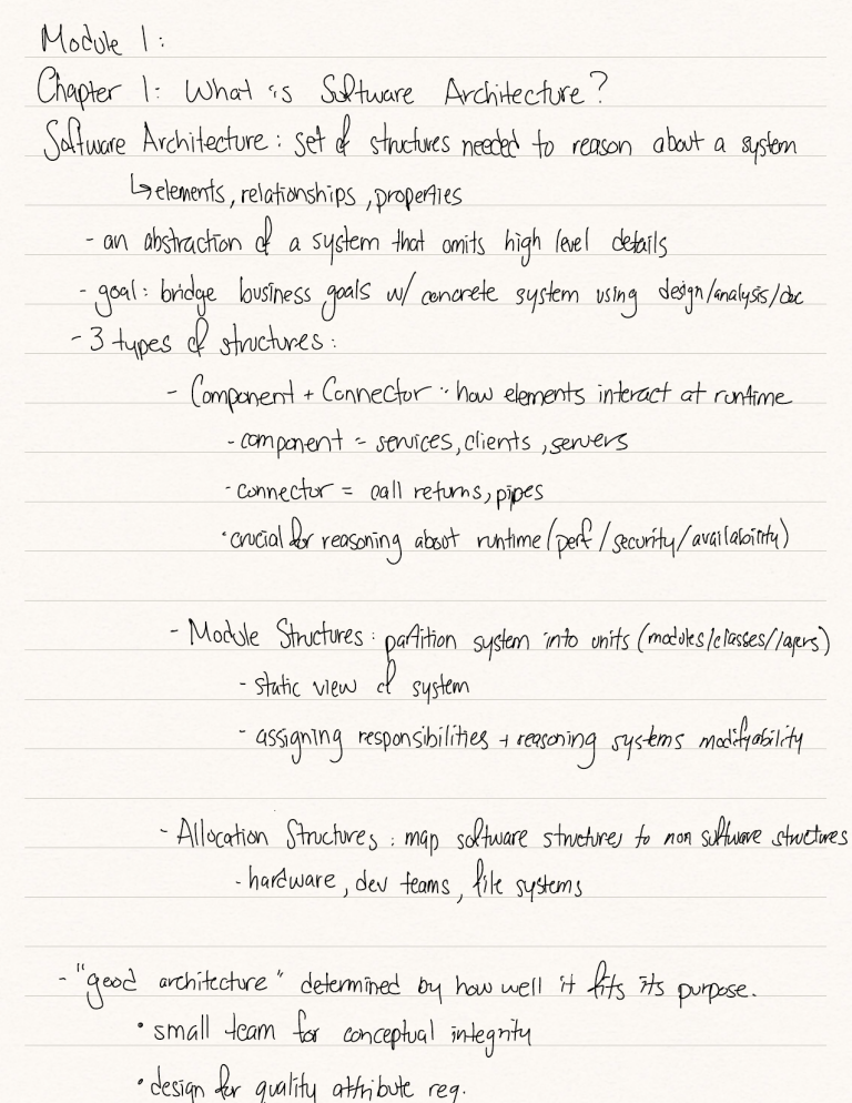 Problem: Segmenting software for independent development, modifiability, and reuse with minimal interaction between parts. Solution: Divides software into layers (e.g., presentation, business, persistence, database). Each layer has specific roles and responsibilities. Closed layers: Requests must pass through each layer directly below. Open layers: Requests can skip layers. Weakness: Can lead to performance penalties; adds up-front cost and complexity. Usages: Small, simple applications or websites, projects with tight budgets and time constraints. Multi-Tier Pattern Context: Distributing a system's infrastructure into distinct subsets. Problem: Splitting a system into computationally independent execution structures (software and hardware groups). Solution: Organizes the system into tiers, which are logical groupings of components. Weakness: Substantial up-front cost and complexity. Usages: Distributed systems. Pipe and Filter Context: Systems that transform streams of discrete data, with a need for reusable, independent transformation parts. Problem: Dividing systems into reusable, loosely coupled components with simple, generic interaction mechanisms for flexible combination and parallel execution. Solution: Uses pipes (unidirectional, point-to-point communication channels) to connect filters. Filters: Producer (source): Starts a process. Transformer (map): Modifies data. •Tester (reduce): Checks criteria. •Consumer (sink): Terminates a process. Weakness: Not ideal for interactive systems; excessive parsing/unparsing can degrade performance and increase filter complexity. Usages: Simple, one-way data processing tasks (e.g., EDI, ETL tools, compilers). Client-Server Context: Many distributed clients needing to access shared resources and services with controlled access. Problem: Managing shared resources and services to promote modifiability, reuse, scalability, and availability. Solution: Clients send requests to a server, which processes them and sends replies. Weakness: Server can be a performance bottleneck and a single point of failure; decisions about functionality placement can be complex and costly to change. Usages: Online applications like email, document sharing, and banking. Model-View-Controller (MVC) Context: Interactive applications where the user interface is frequently modified and multiple views of data are needed. Problem: Separating UI functionality from application functionality while remaining responsive to user input or data changes; coordinating multiple UI views. Solution: Separates application functionality into three components: Model: Contains the application's data. View: Displays a portion of data and interacts with the user. Controller: Mediates between the model and view, managing state change notifications. Weakness: May be overly complex for simple UIs; abstractions might not fit all UI toolkits well. Usages: Common in web and mobile application user interface development. Event-Driven Architecture Context: Providing computational and information resources to handle incoming independent asynchronous application-generated events at scale. Problem: Constructing distributed systems that can service asynchronous event-related messages and scale from small to complex. Solution: Deploys independent event processes/processors to handle events. Arriving events are queued, and a scheduler distributes them to appropriate handlers. Weakness: Performance and error recovery can be challenges. Usages: E-commerce applications (e.g., order creation publishing events like "OrderCreated," "Credit Reserved," or "CreditLimitExceeded"). Microservices Architecture Context: Deploying server-based enterprise applications supporting various clients and handling requests via business logic, databases, and messaging. Problem: Monolithic applications becoming too large and complex for efficient support and optimal distributed resource utilization (especially in cloud environments). Solution: Builds applications as suites of small, independent services. Each service is: • Independently deployable and scalable. • Has its own API boundary. • Can be written in different programming languages. • Manages its own database. • Developed by different teams. Weakness: Systems must be designed to tolerate service failures (requires more monitoring); increased overhead for service choreography and event collaboration; higher memory usage. Usages: Use cases with extensive data pipelines, such as reporting systems where each step (data collection, cleansing, aggregation) is handled by a separate microservice